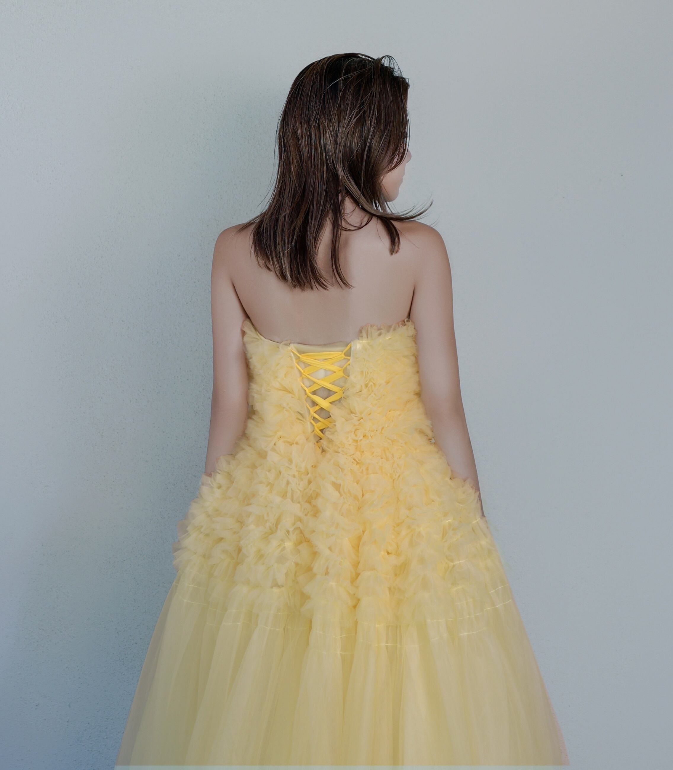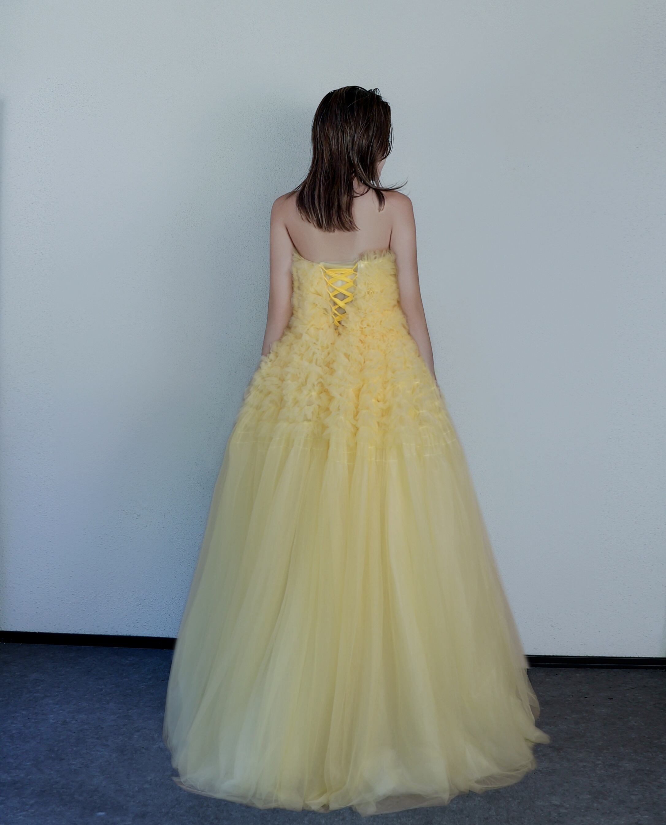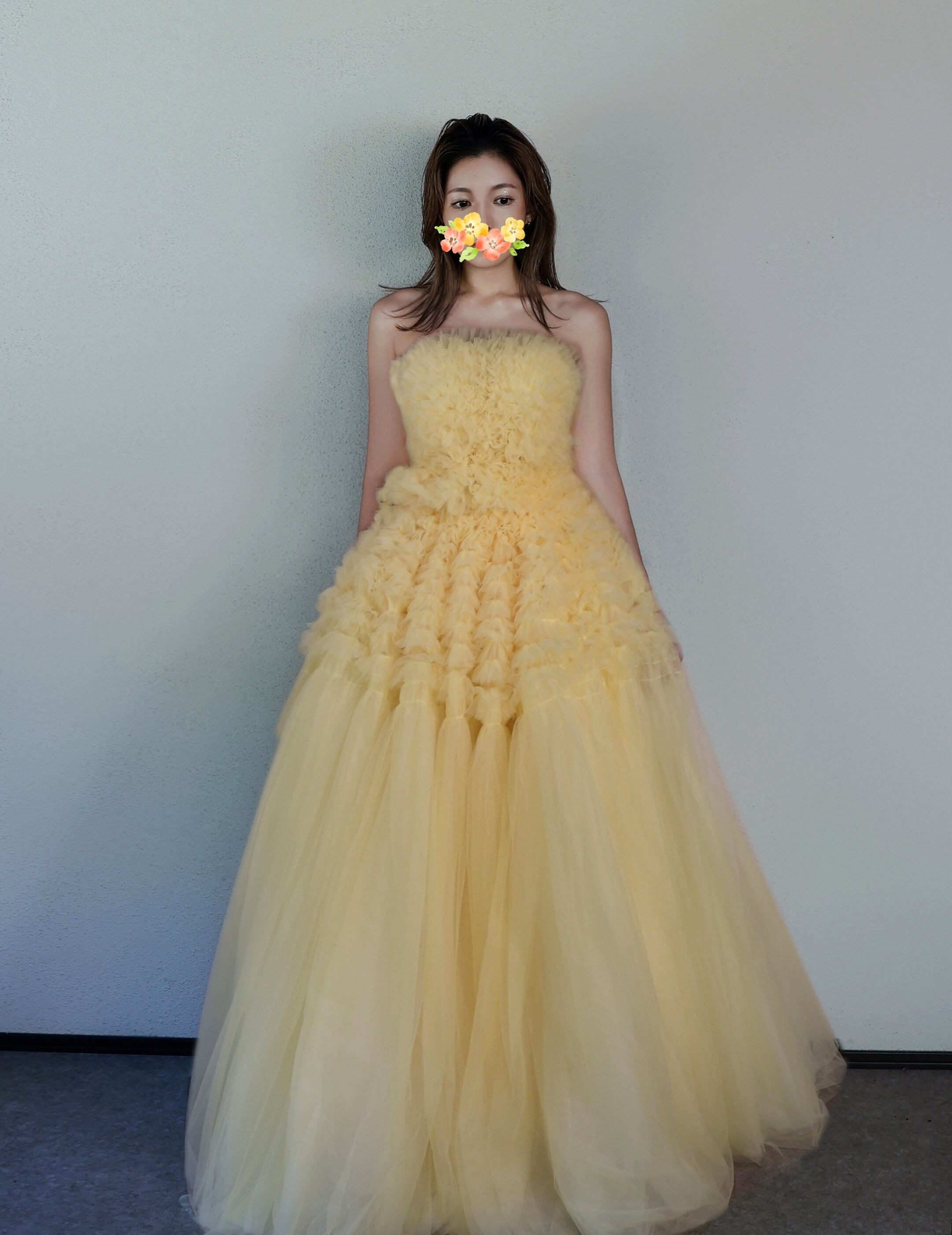 カラードレス イエロー デザイン感 ベアトップ もこもこドレス 床付く 編み上げ 披露宴/結婚式