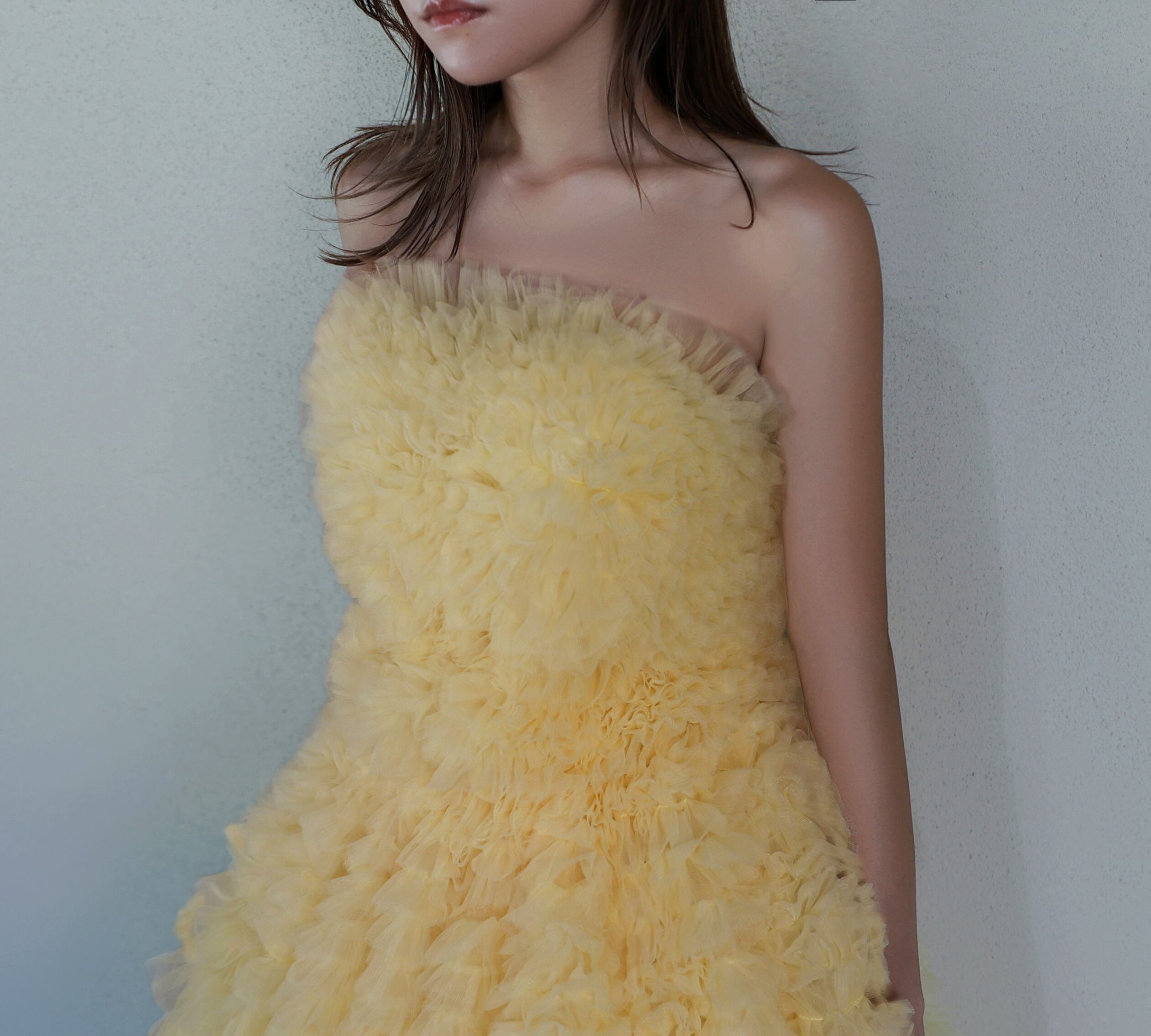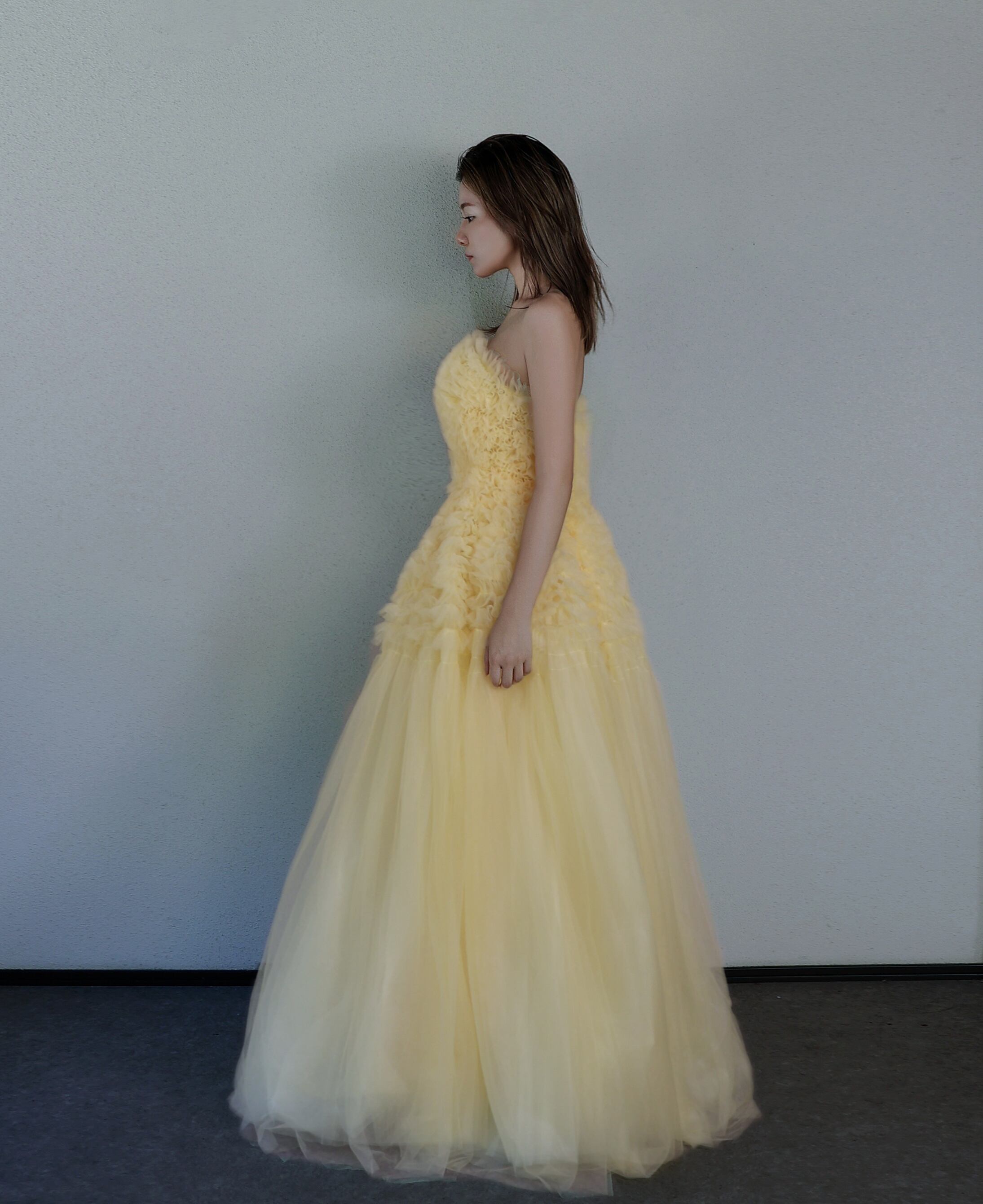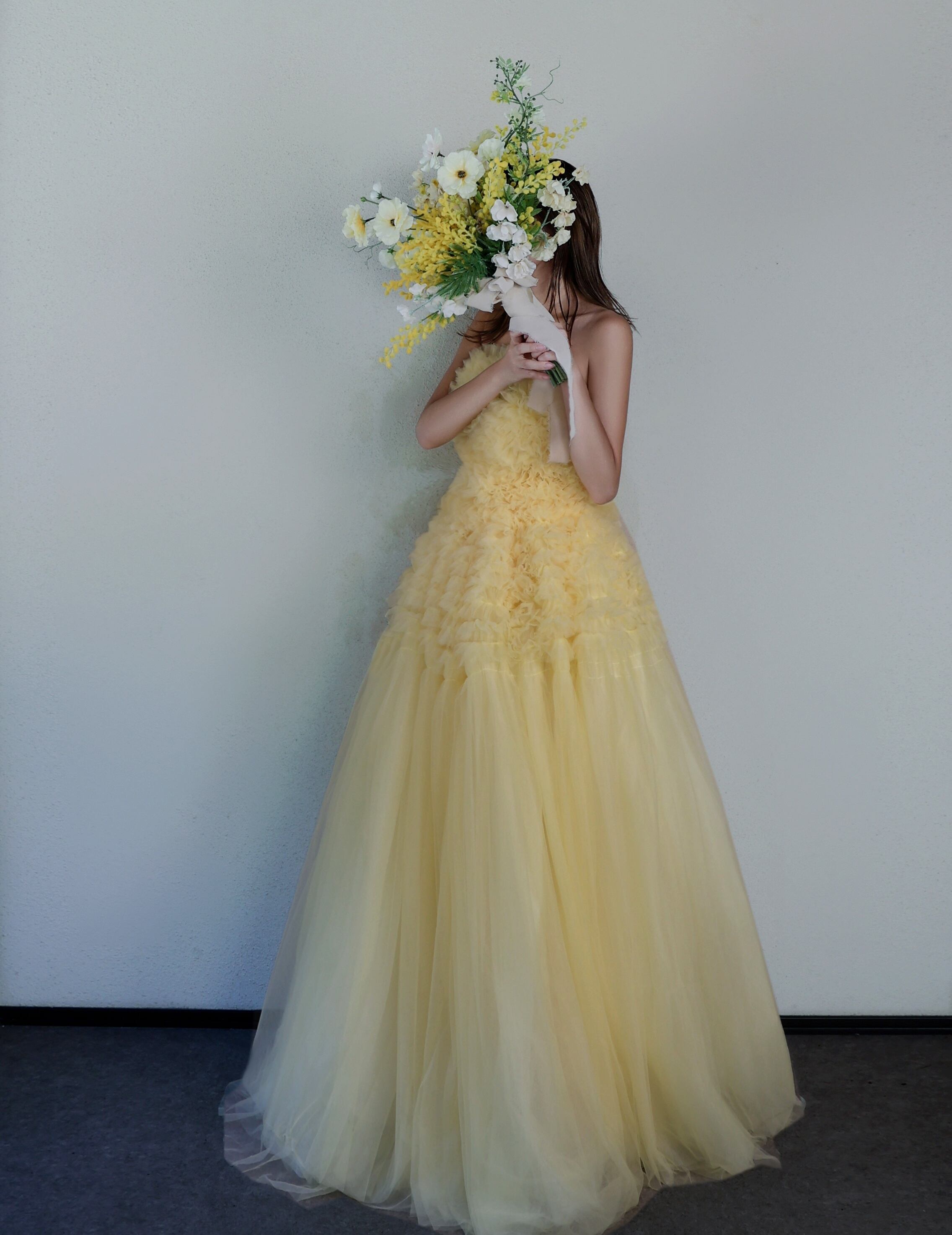 カラードレス イエロー デザイン感 ベアトップ もこもこドレス 床付く 編み上げ 披露宴/結婚式
