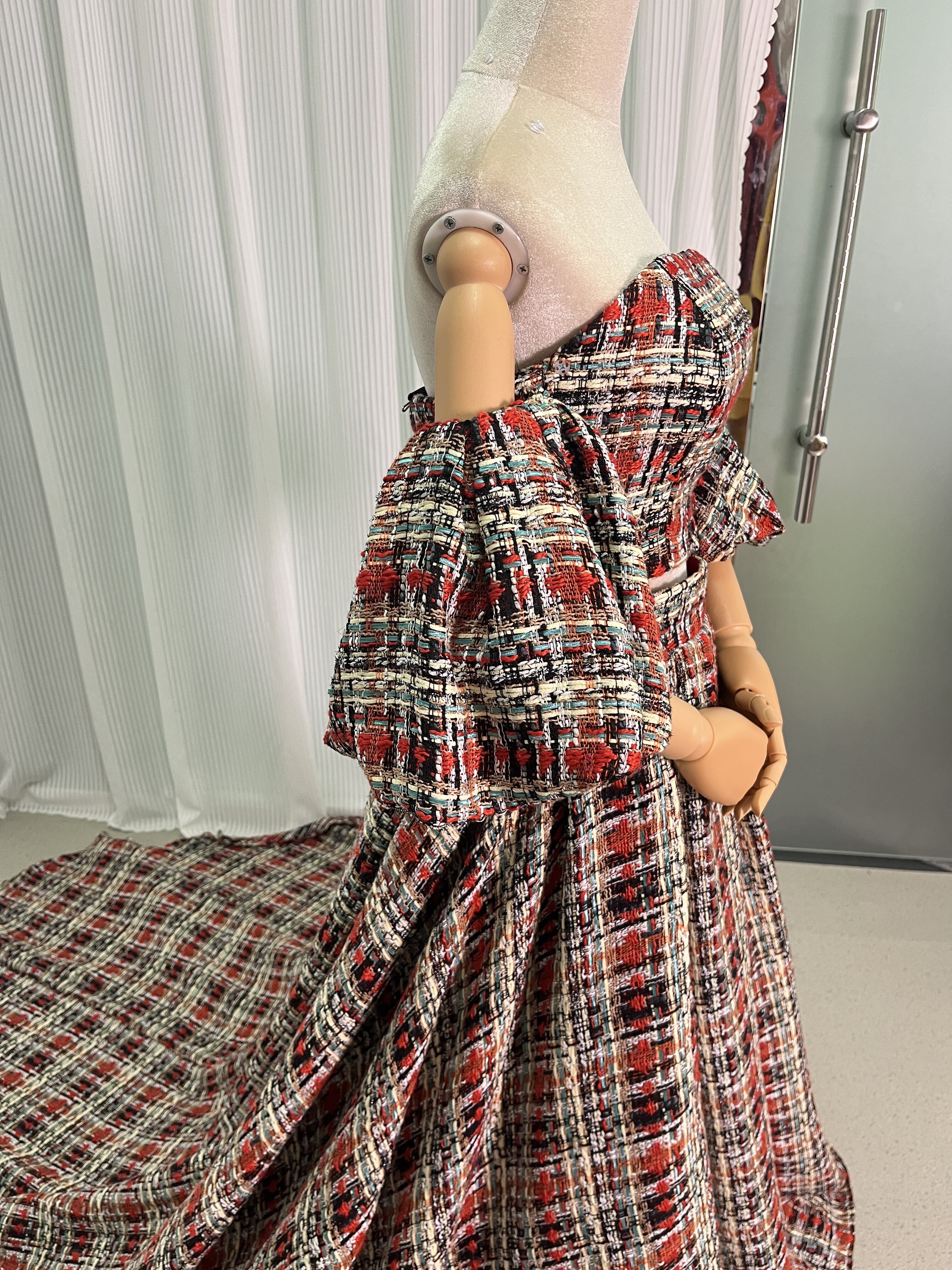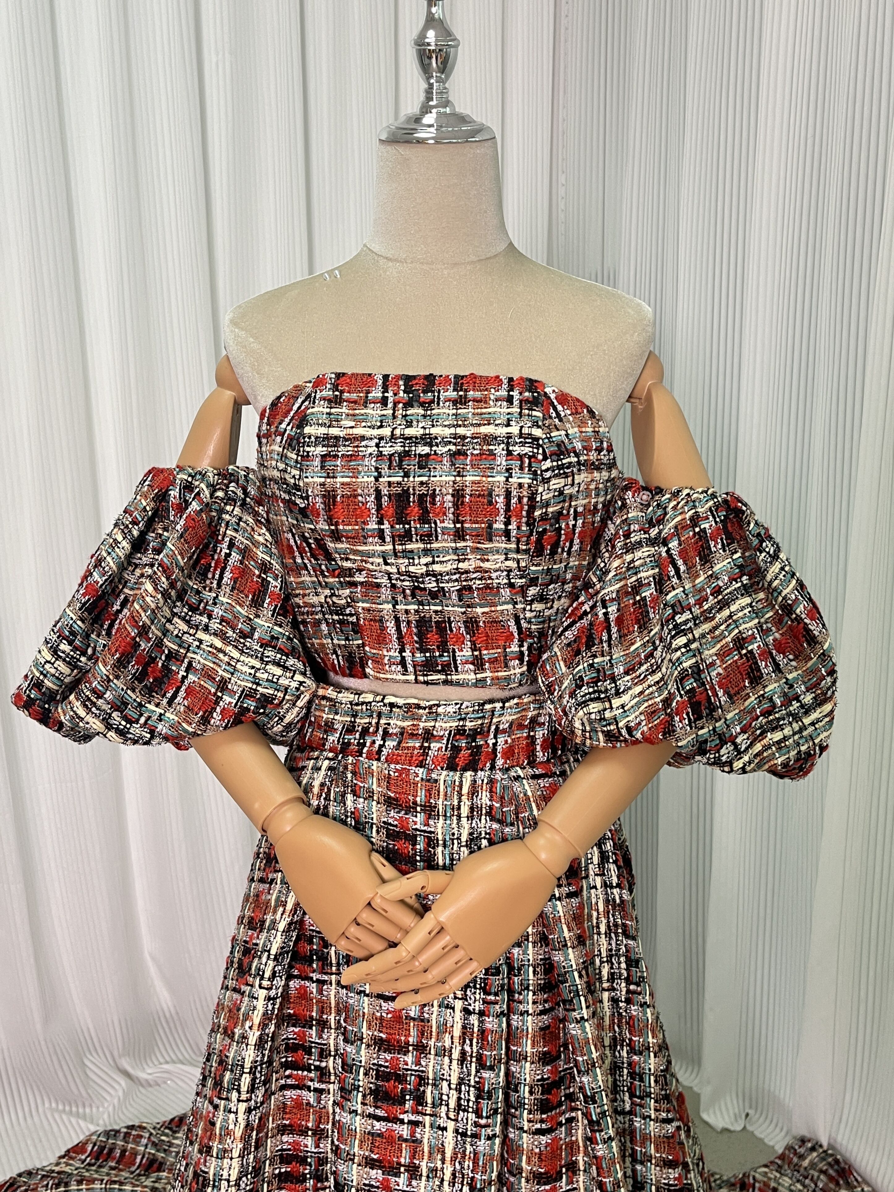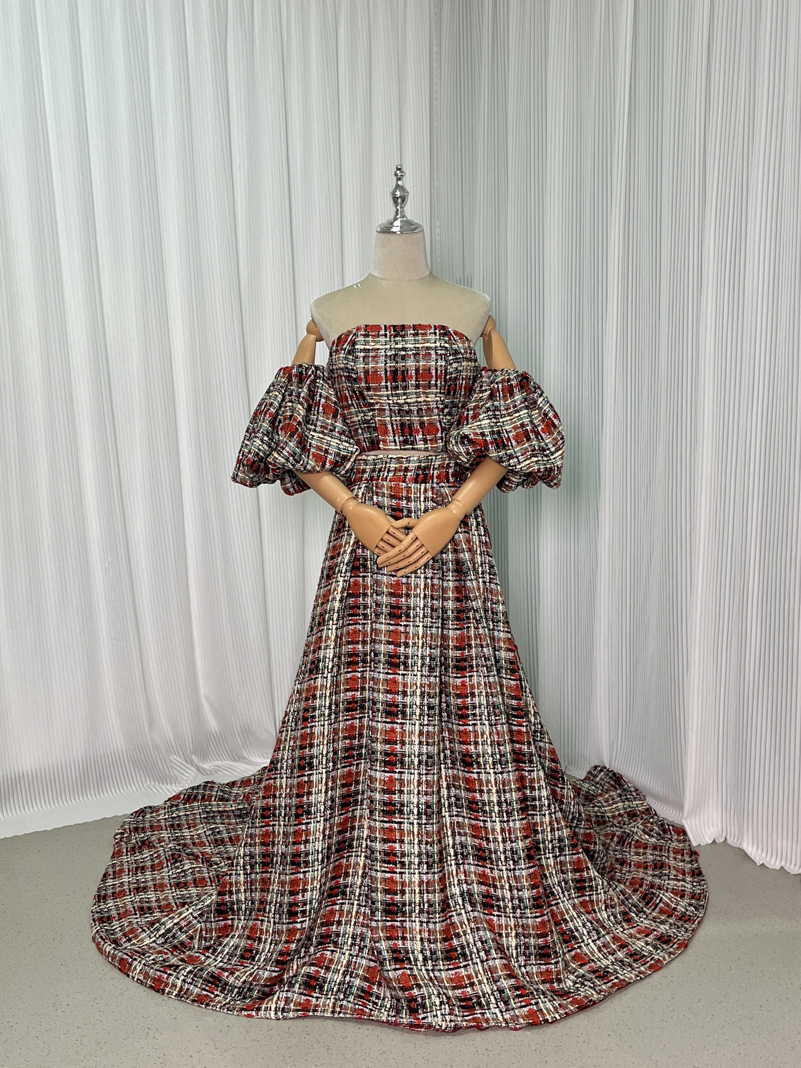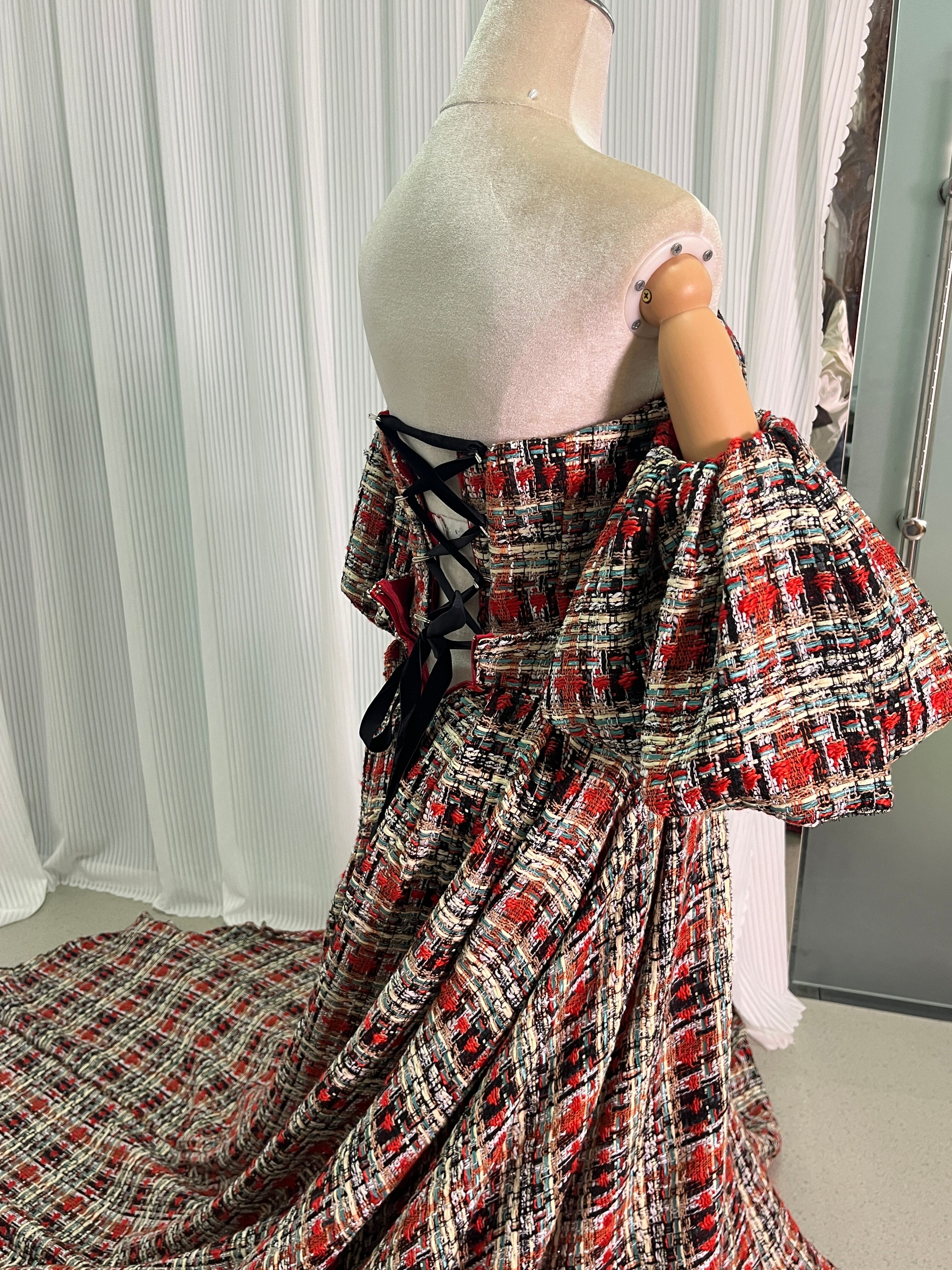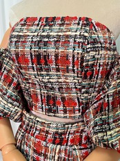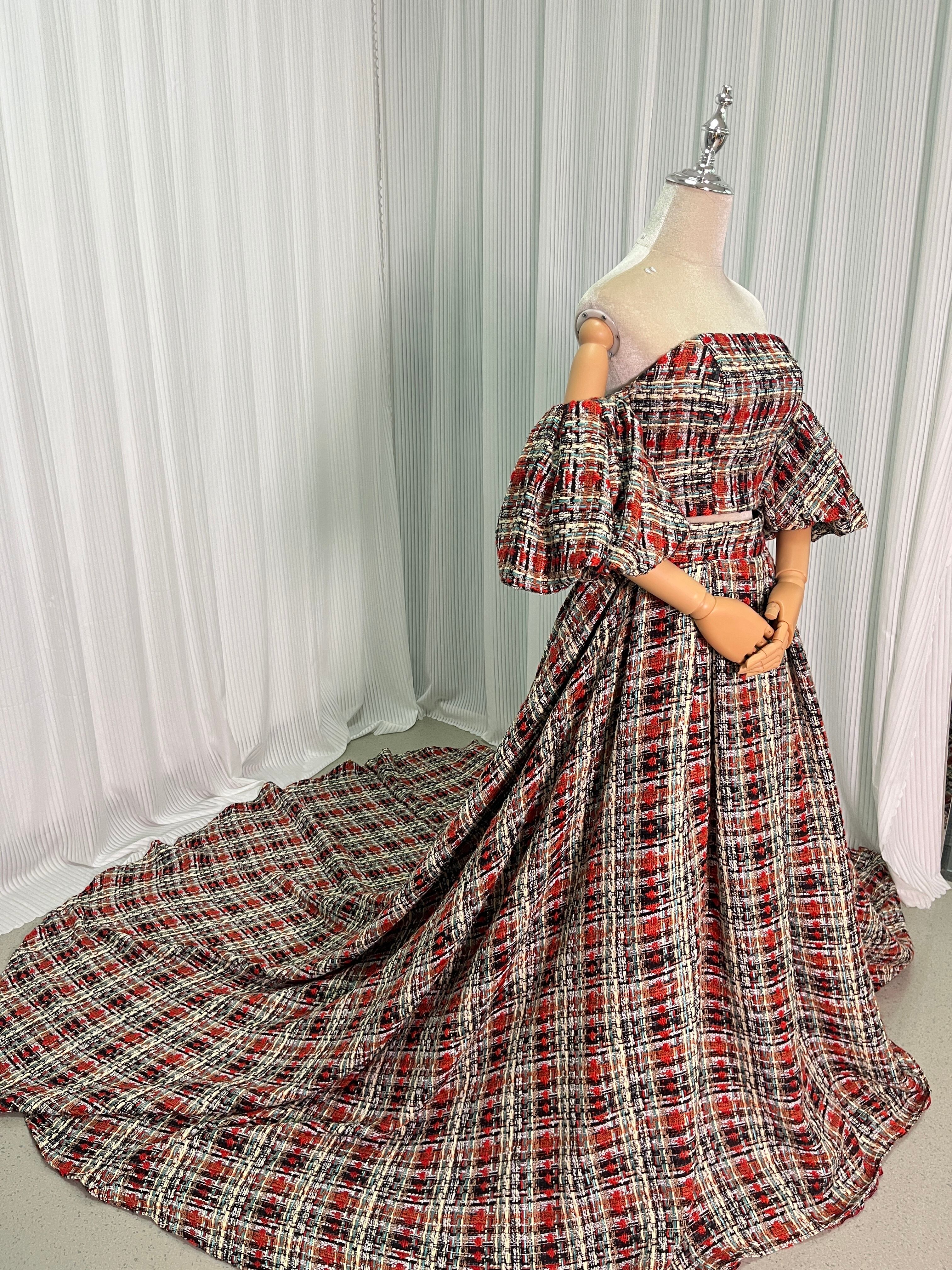 人気上昇!パーティードレス パフスリーブ 赤いチェック柄 ツイードドレス 結婚式 抜群のおしゃれ見え 前撮り