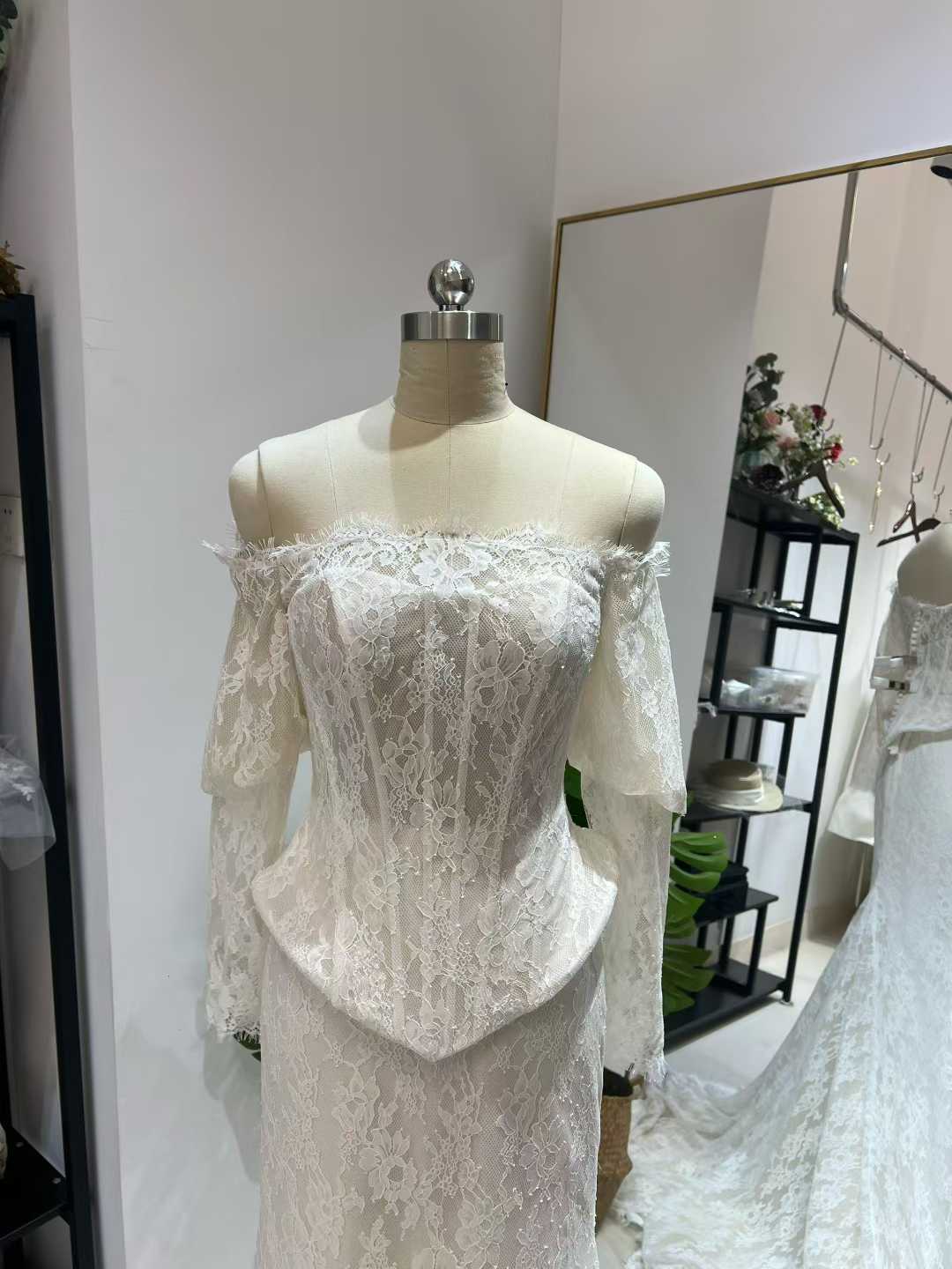 ウェディングドレス くるみボタン オフショルダー ロングスリーブ 贅沢な総レース マーメイドライン 結婚式