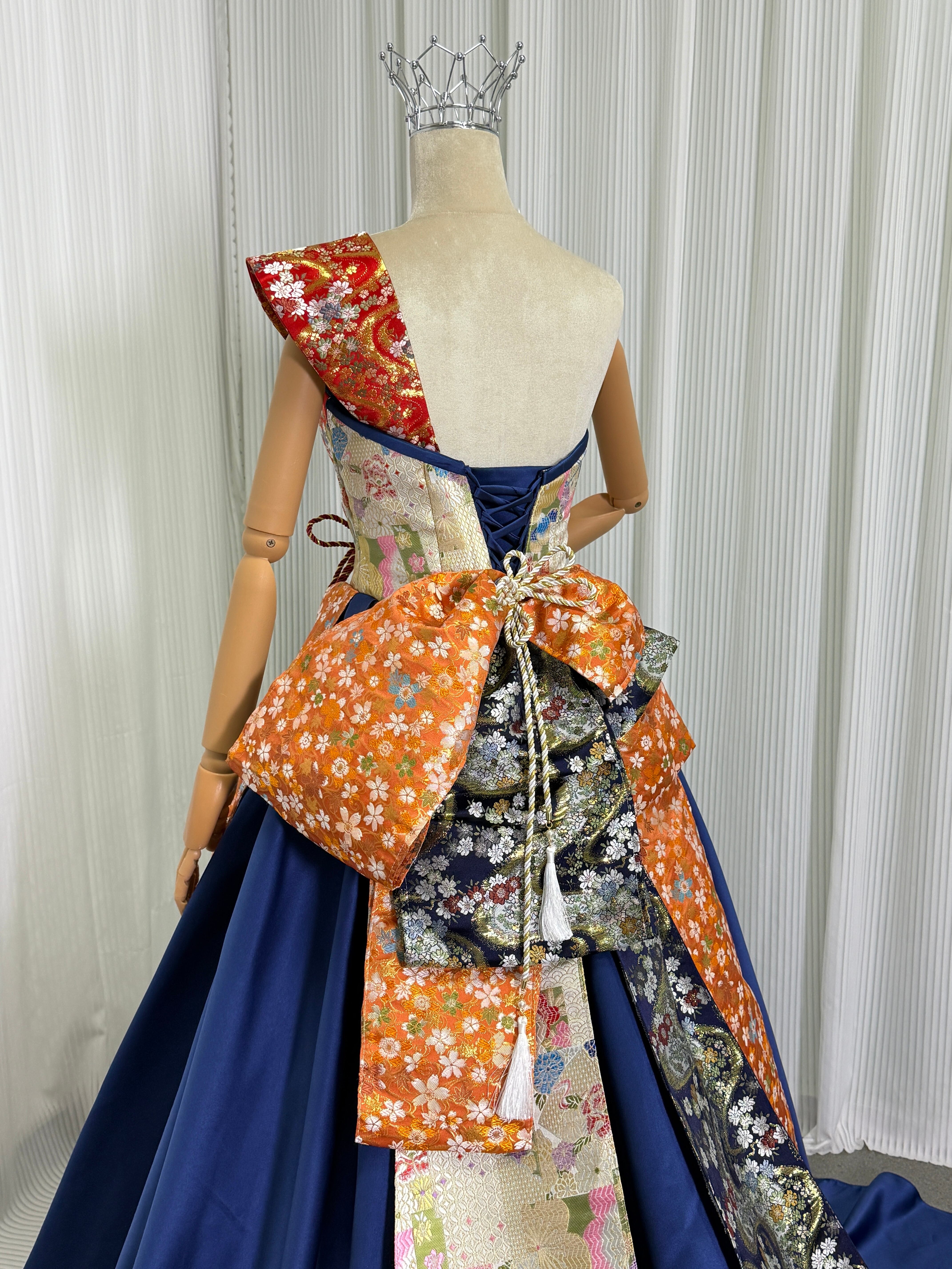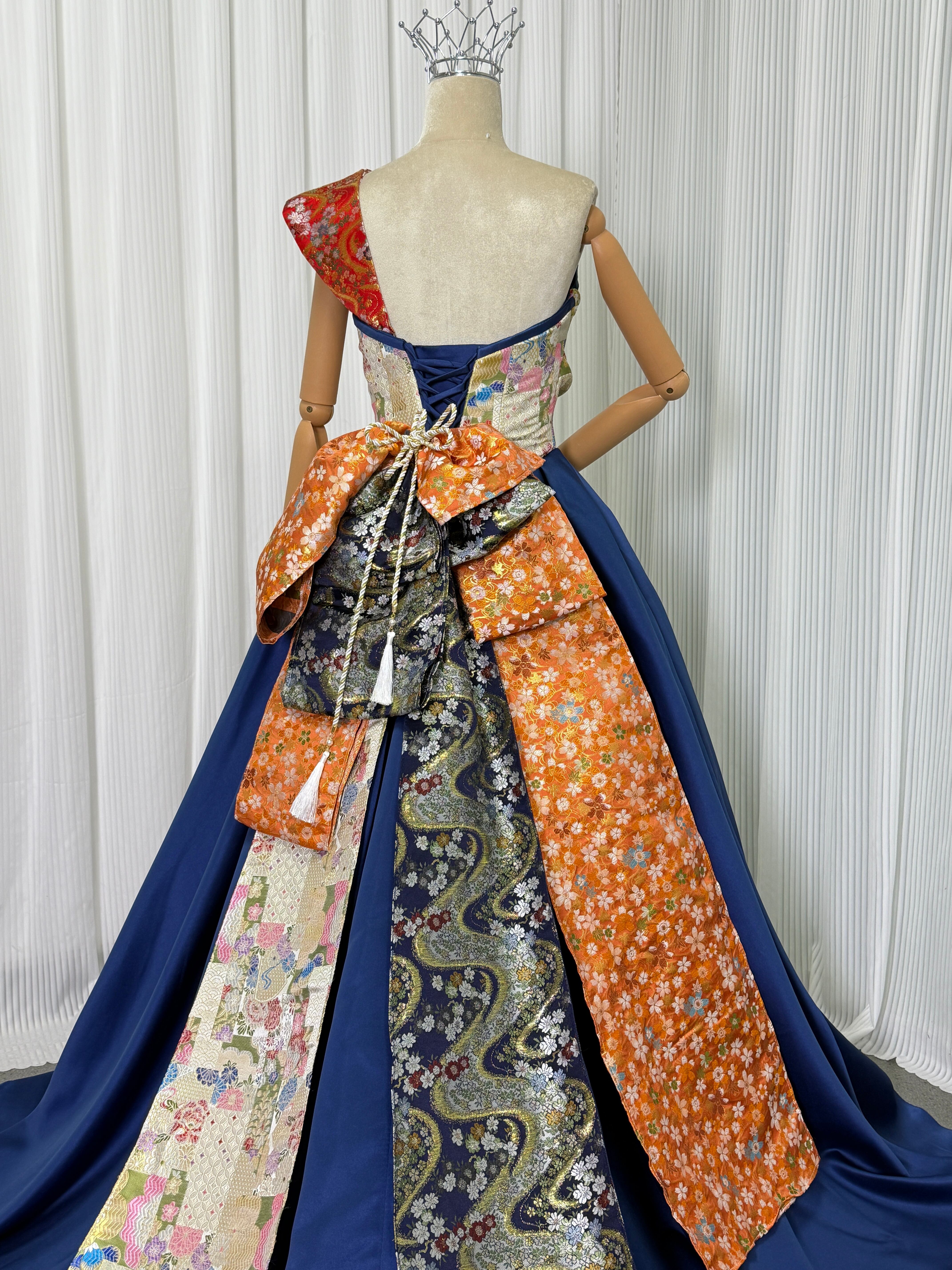 着物ドレス、和ドレス ワンショルダー ふっくら柔らかなバックリボン ジャガード生地 編み上げ ネイビー