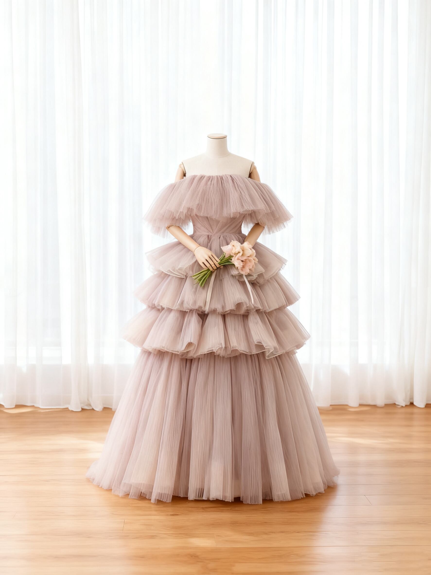 カラードレス オフショルダー ピンク ティアードのドレス スリット ふわふわドレス 花嫁