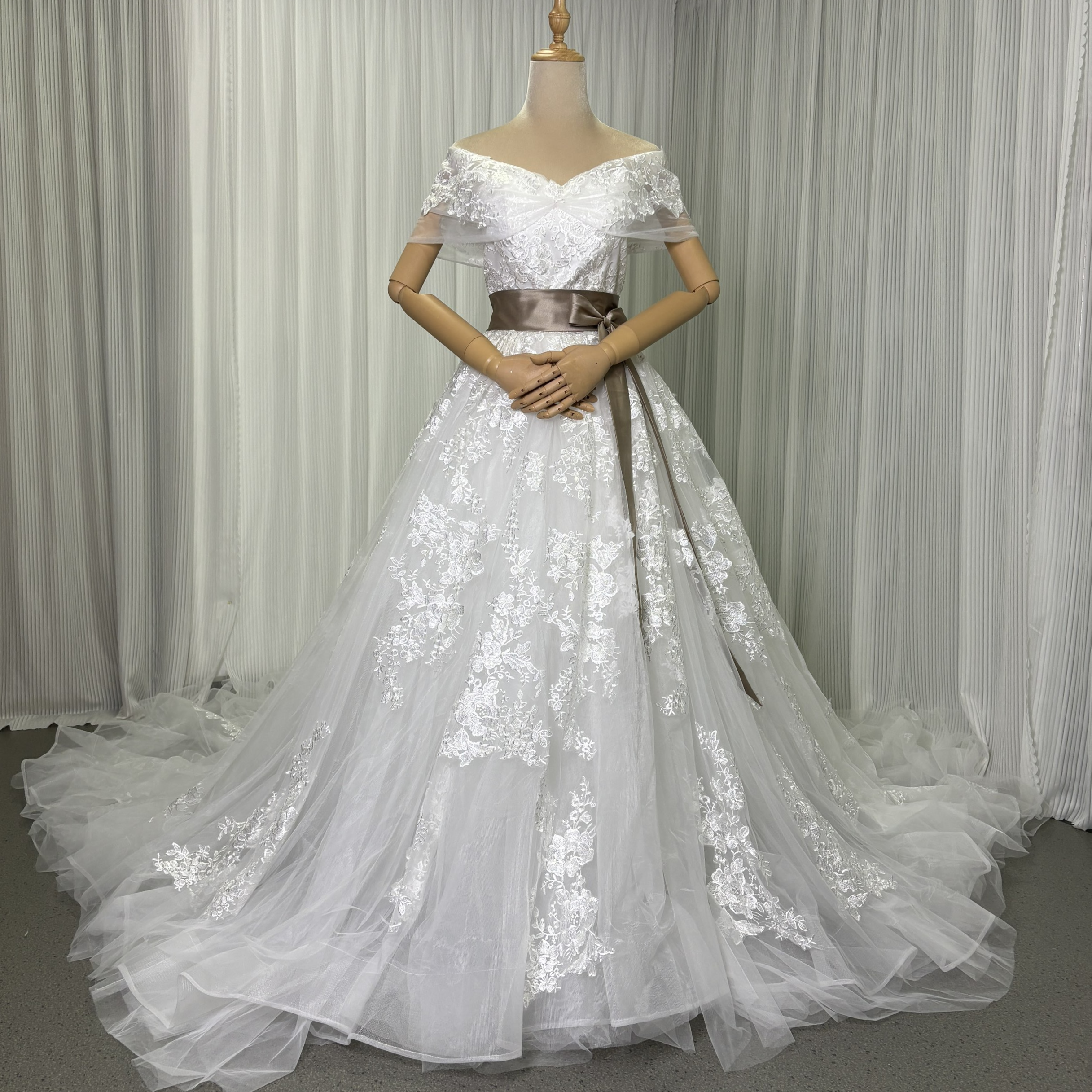 ウェディングドレス 取り外し可能なオフショルダー サッシュベルト 流れる透け花レース ロングトレーン 結婚式
