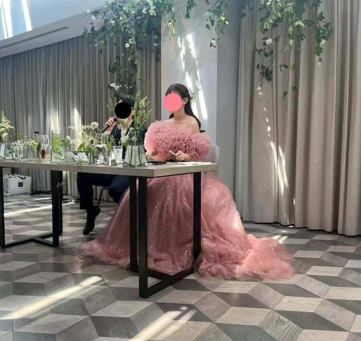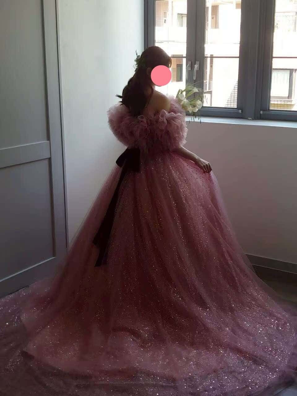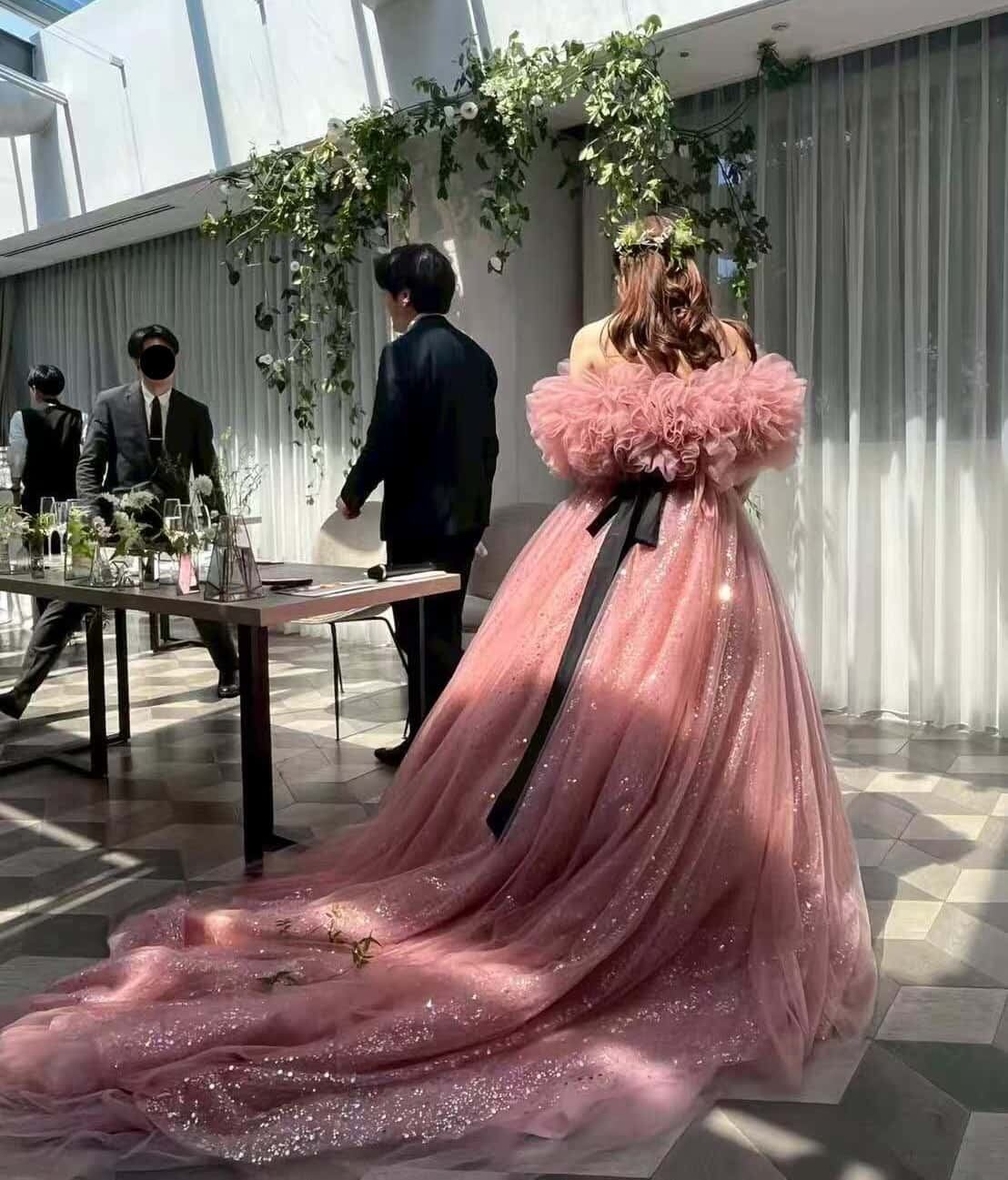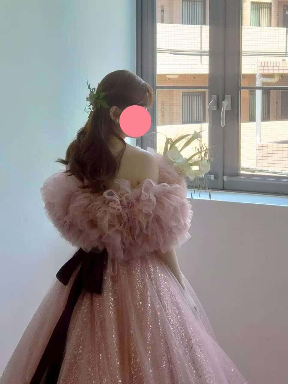 実例写真!カラードレス 取り外し可能なオフショルダー ピンク サッシュベルト 3D立体レース刺繍 結婚式 花嫁