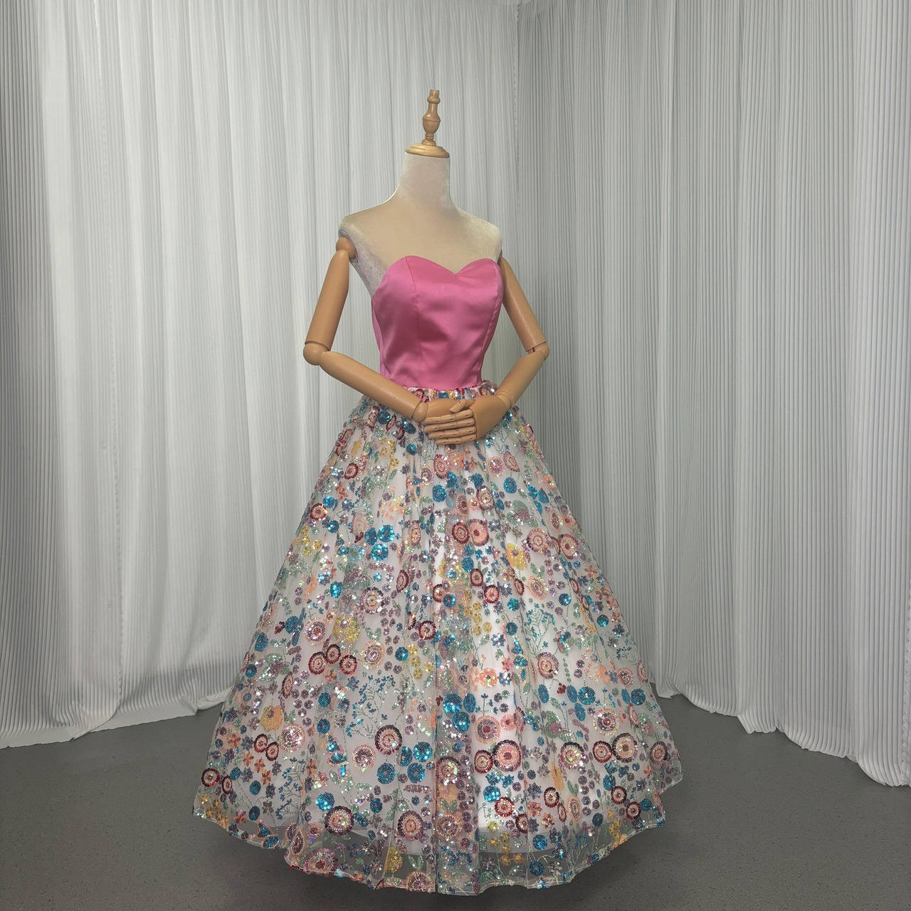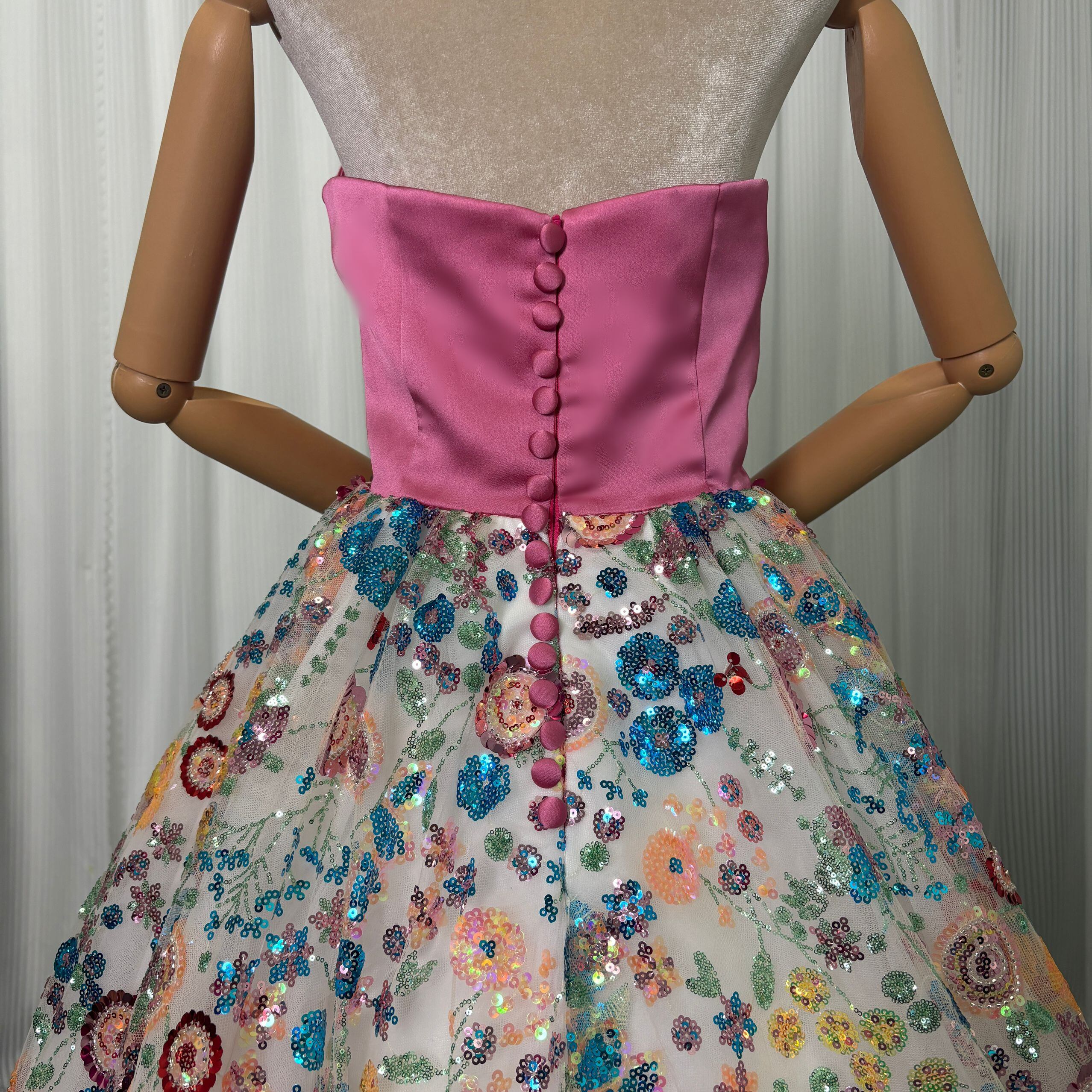 実例写真!カラードレス キラキラスパンコール プリンセスライン ピンク ベアトップ フレアスカート 披露宴 2次会