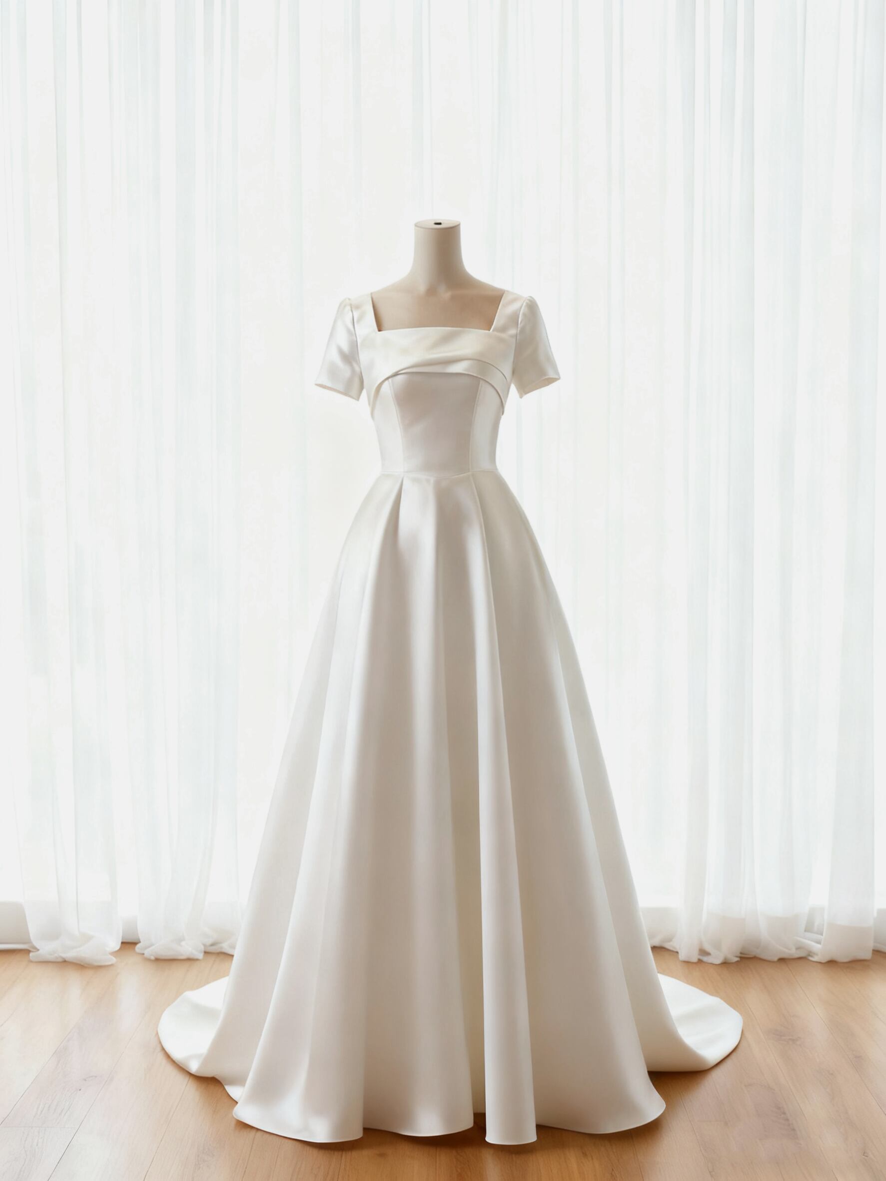 パーティードレス 短袖 スクエアネック 光沢サテン スレンダーライン 二次会 Aライン