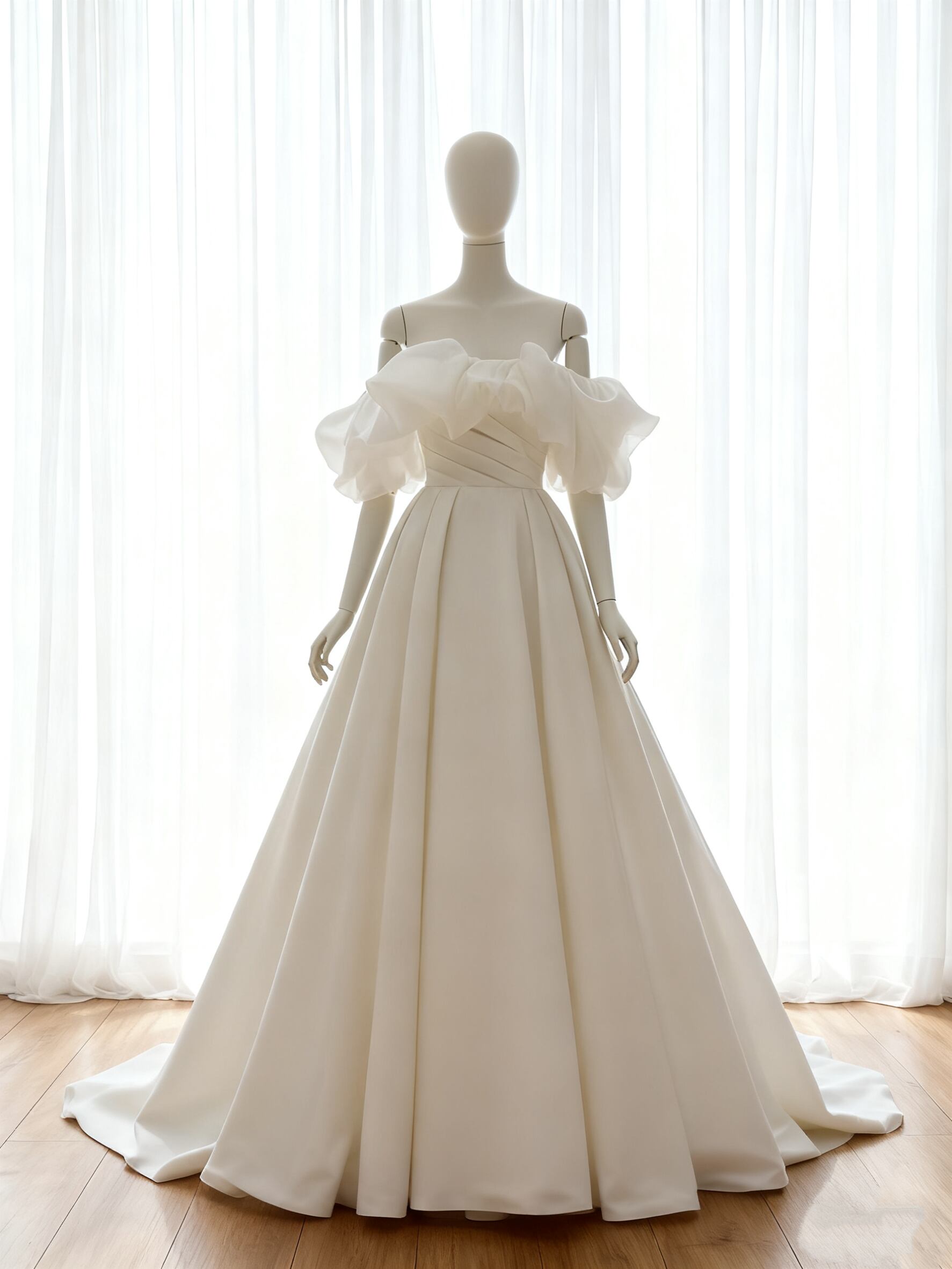 ウエディングドレス オフショルダー スリット 光沢サテン Aライン ブライダル 花嫁 上質オーガンジー