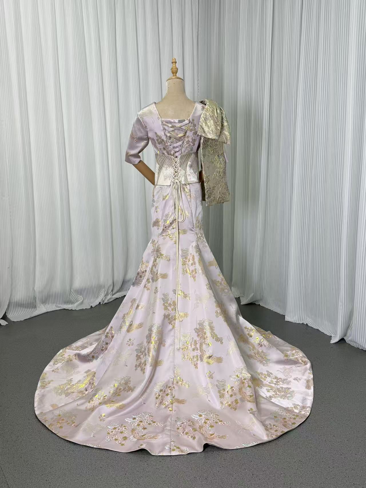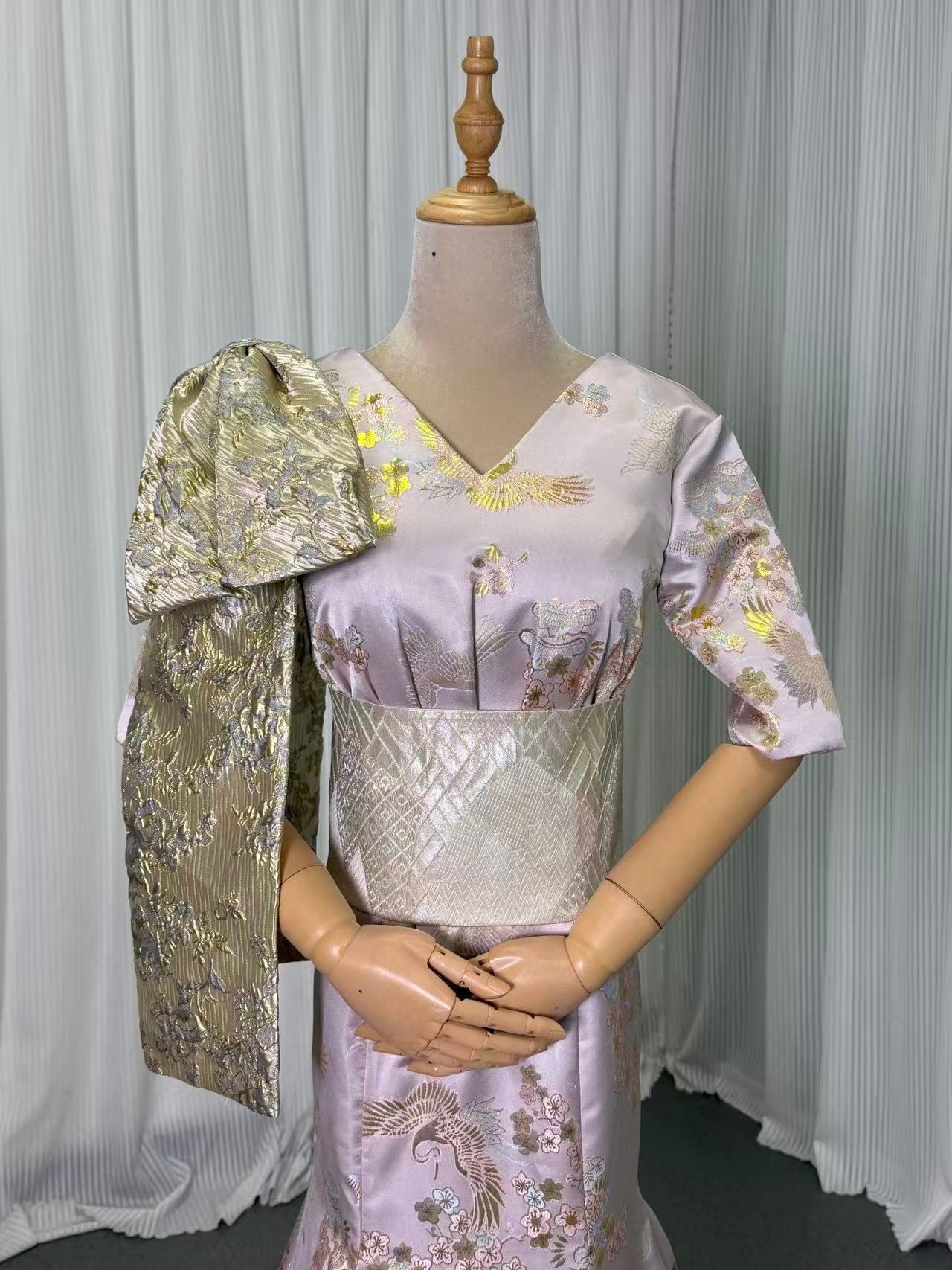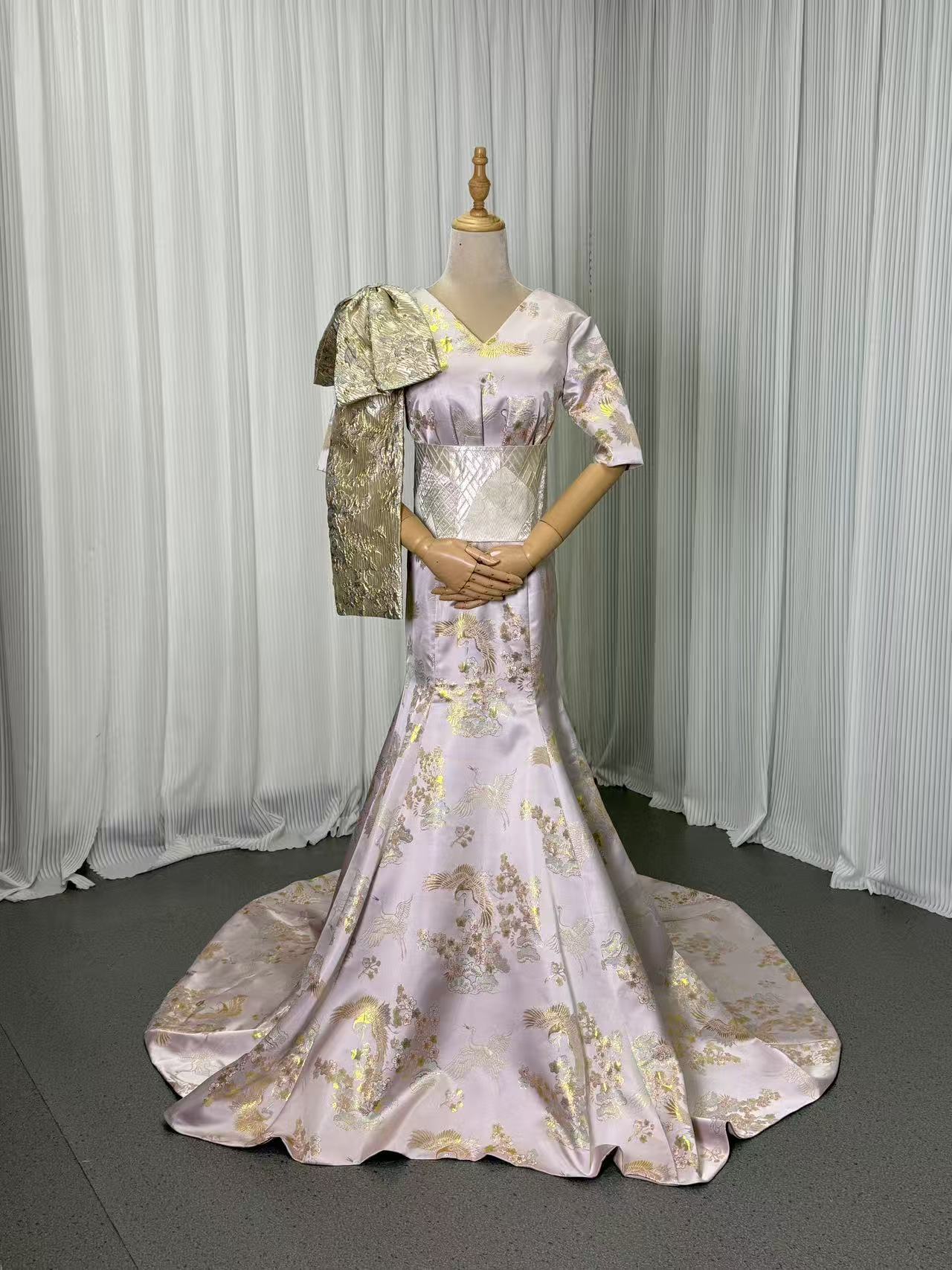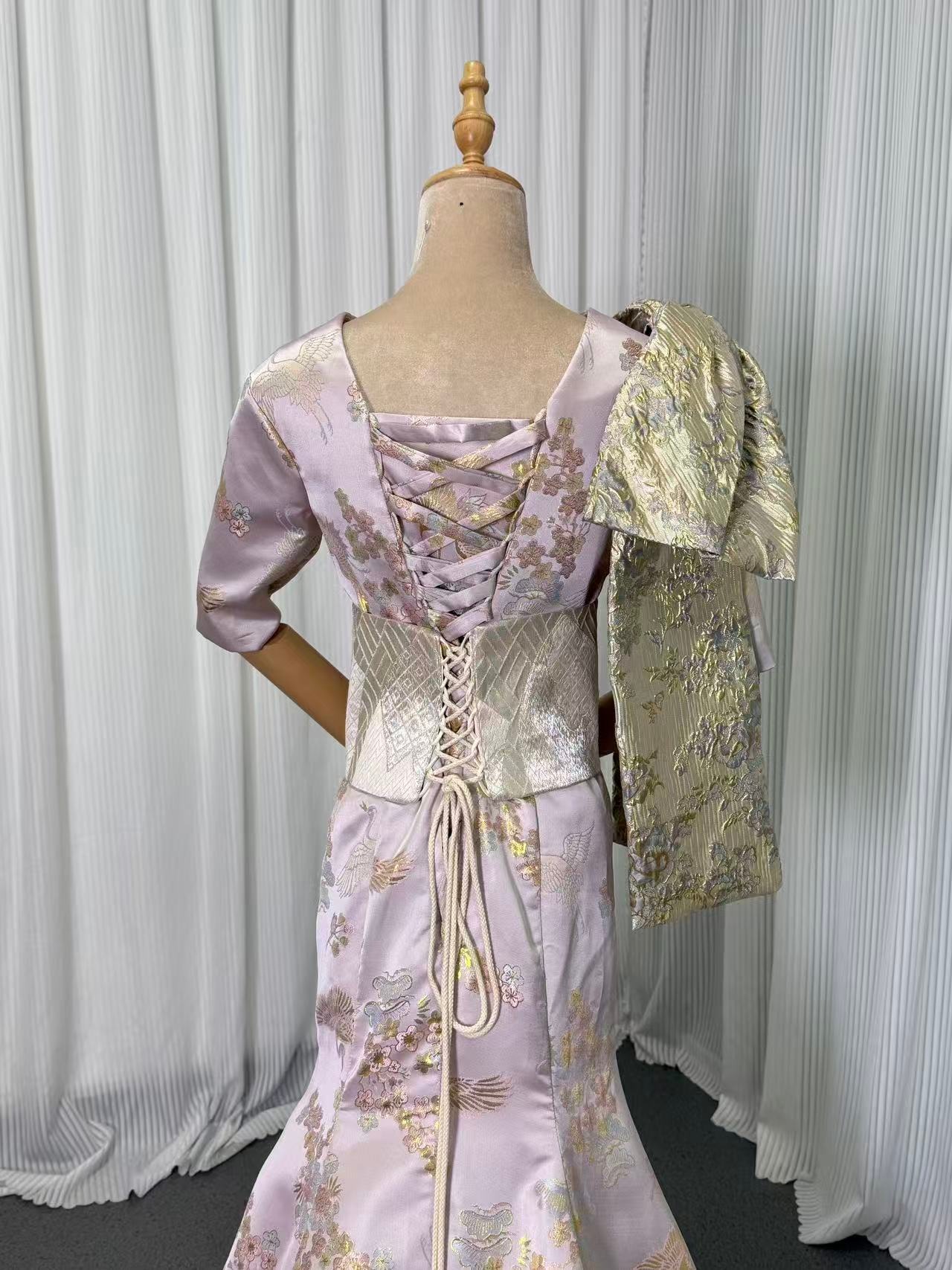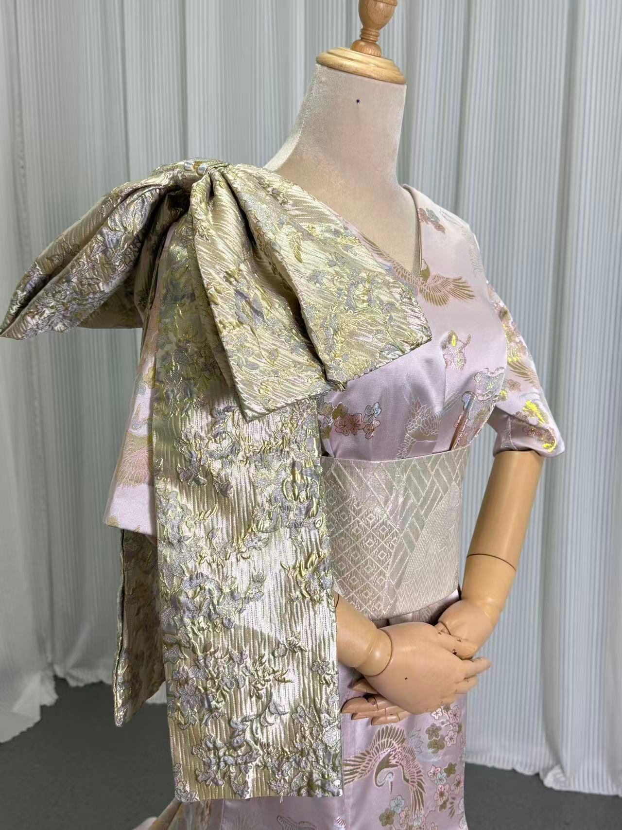 着物ドレス、和風ドレス パープル 肩のリボン 編み上げ マーメイドライン 半袖 Vネック 音楽会