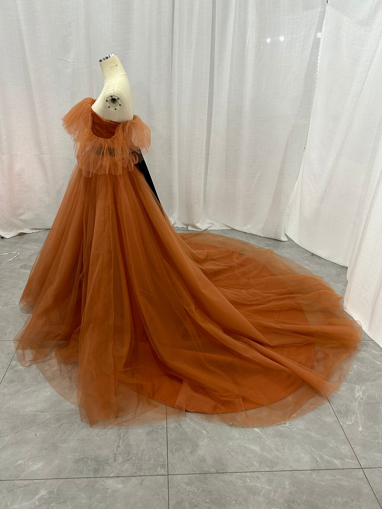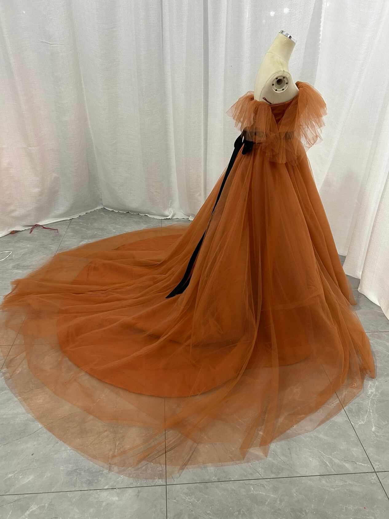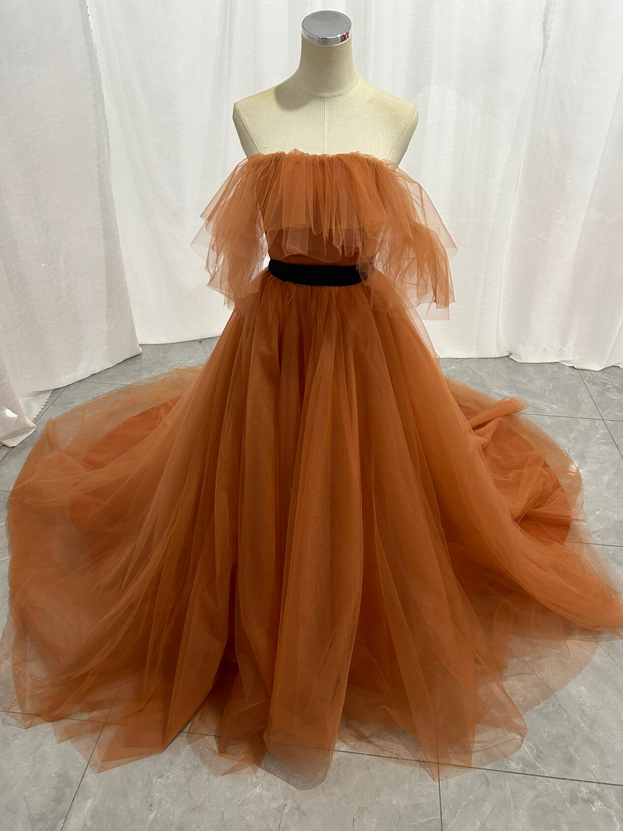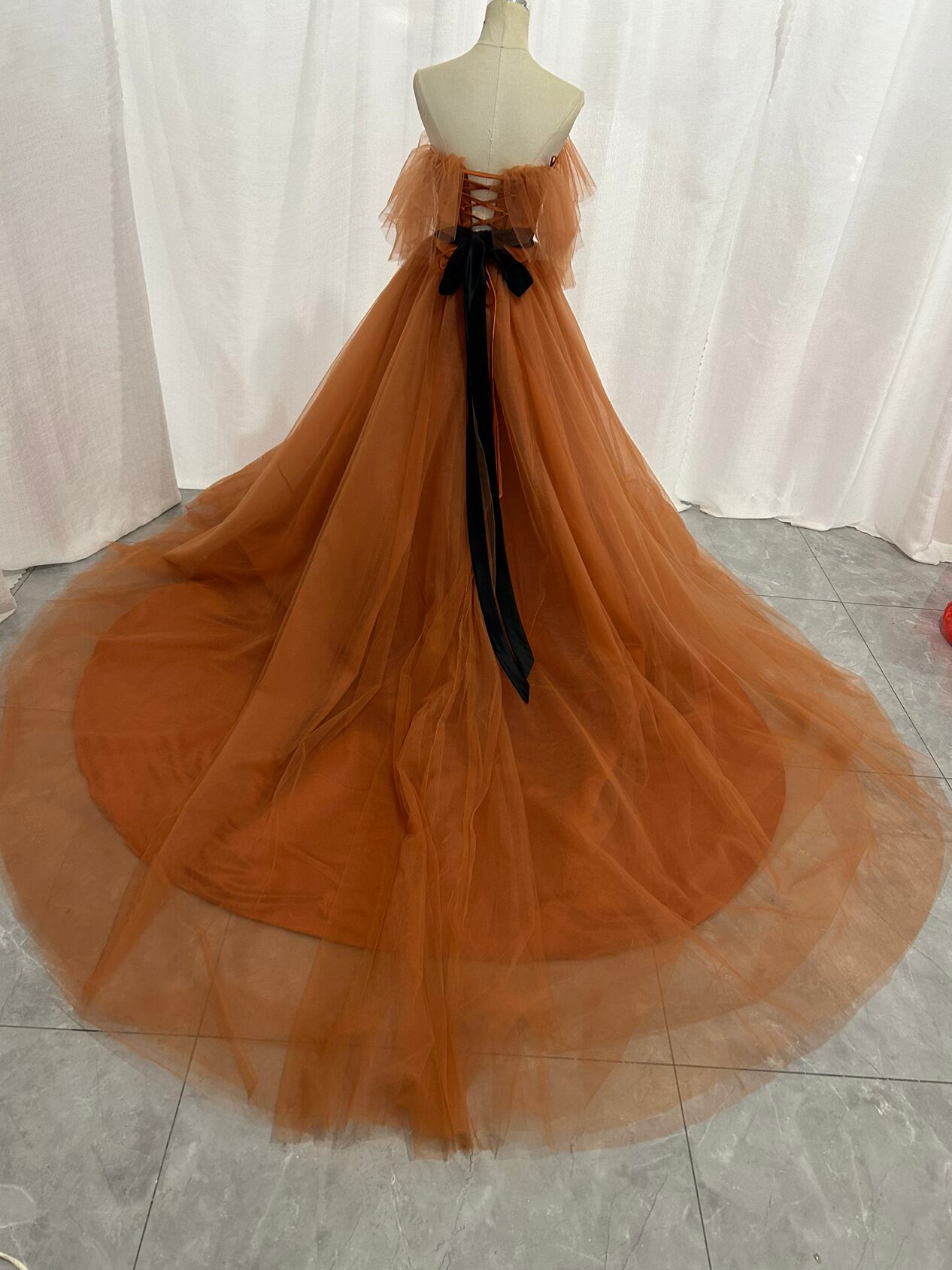 カラードレス テラコッタ オフショルダー 編み上げ 柔らかく重ねたチュールスカート 結婚式/披露宴 Aライン サッシュベルト