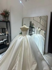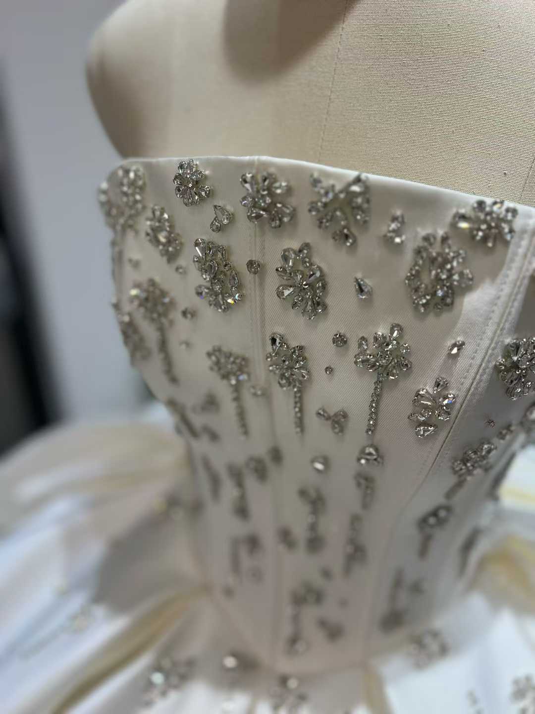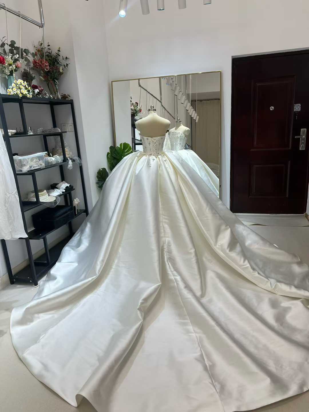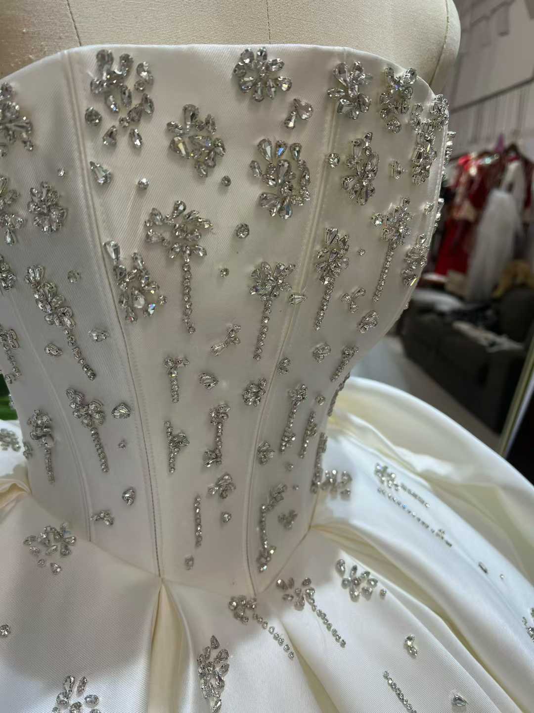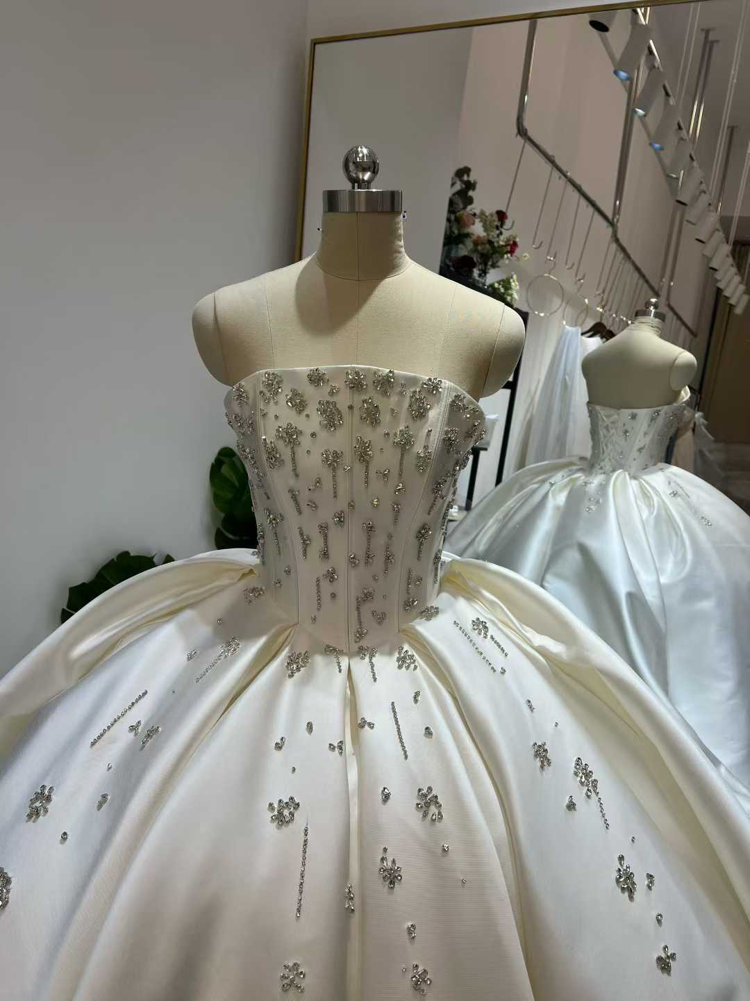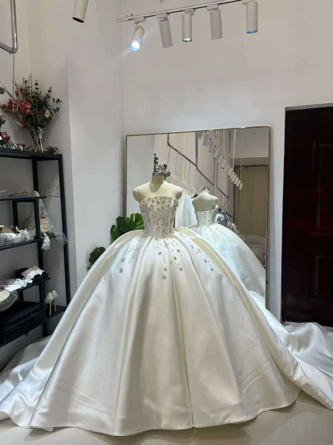 ウエディングドレス ベアトップ ビジュードレス 韓国風ドレス ミカドサテン フレアスカート 結婚式 高見え