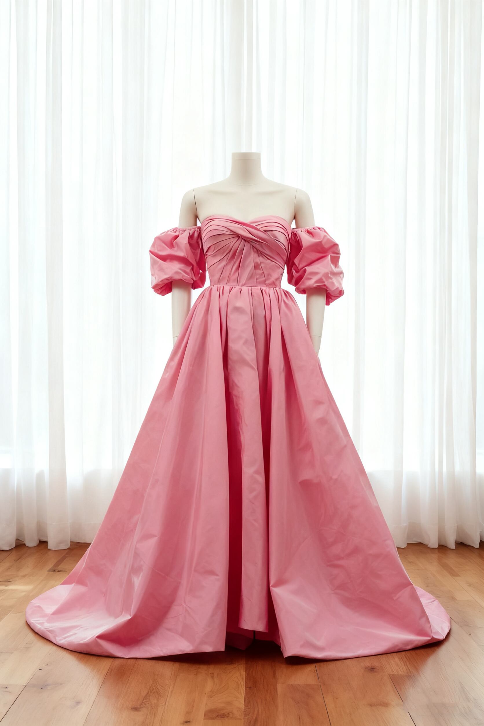 パーティードレス パフスリーブ シルクタフタ ビビッドピンク ハンドドレープ 前撮り 2次会