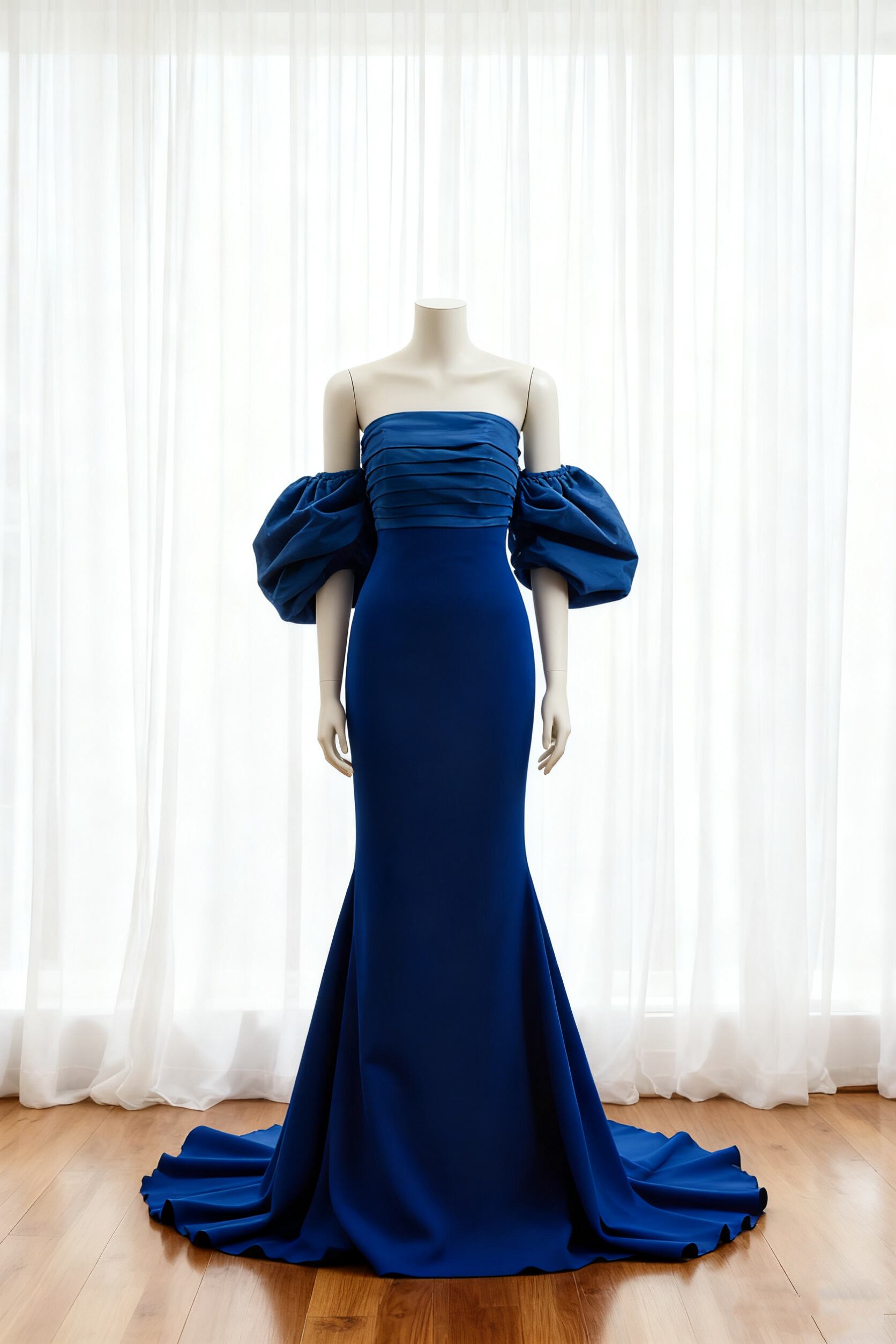 カラードレス バルーンスリーブ ブルー マーメイドライン ベアトップ 優雅なシルエット 細見えシルエット