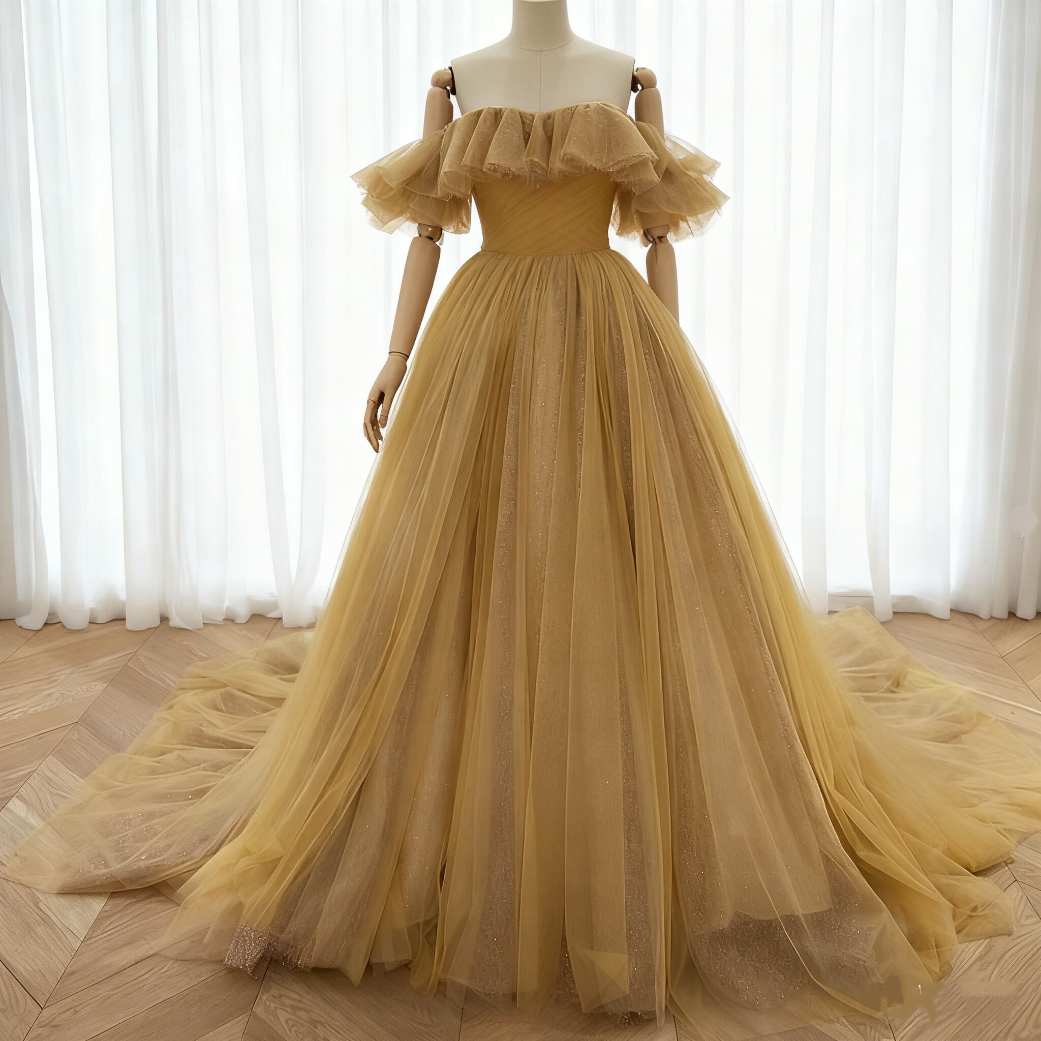 カラードレス イエロー キラキラグリッターチュール オフショルダー ソフトチュール Aライン 結婚式
