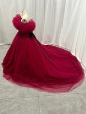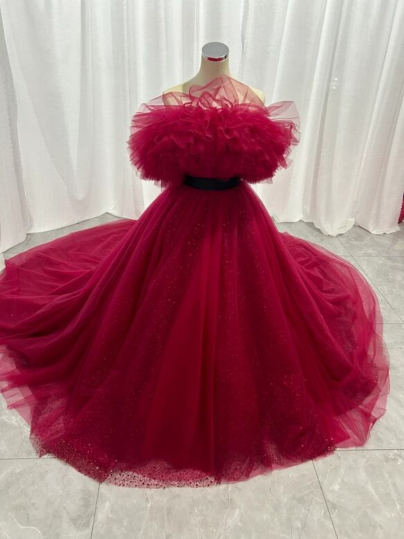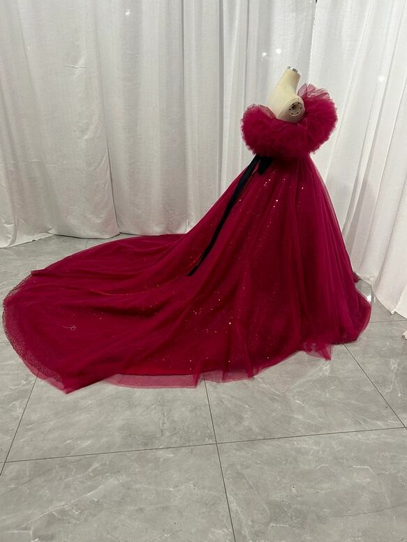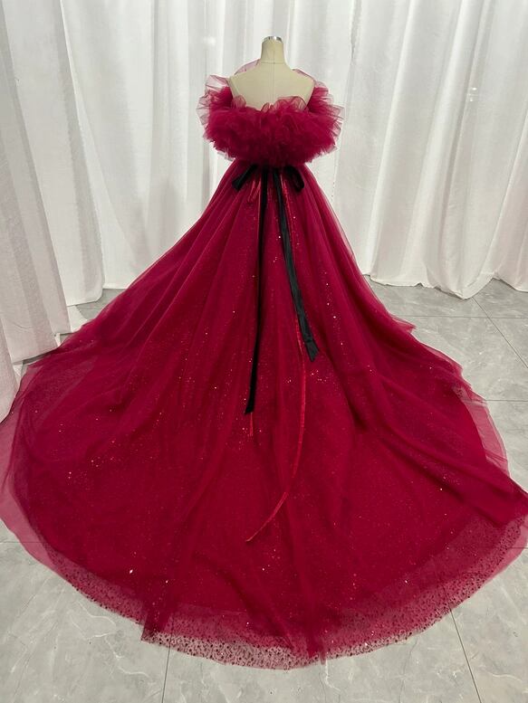 カラードレス ワインレッド オフショルダー シークインチュール ロングトレーン 華やか 花嫁