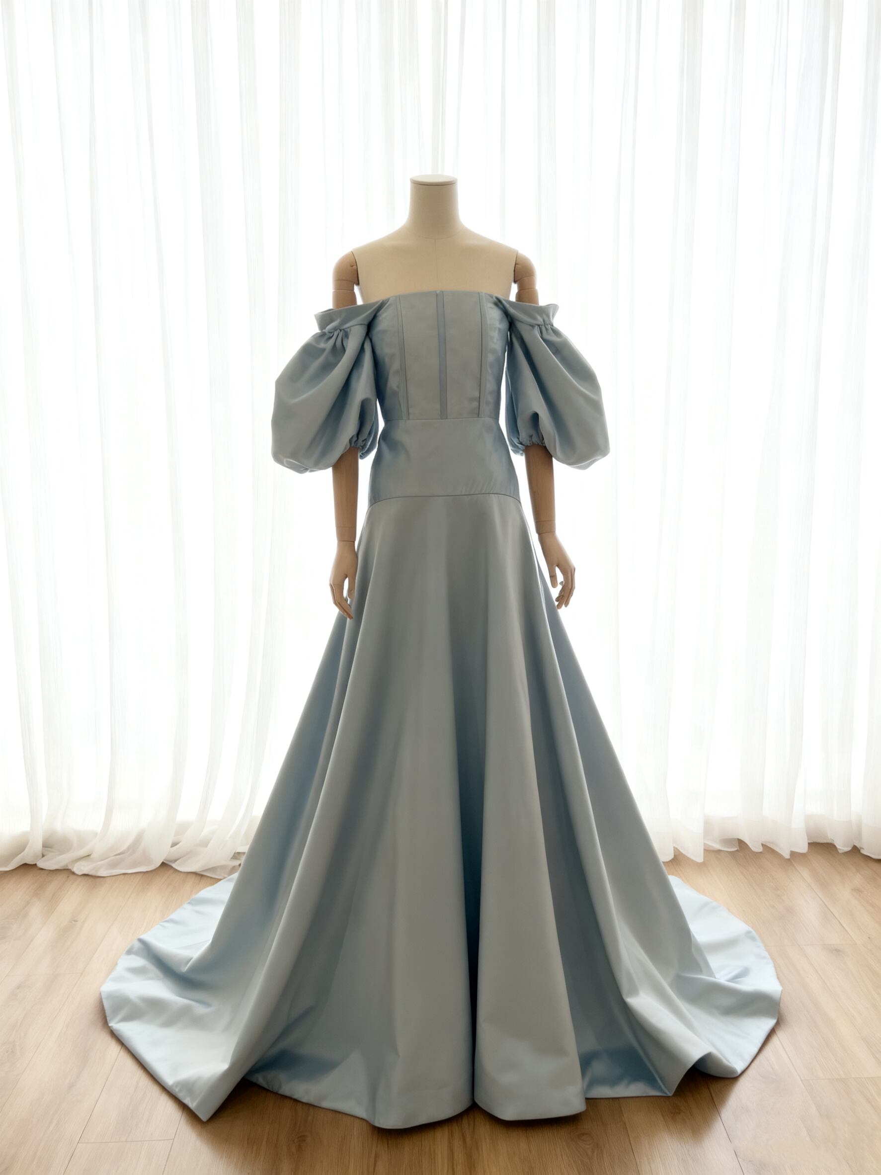 カラードレス パフスリーブドレス オフショルダー ブルー ボーン Aライン 優雅なシルエット 前撮り