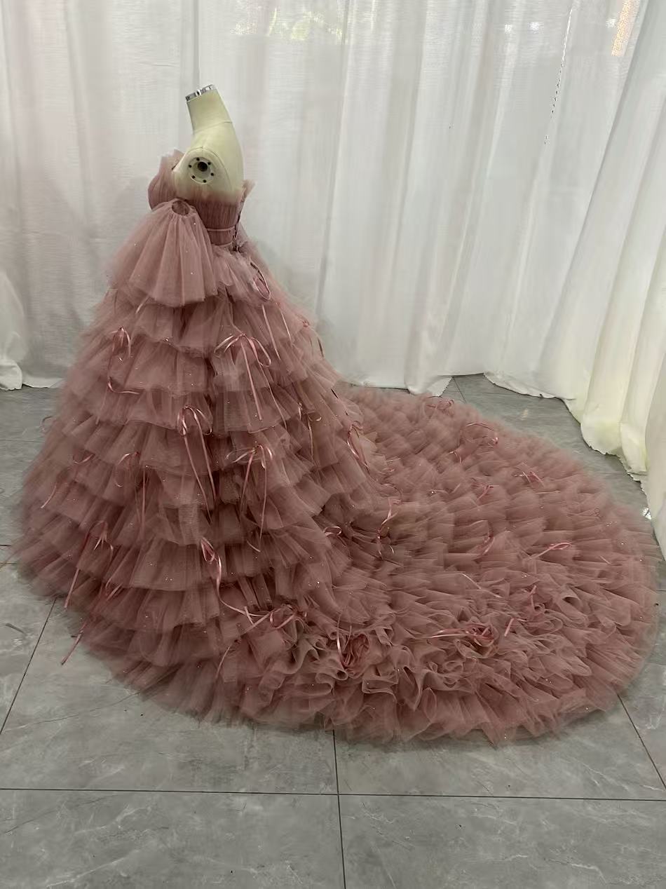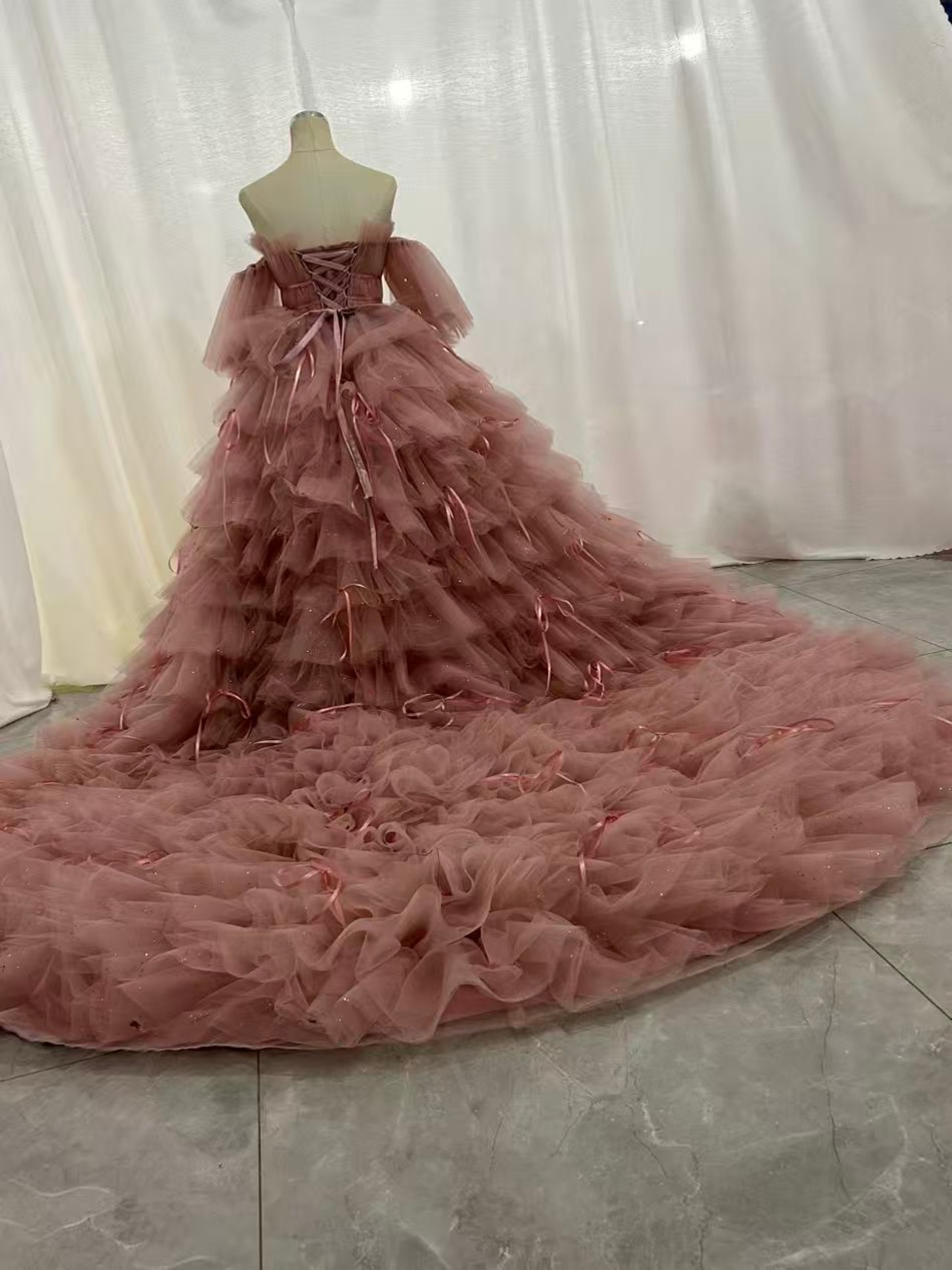 カラードレス フリル袖 キラキラグリッターチュール リボン トレーン もこもこドレス 結婚式 プリンセスライン