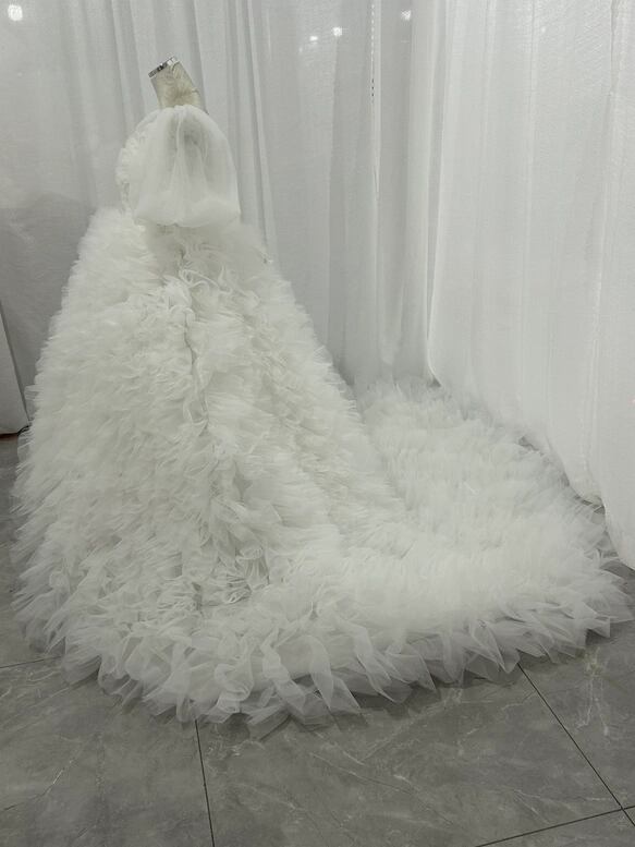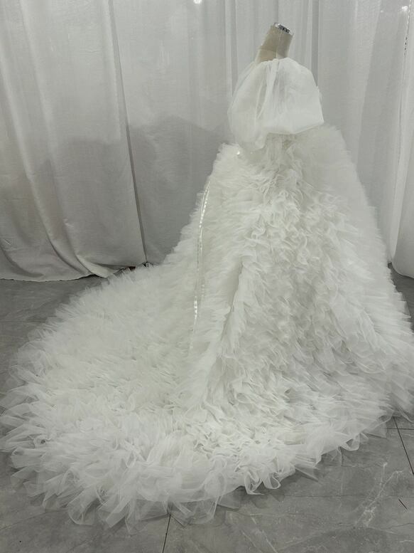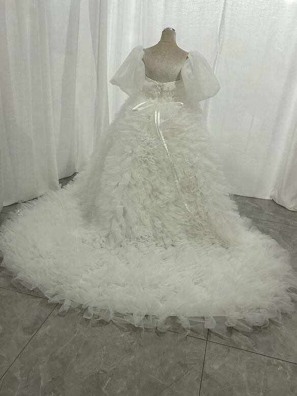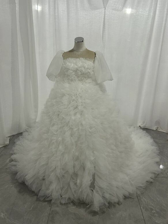ウェディングドレス オフホワイト 柔らかく重ねたチュールスカート 華やかなトレーン 可愛い ブライダル 姫袖