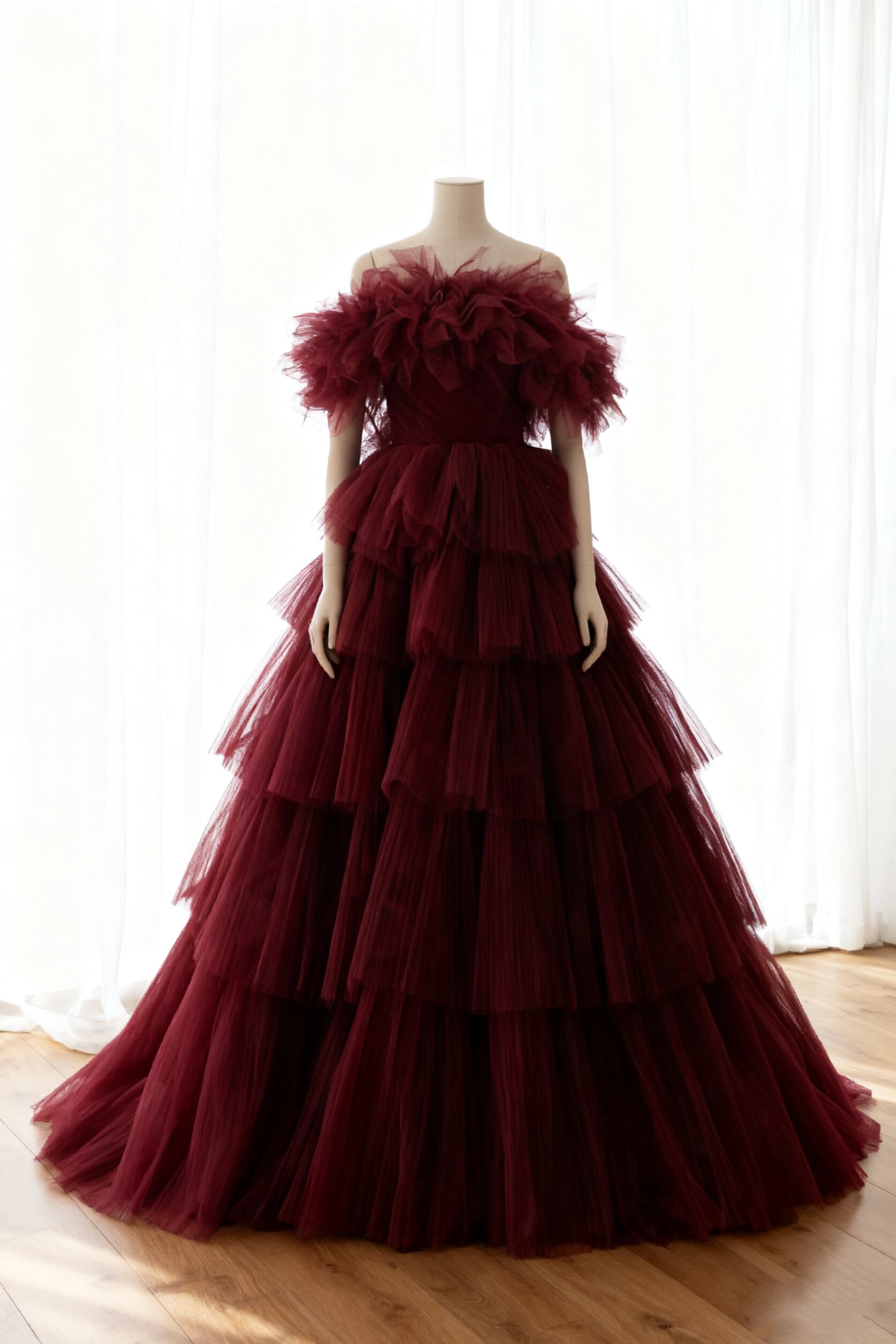 カラードレス オフショルダー ワインレッド プリーツスカート ティアードのドレス エレガント アンティークなドレス