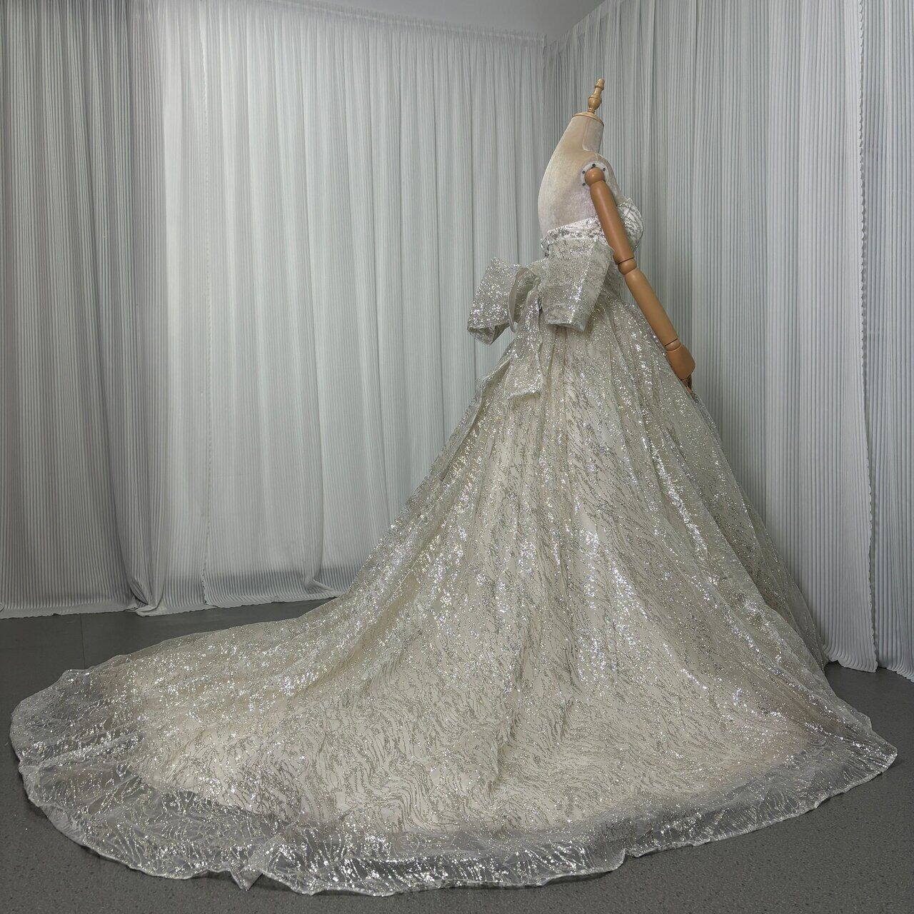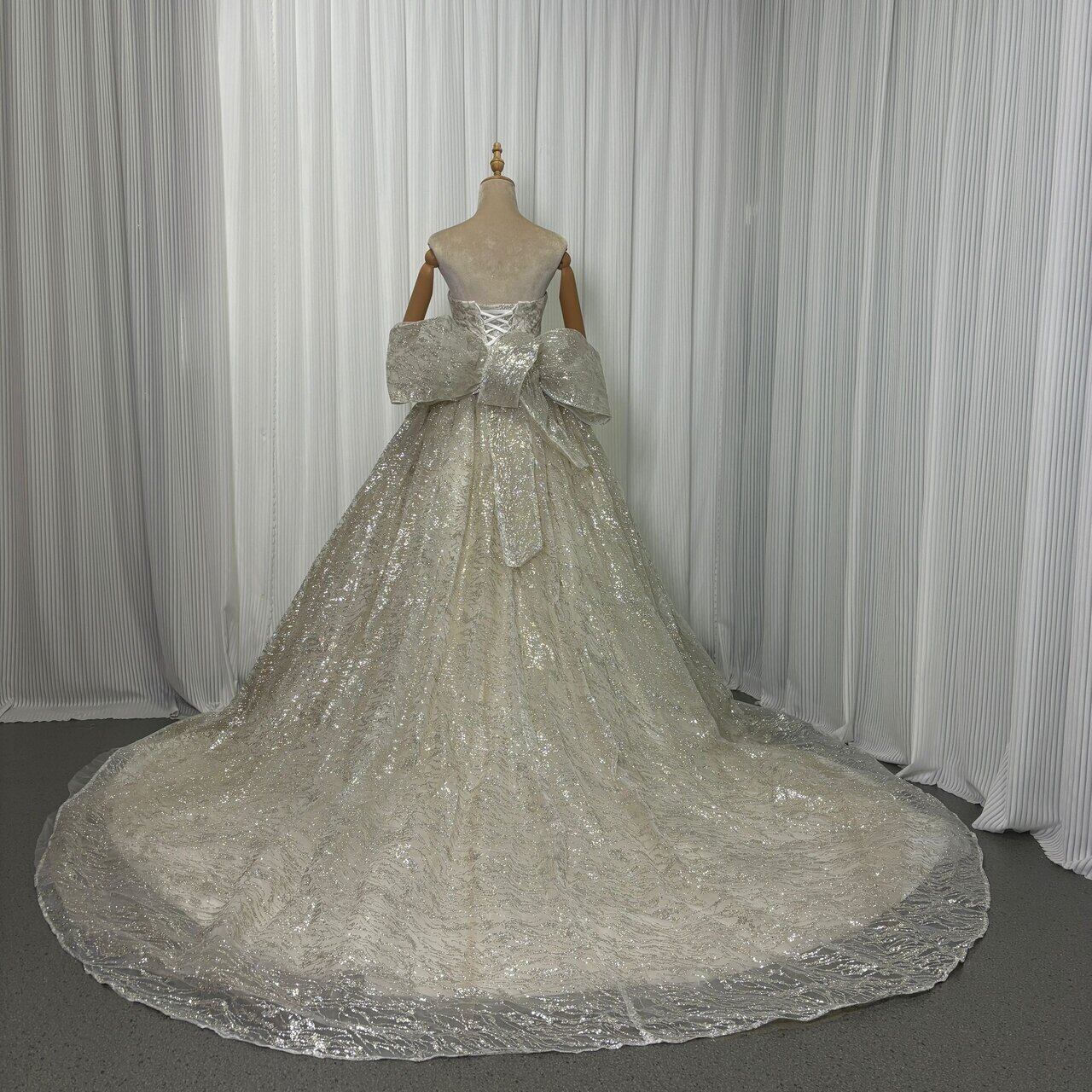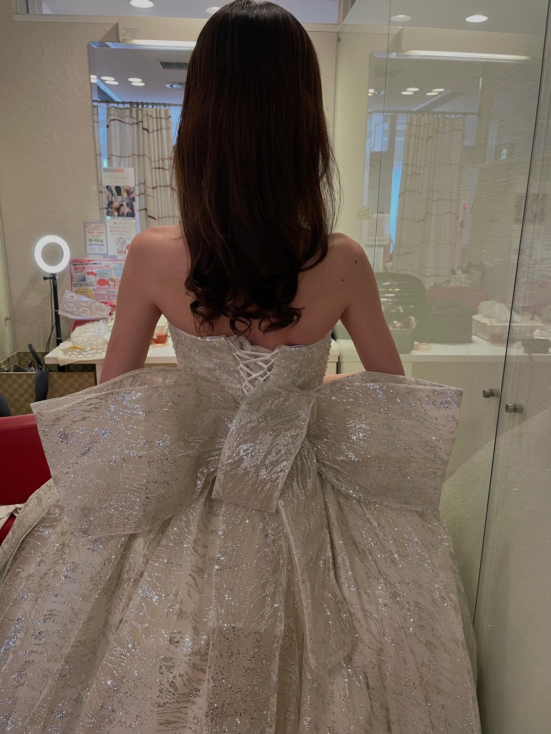 実例写真!華やか!ウェディングドレス グリッタードレス ベアトップ ふっくら柔らかなバックリボン 憧れのドレス 結婚式