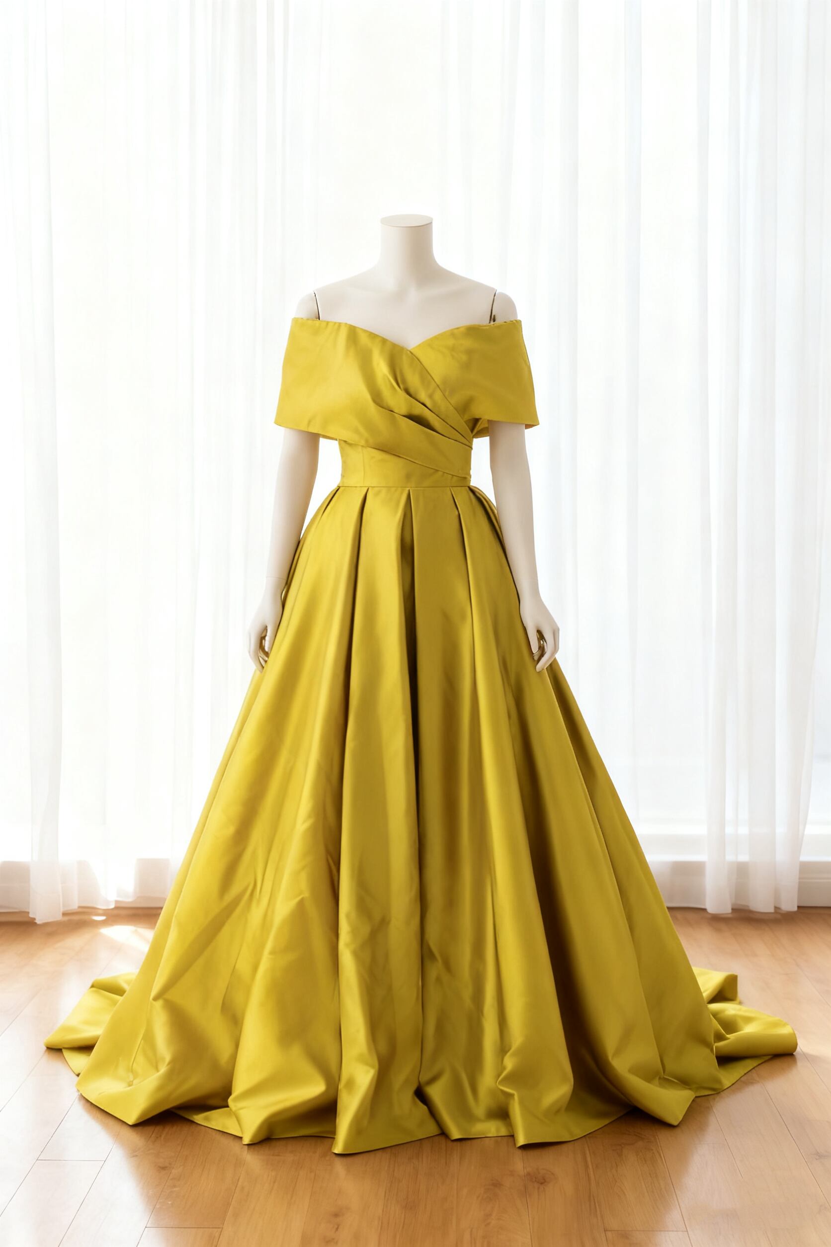 カラードレス オフショルダー イエロー シルクタフタ 抜群におしゃれ度が際立つ Aライン 前撮り 花嫁
