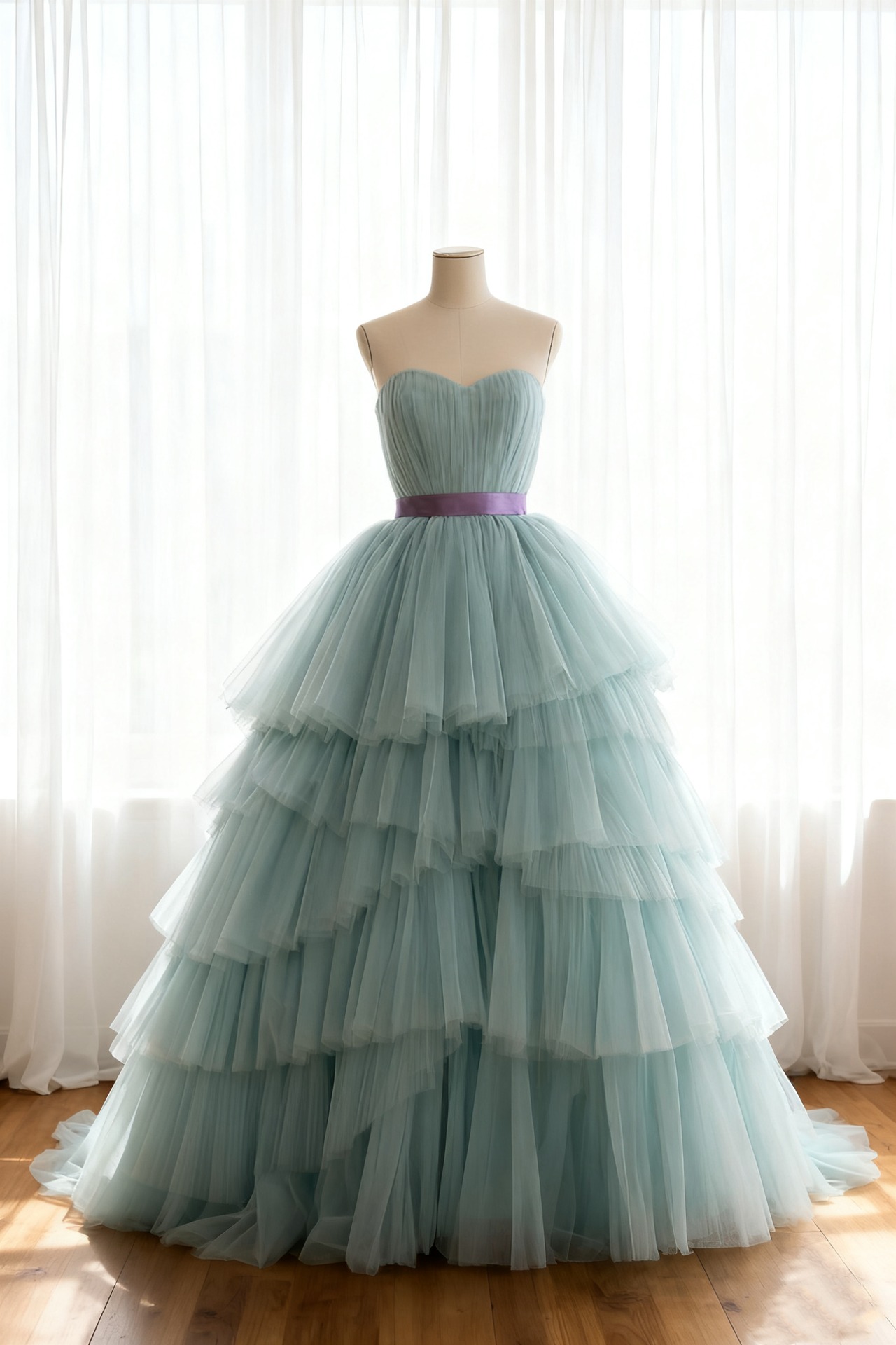 カラードレス ブルー プリーツドレス ティアードのドレス ベアトップ サッシュベルト 披露宴 結婚式