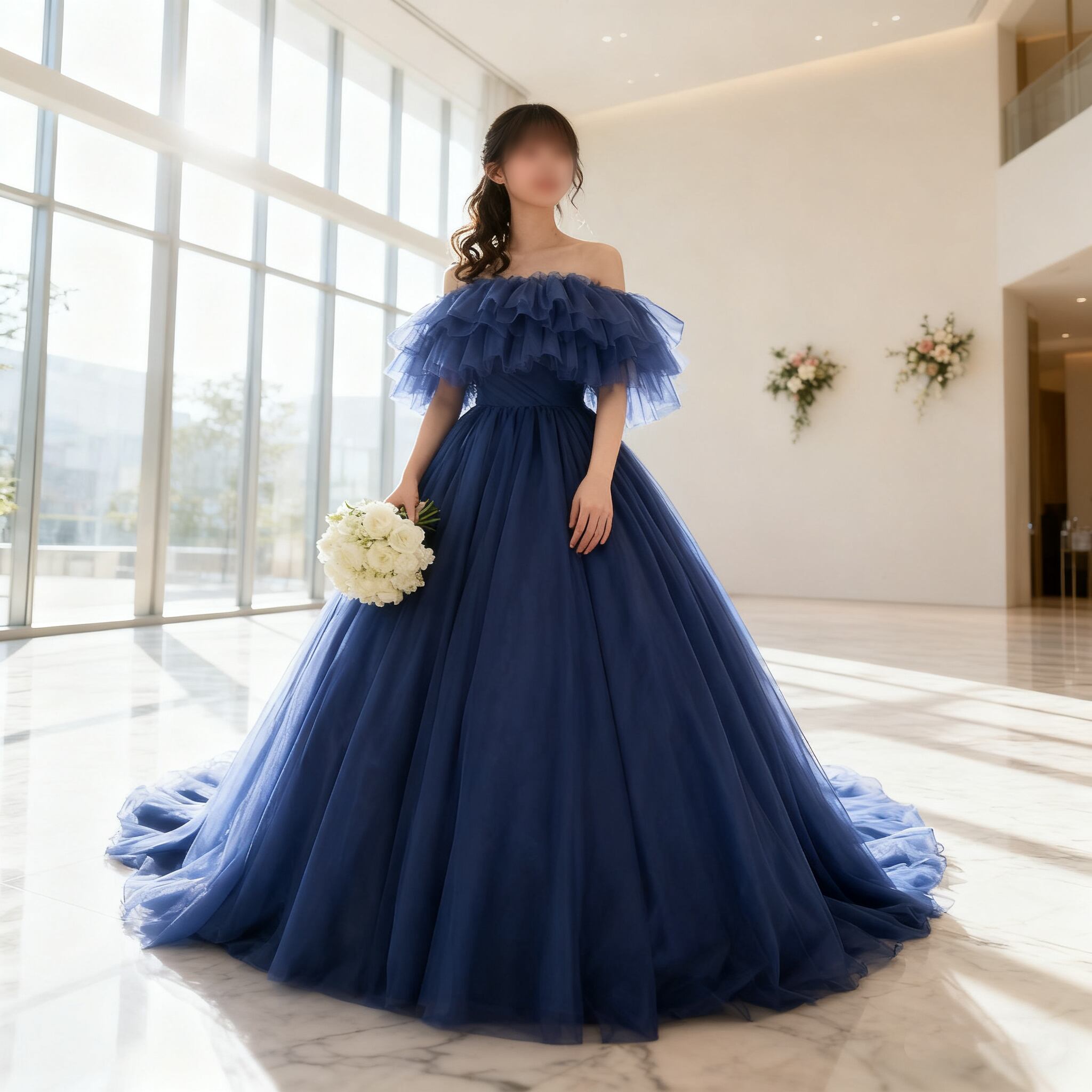 カラードレス オフショルダー ネイビー 編み上げ ビスチェドレス ソフトチュール 結婚式 エレガント