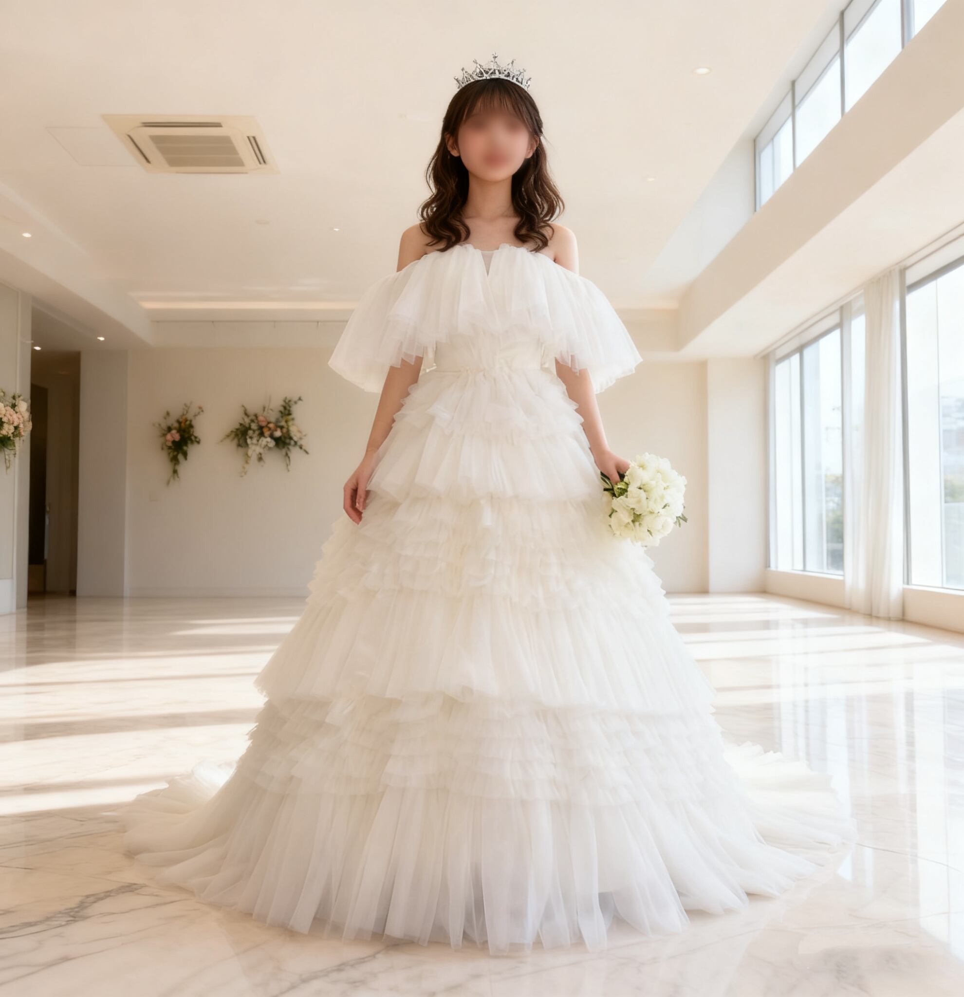 カラードレス オフホワイト ソフトチュール オフショルダー ロングトレーン ブライダル 華やか