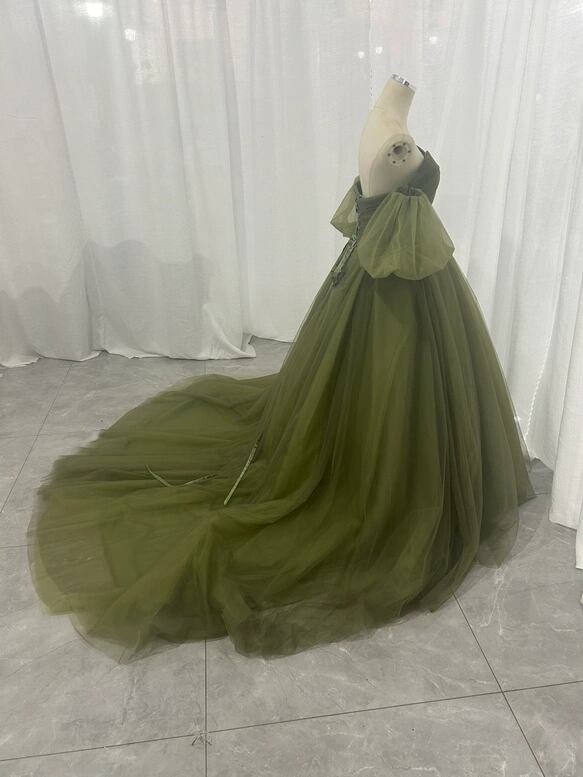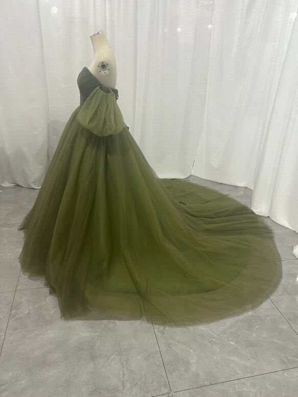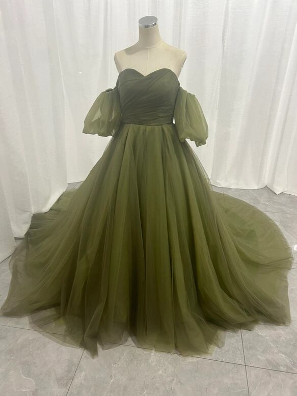 高品質!カラードレス グリーン ベアトップ トレーン ビスチェドレス 花嫁/ウェディングドレス