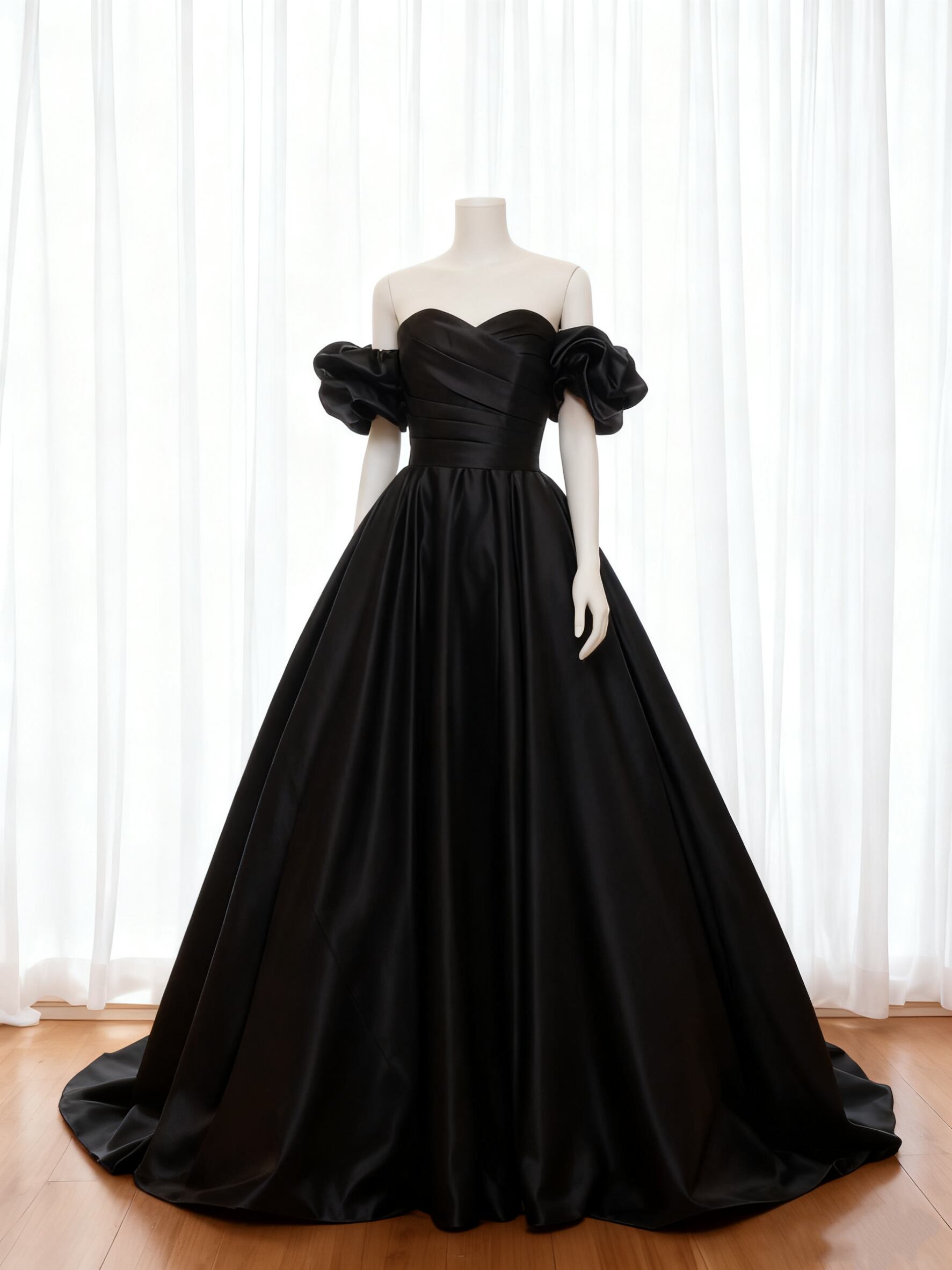 パーティードレス パフスリーブ ブラック ハンドドレープ 光沢サテン エレガント 前撮り
