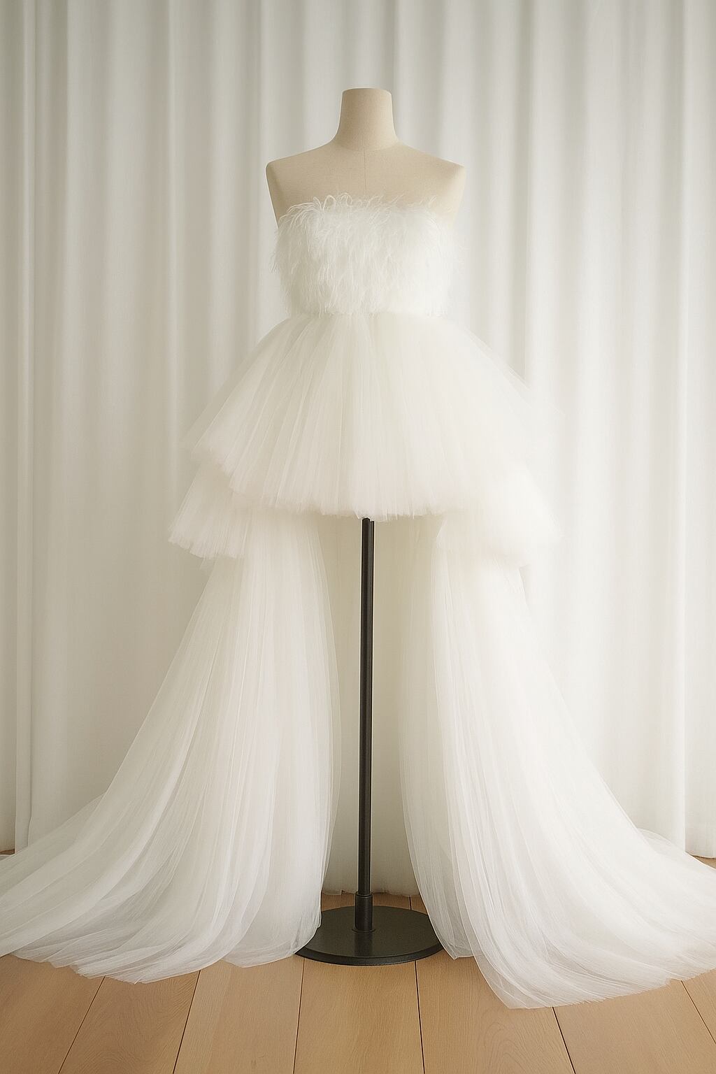 ウエディングドレス ベアトップ ショートインロングドレス フェザー チュールスカート 披露宴