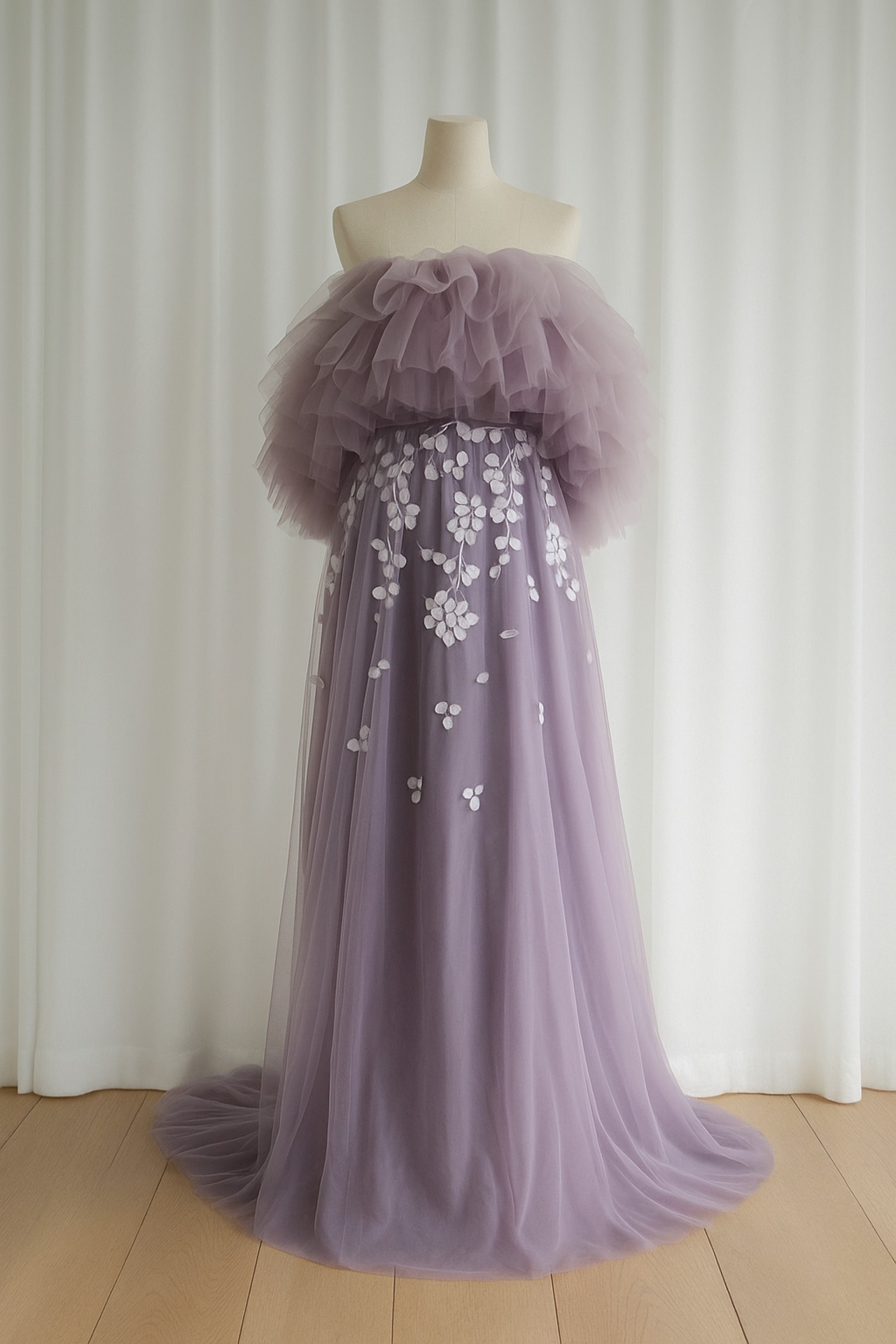 カラードレス パープル ベアトップ リーフ刺繍 柔らかく重ねたチュールスカート 揺らめく裾 エンパイアライン 前撮り