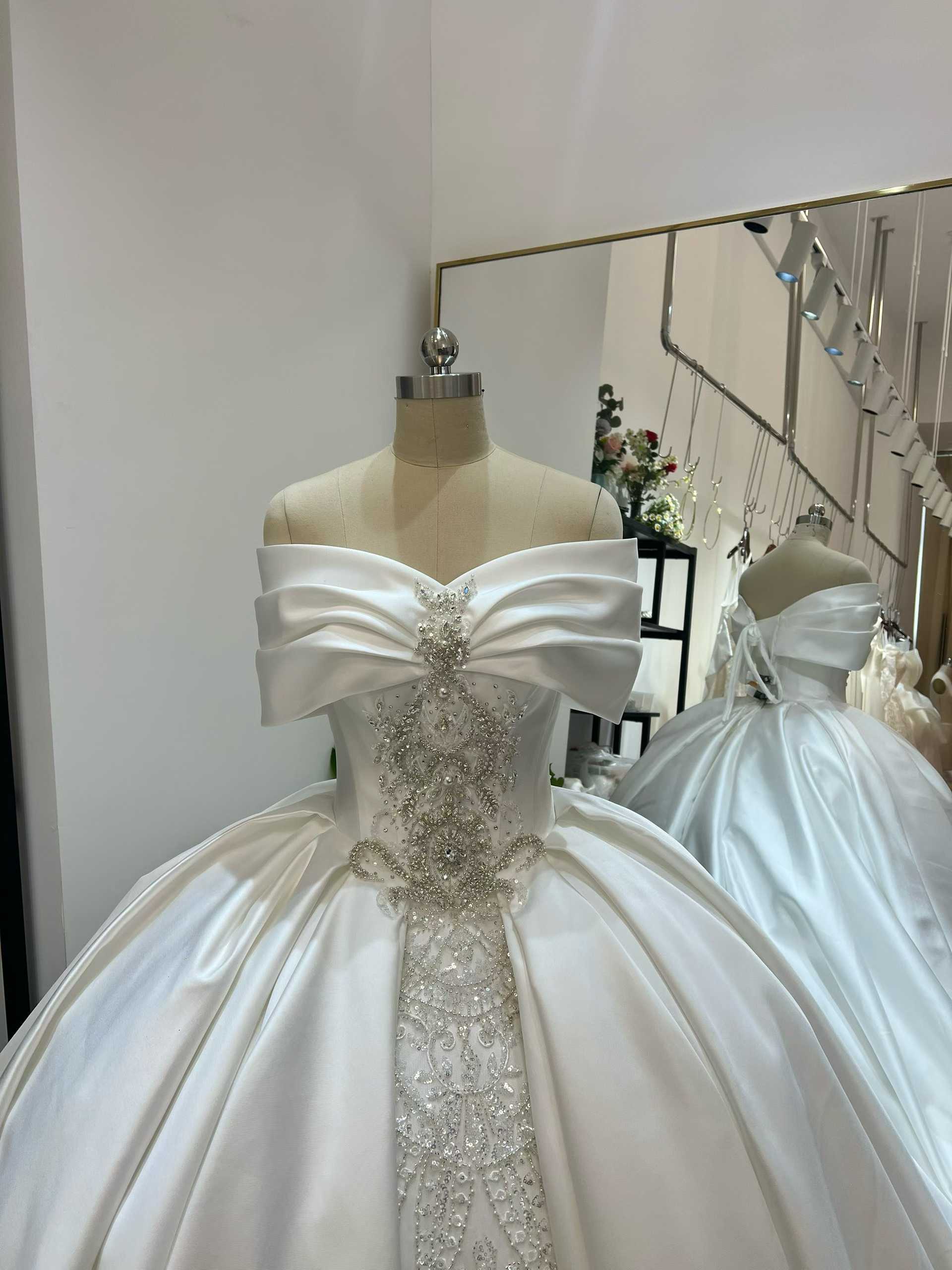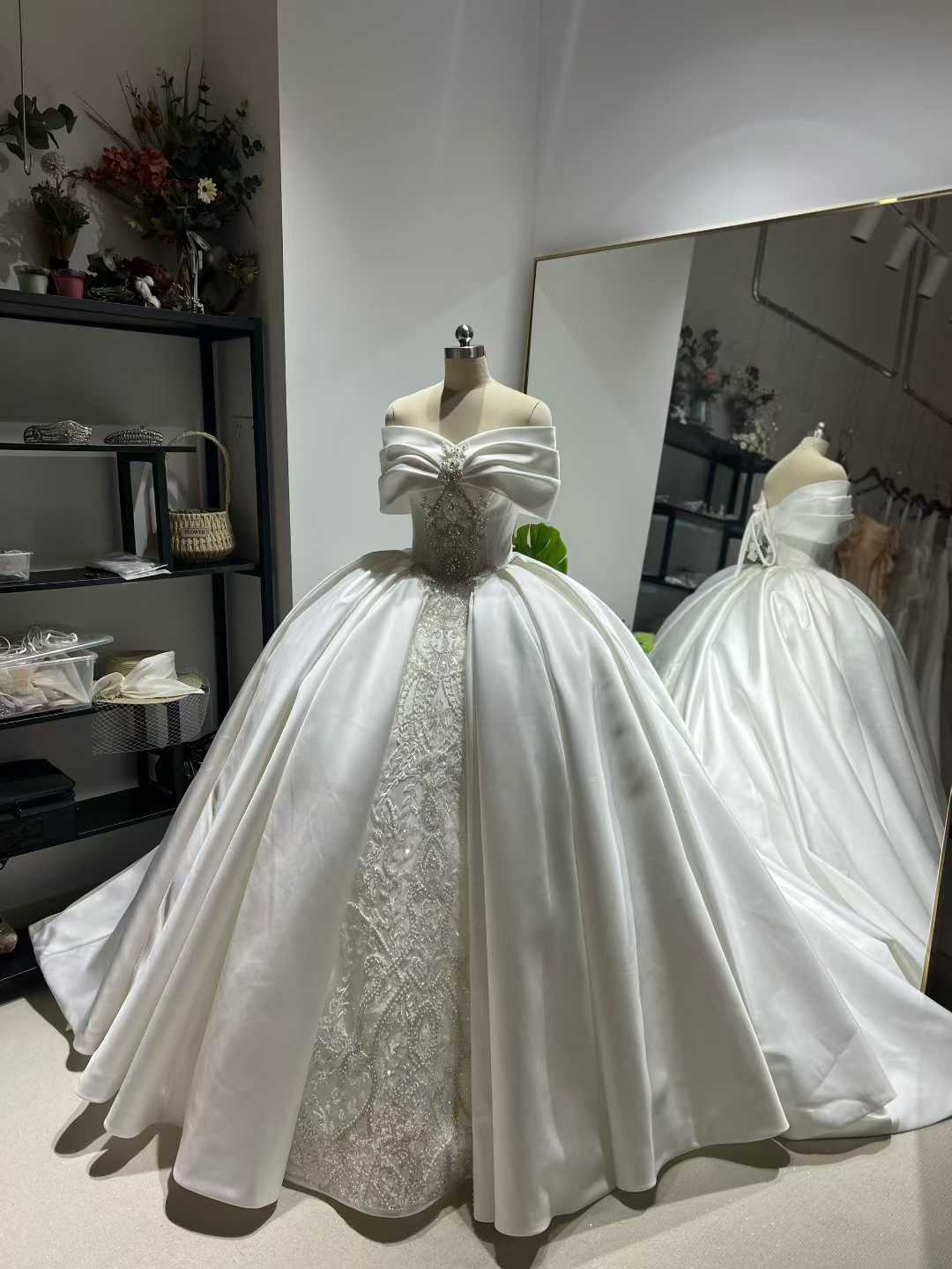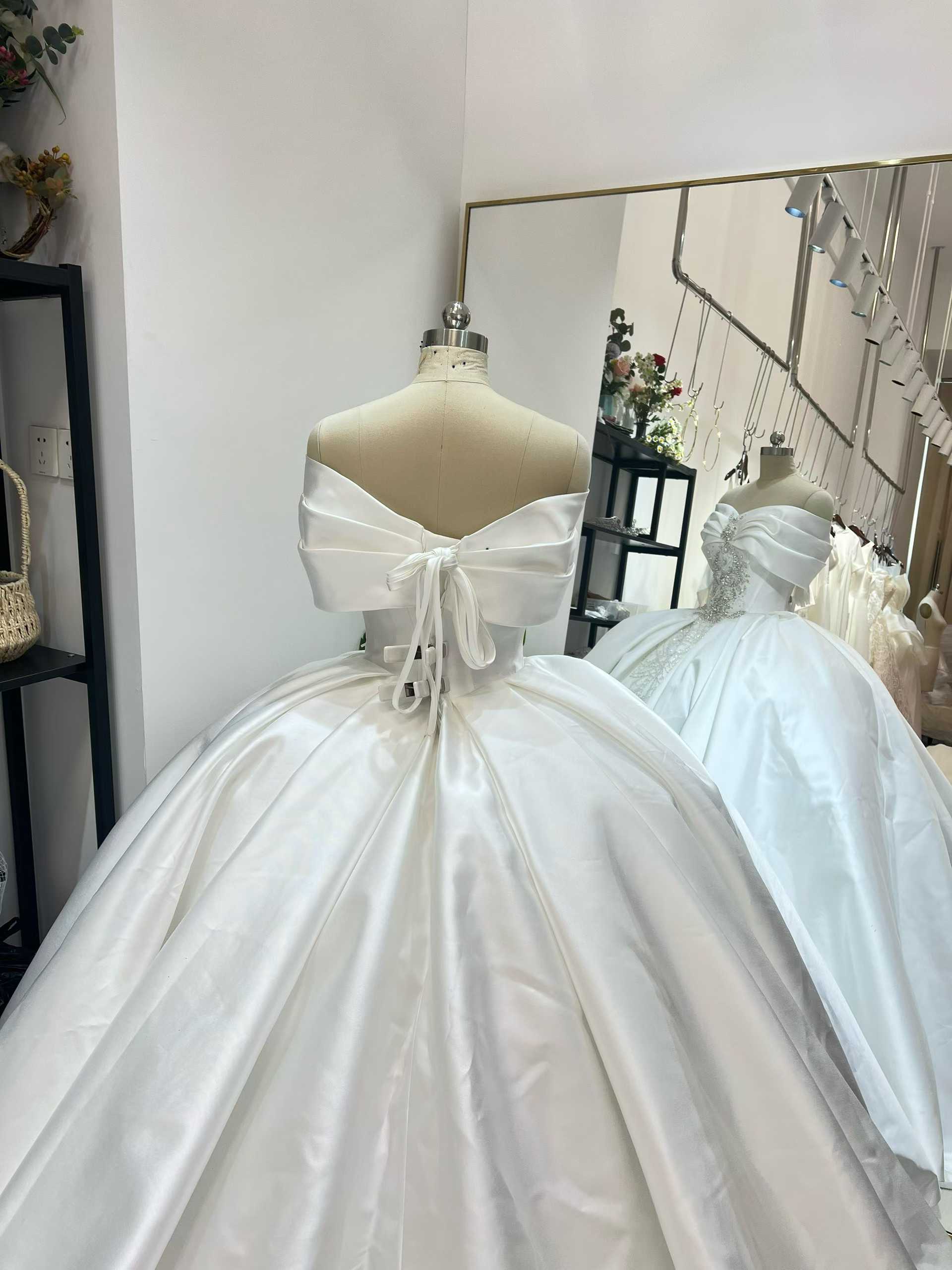 ウェディングドレス オフショルダー 韓国風ドレス フレアスカート ミカドサテン オフホワイト 編み上げ 花嫁