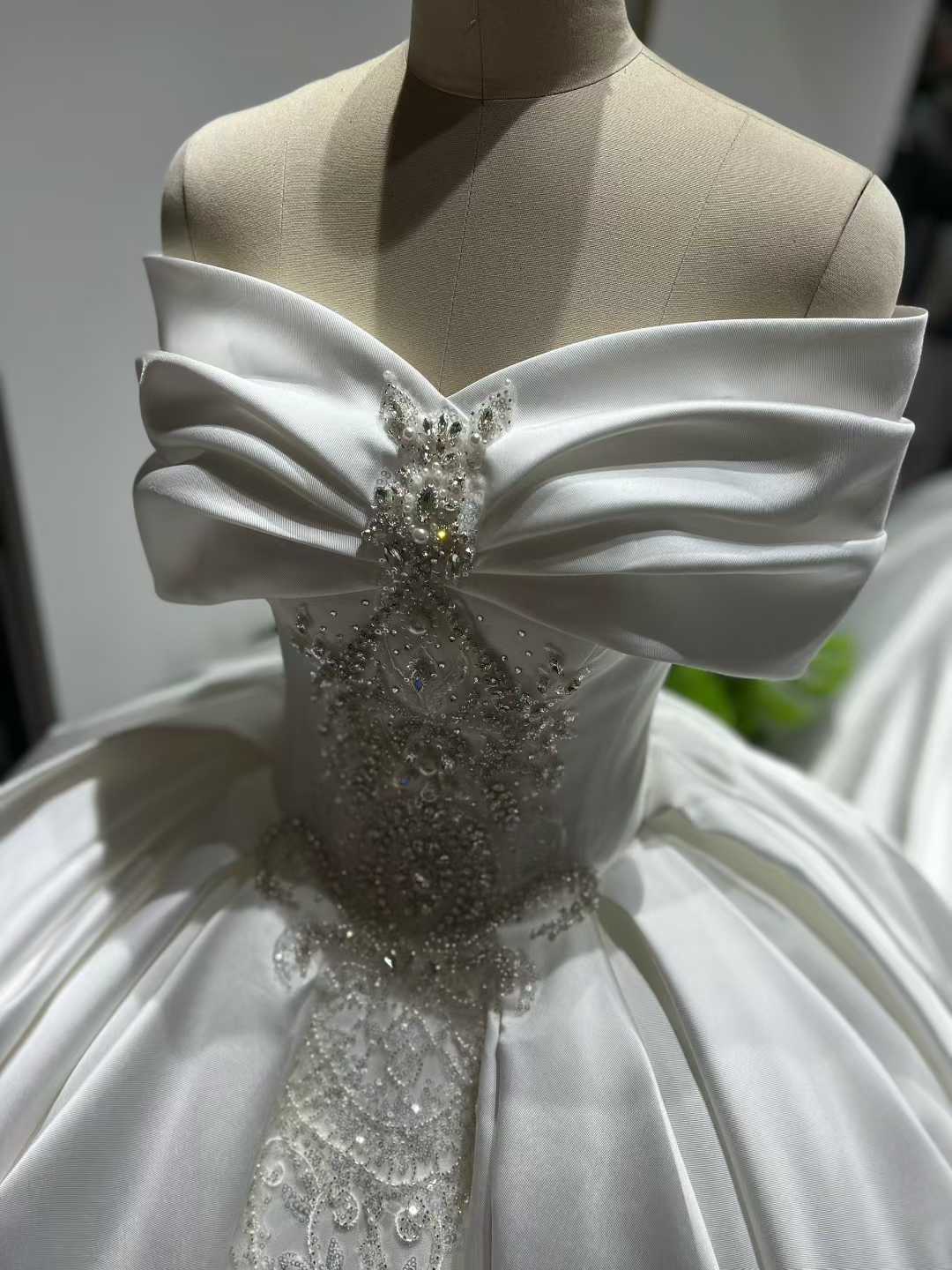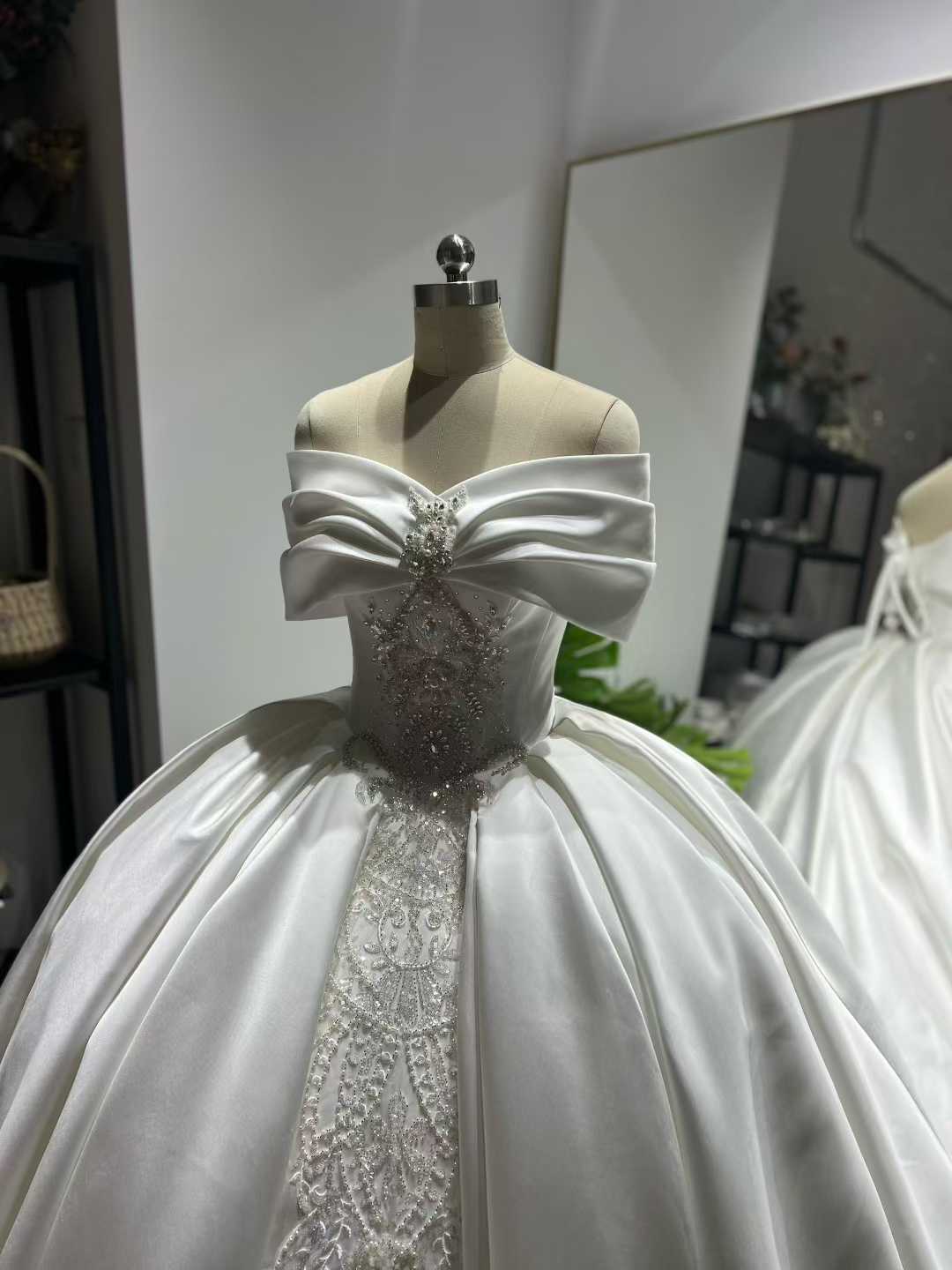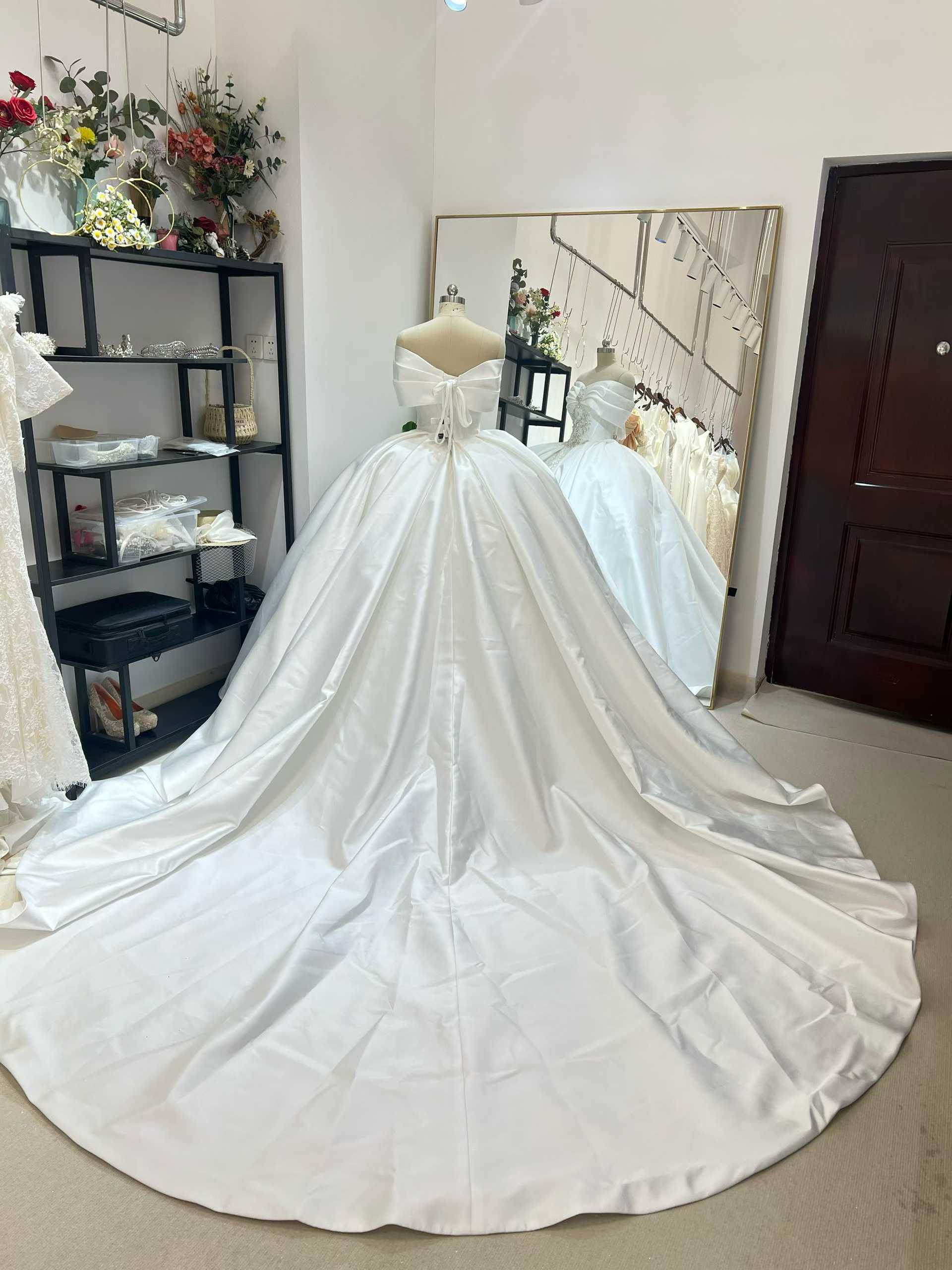 ウェディングドレス オフショルダー 韓国風ドレス フレアスカート ミカドサテン オフホワイト 編み上げ 花嫁