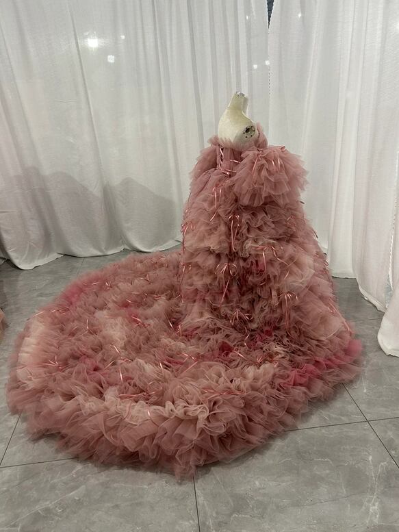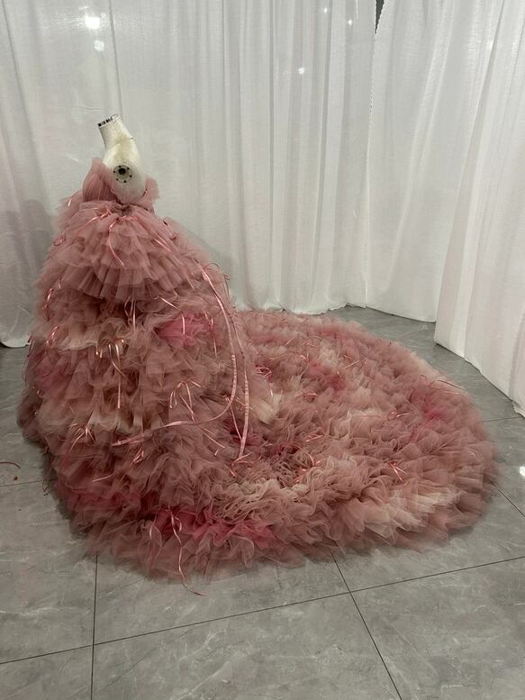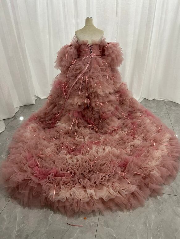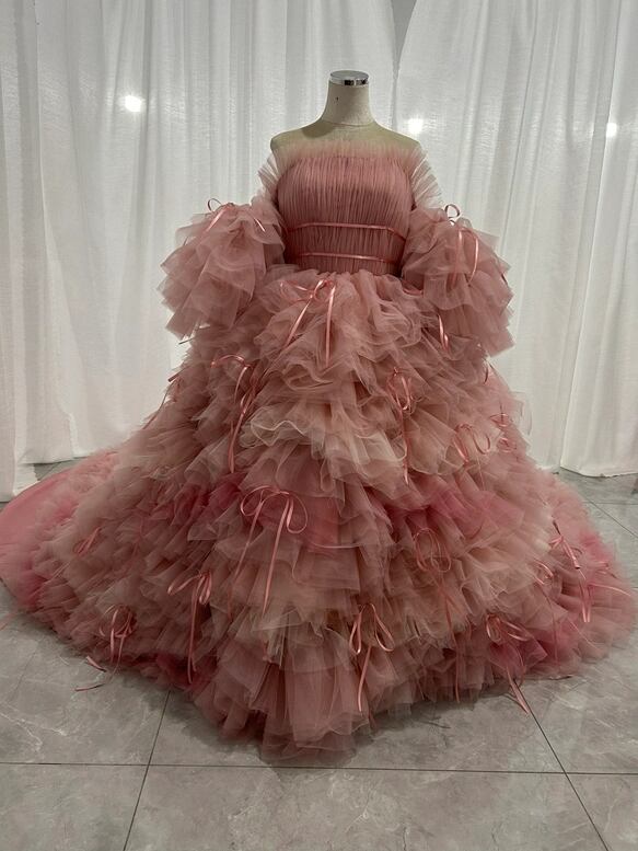 韓国風もこもこ ピンクカラードレス リボン チュールドレス フリルオフショルダー お色直しふわふわ もこもこドレス