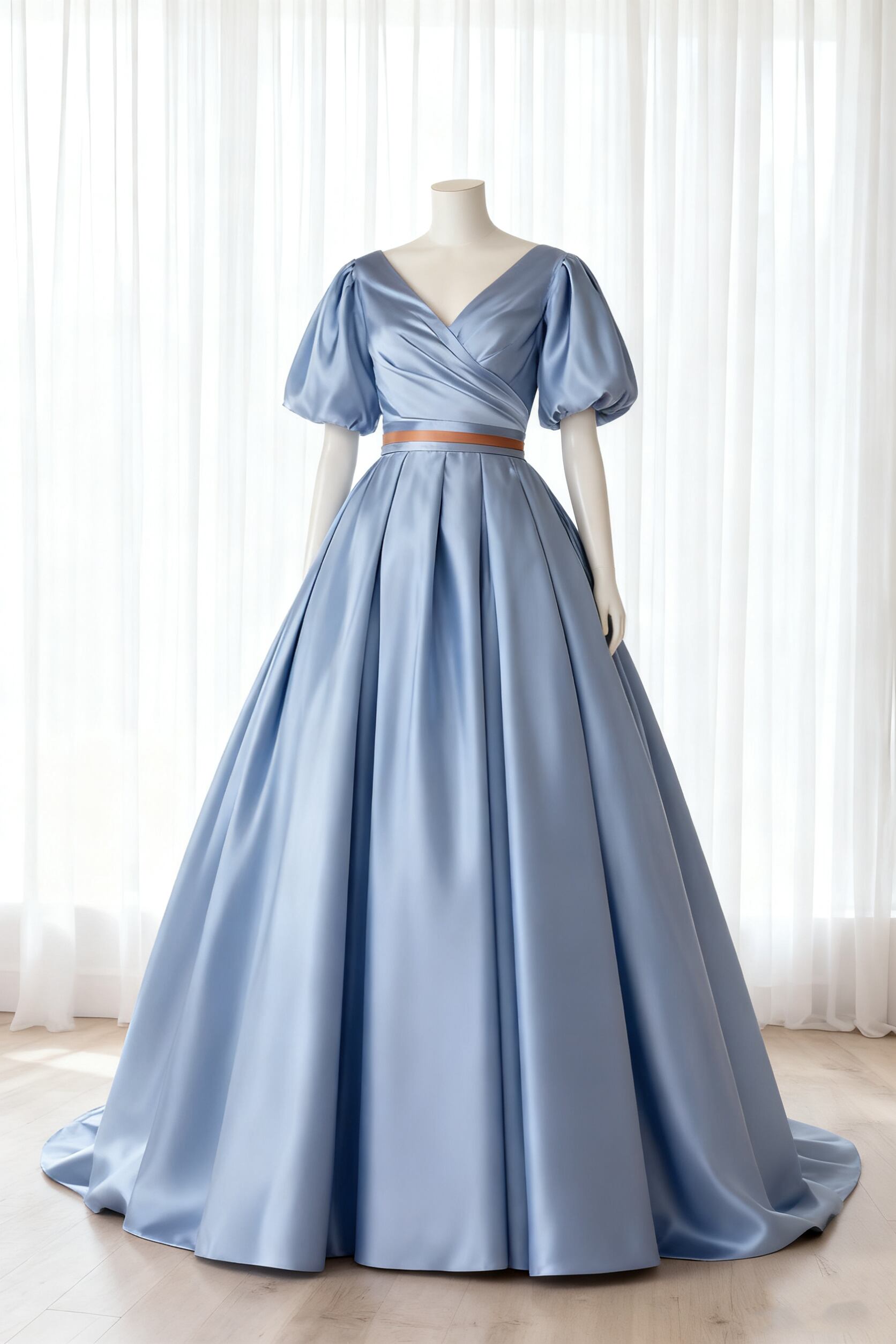 カラードレス パフスリーブドレス Vネックドレス 爽やかで優しいブルー サッシュベルト 光沢サテン 結婚式