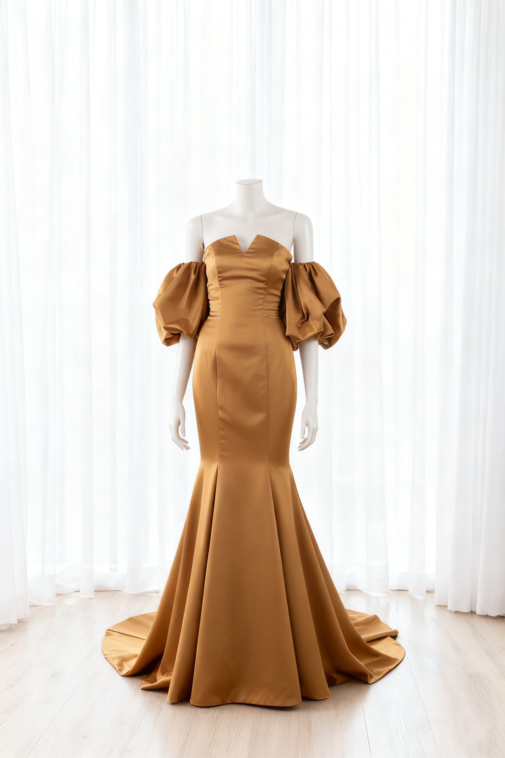 パーティードレス イエロー パフスリーブ 光沢サテン マーメイドライン 優雅なシルエット 細見えシルエット 前撮り