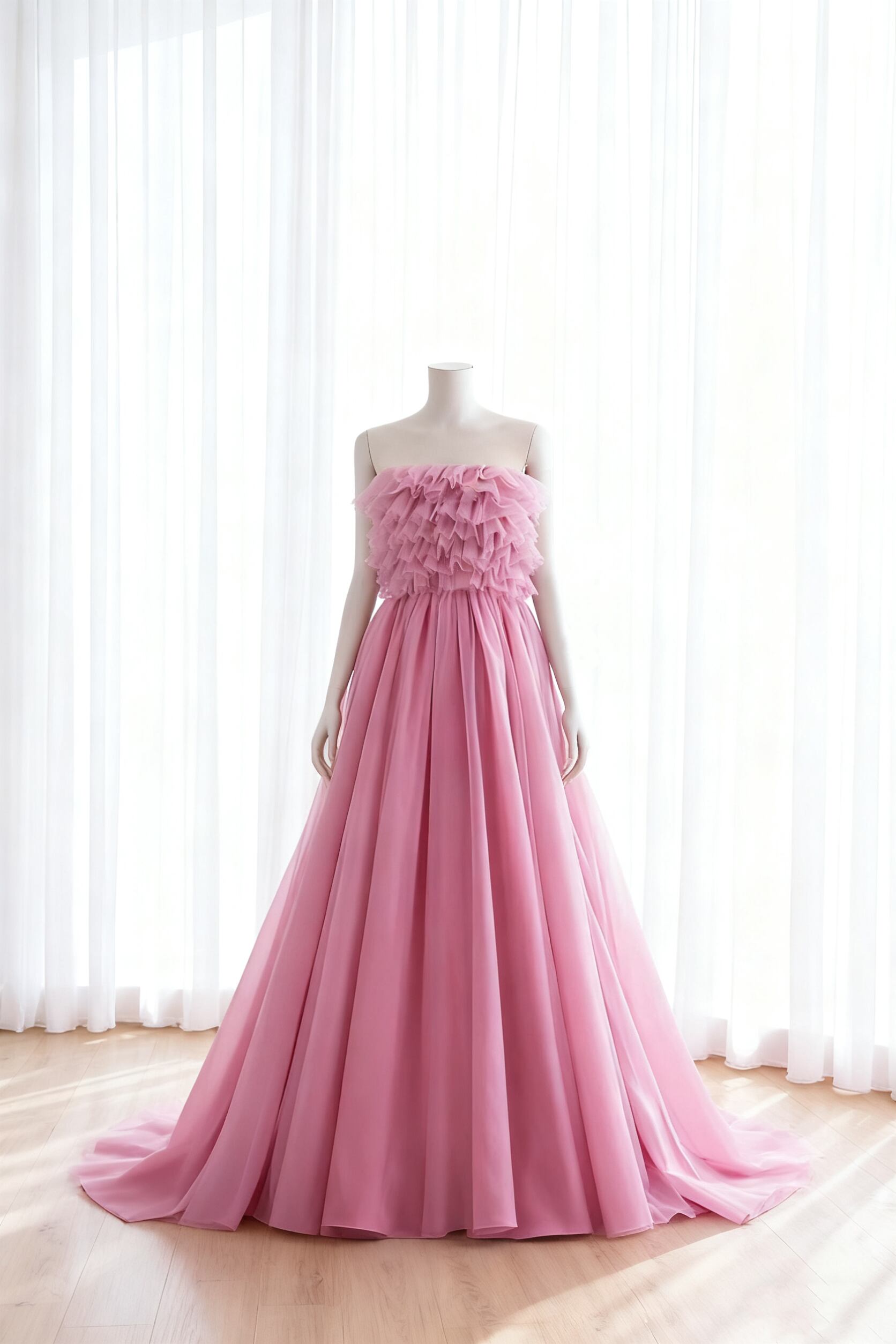 カラードレス ビビッドピンク Aライン プリンセスライン ラッフルフリル チュールドレス 前撮り 二次会