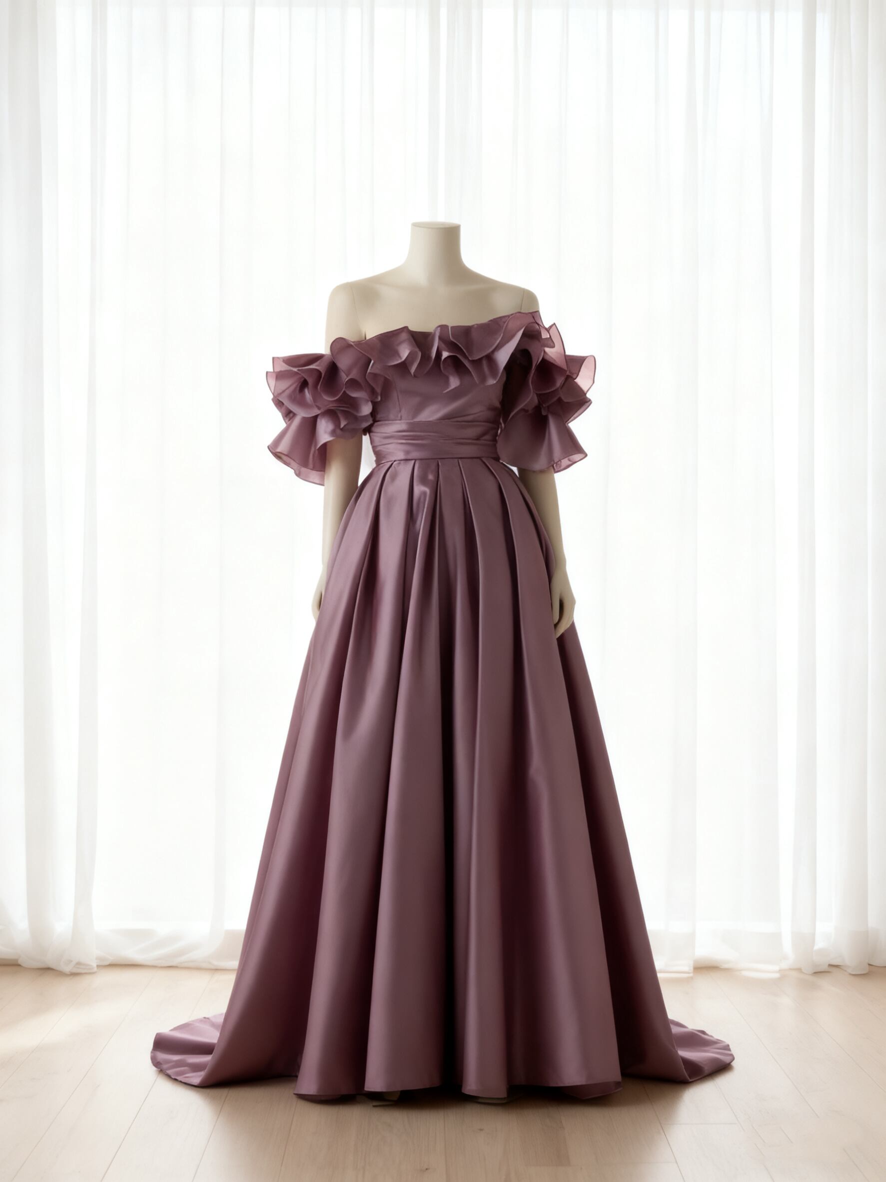 パーティードレス オフショルダー パープル ラッフルフリル 光沢サテン スリット 前撮り 二次会 短トレーン