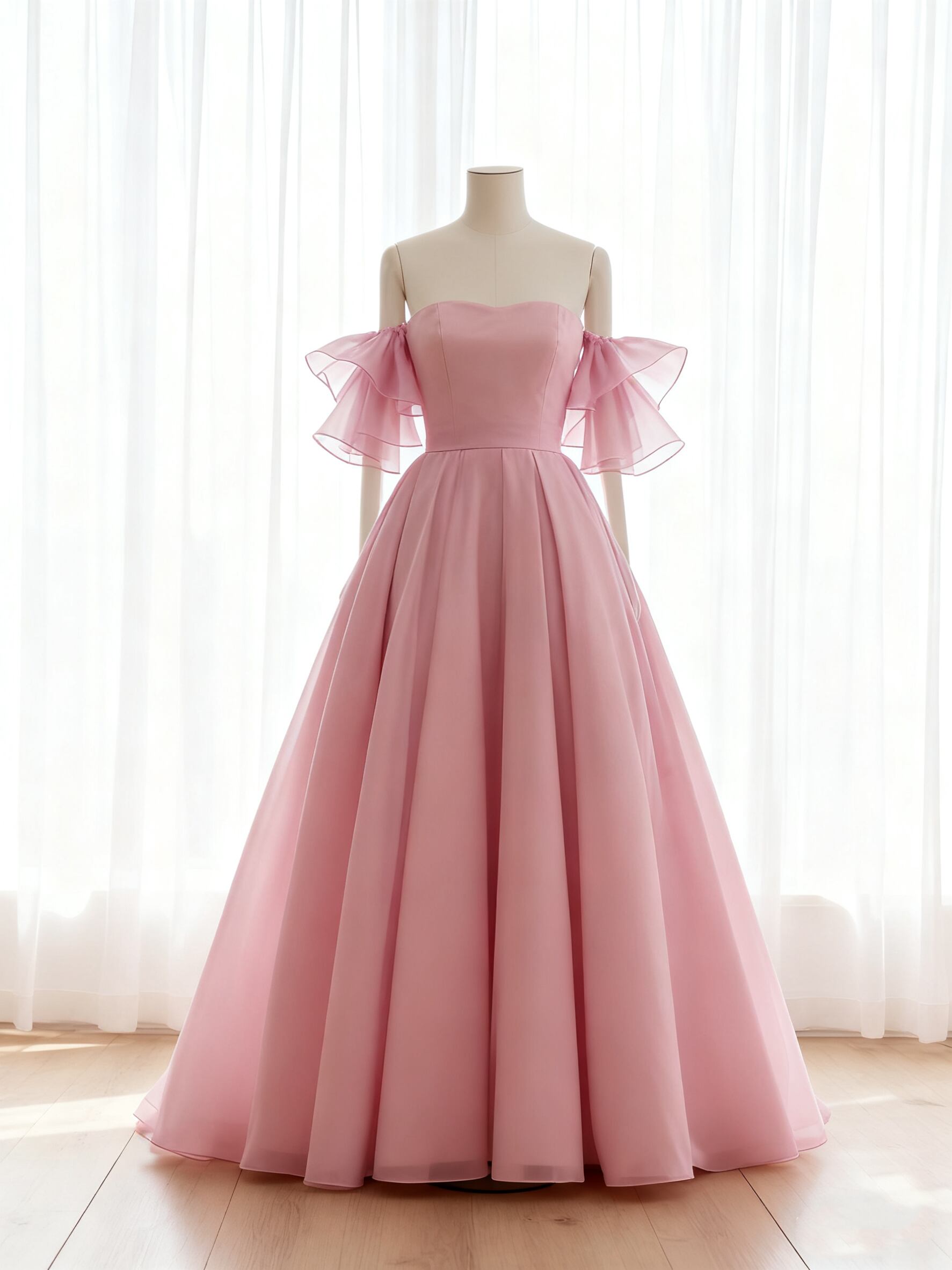 カラードレス ピンク フリル袖 床付く 楊柳オーガンジー 前撮り スレンダーライン 取り外し可能な付け袖