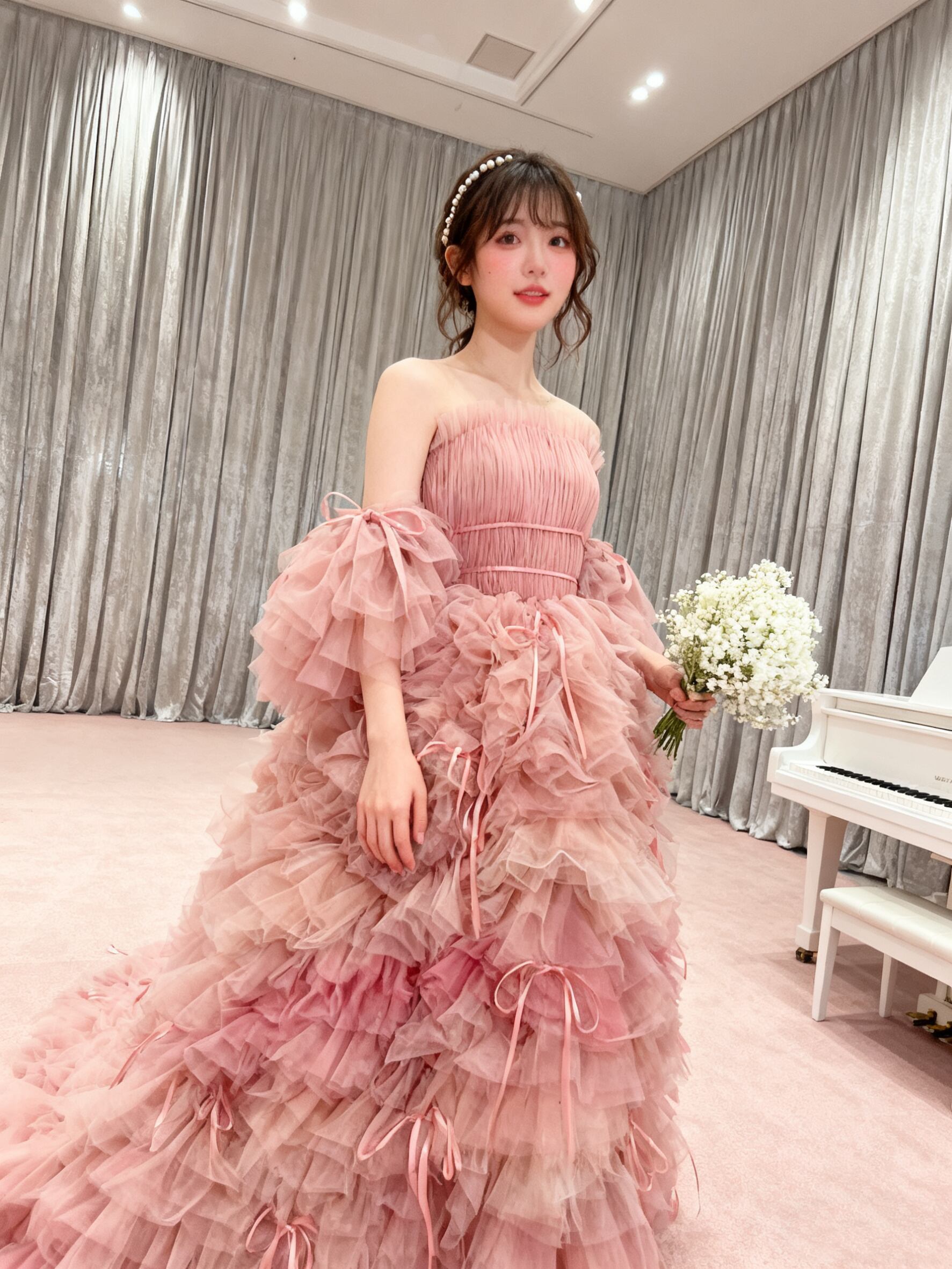 韓国風もこもこ ピンクカラードレス リボン チュールドレス フリルオフショルダー お色直しふわふわ もこもこドレス