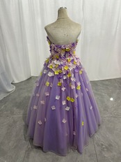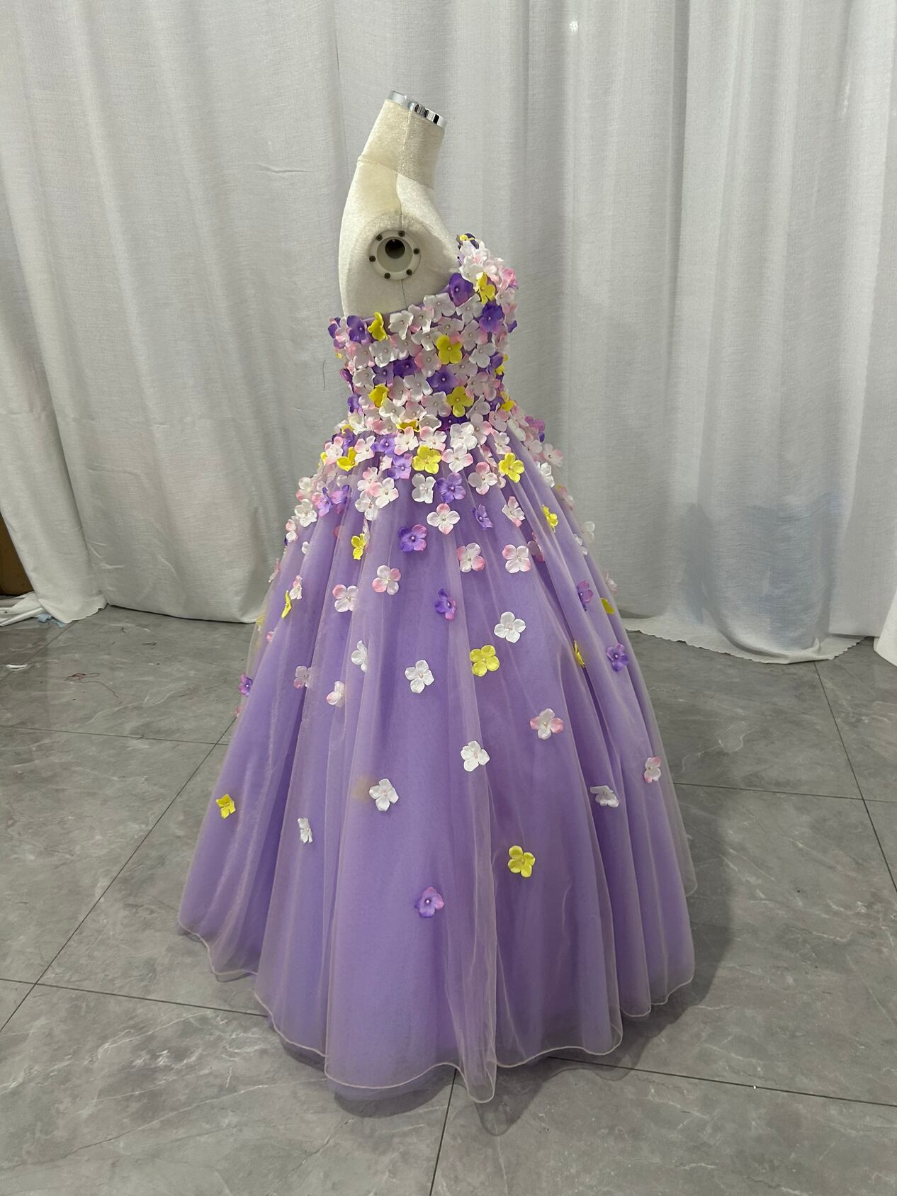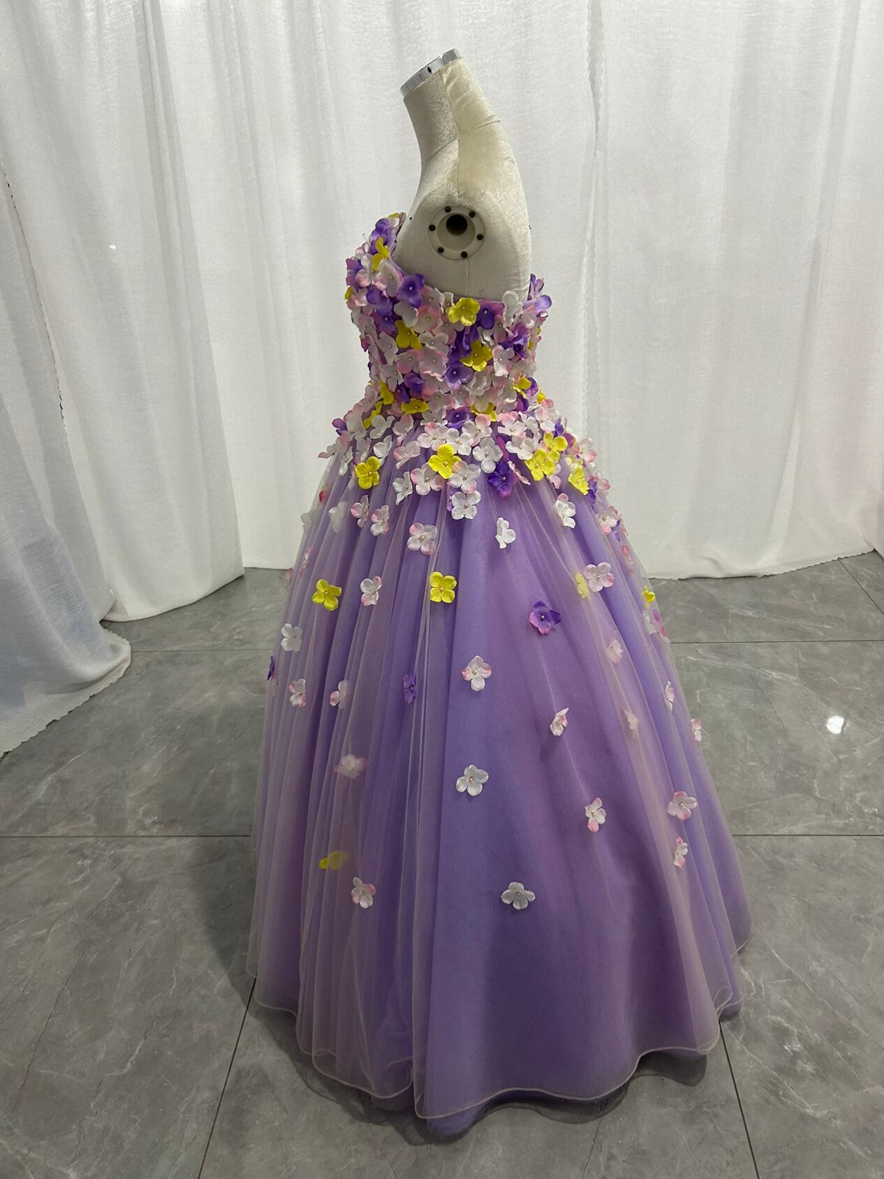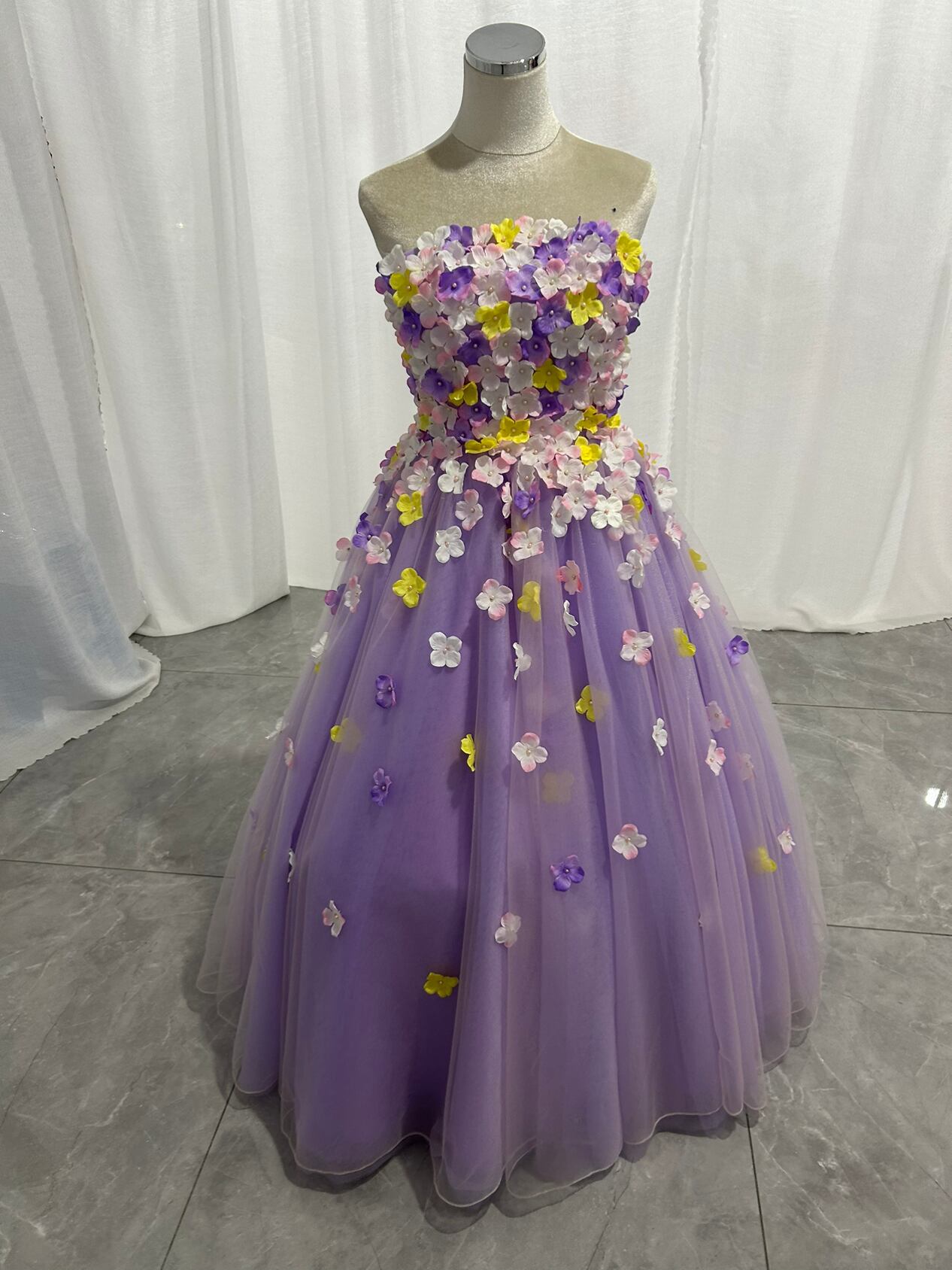 高品質!カラードレ パープル ベアトップ 挙式 プリンセスライン 花モチーフ ソフトチュール 華やかなトレーン 憧れのドレス