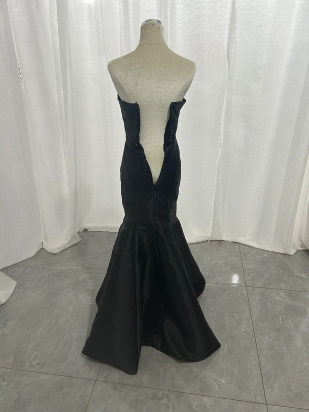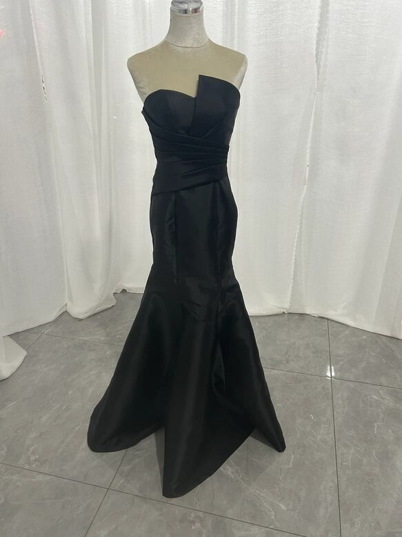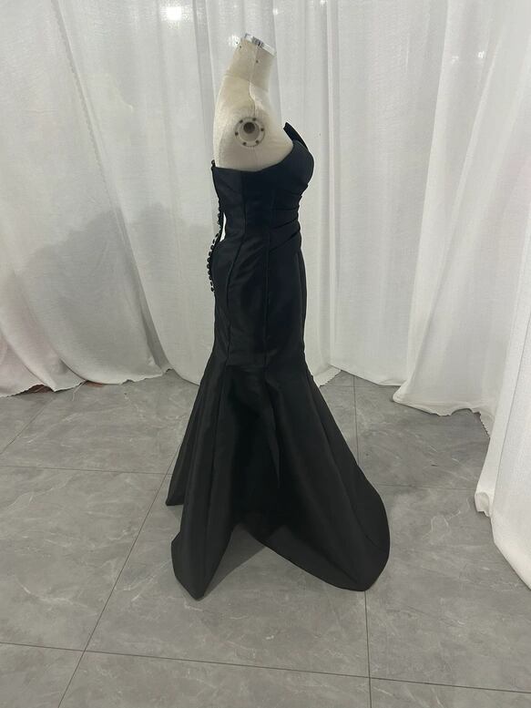 可愛い 花嫁 前撮り パーティードレス ブラック 二次会 くるみボタン ベアトップ マーメイドライン ロング