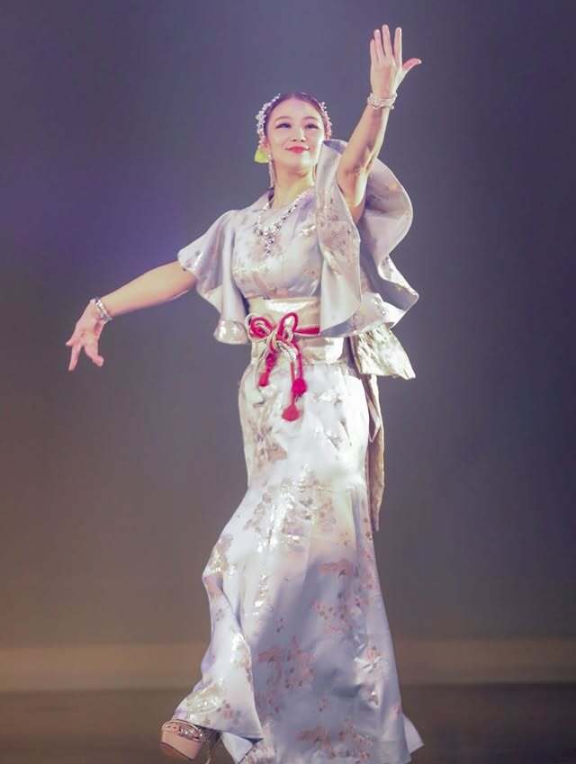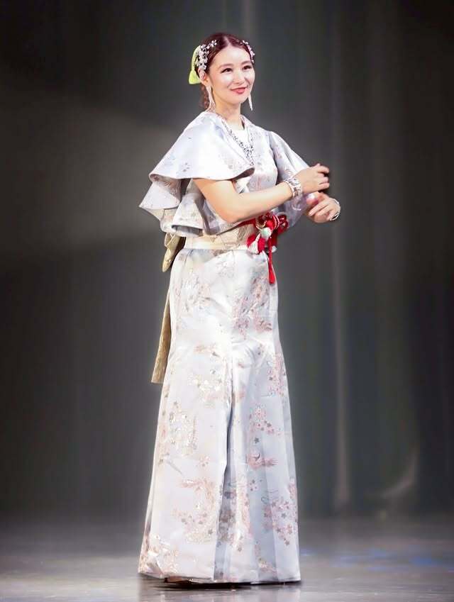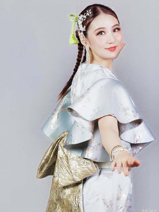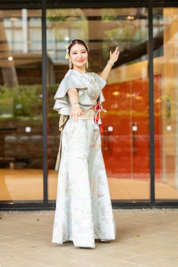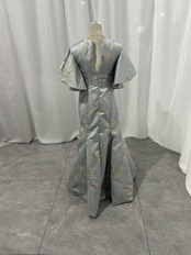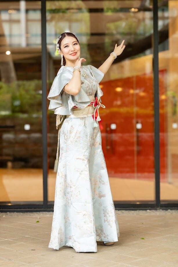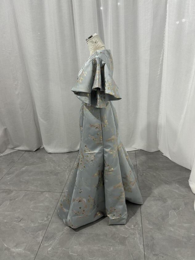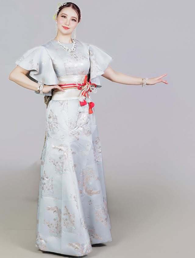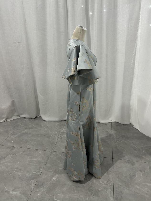 実例写真!着物ドレス、和風ドレス 薄青 フリル袖 ソフトマーメイドライン 床付く ラウンドネック