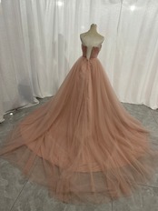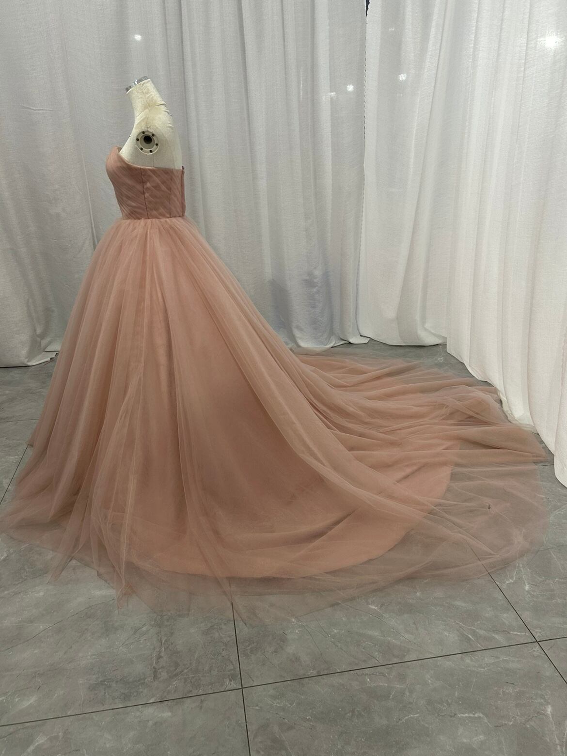カラードレス スレンダーライン ピンク ベアトップ サッシュベルト ソフトチュール Aライン 前撮り 花嫁