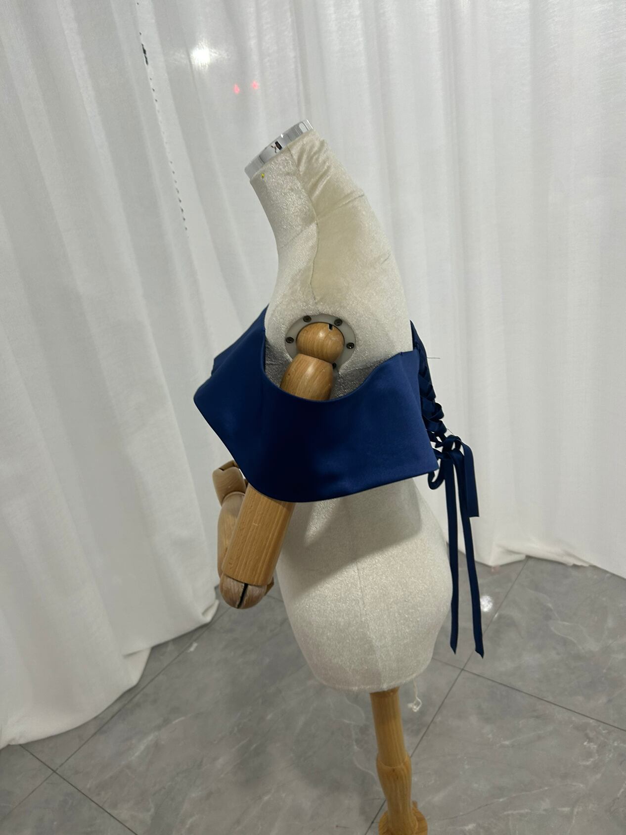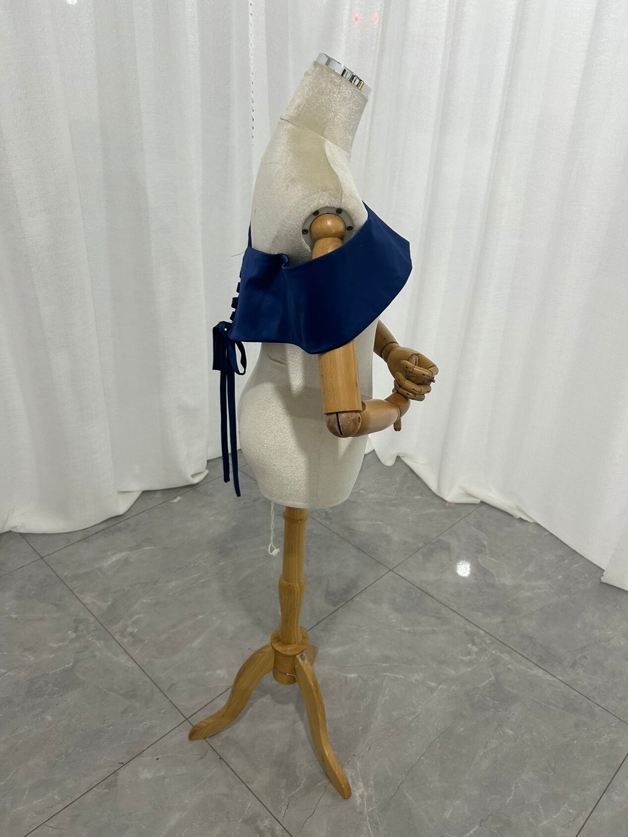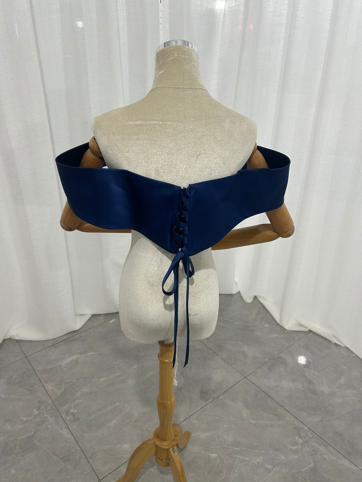 取り外し可能なオフショルダー 編み上げ 光沢サテン ネイビー カラードレス