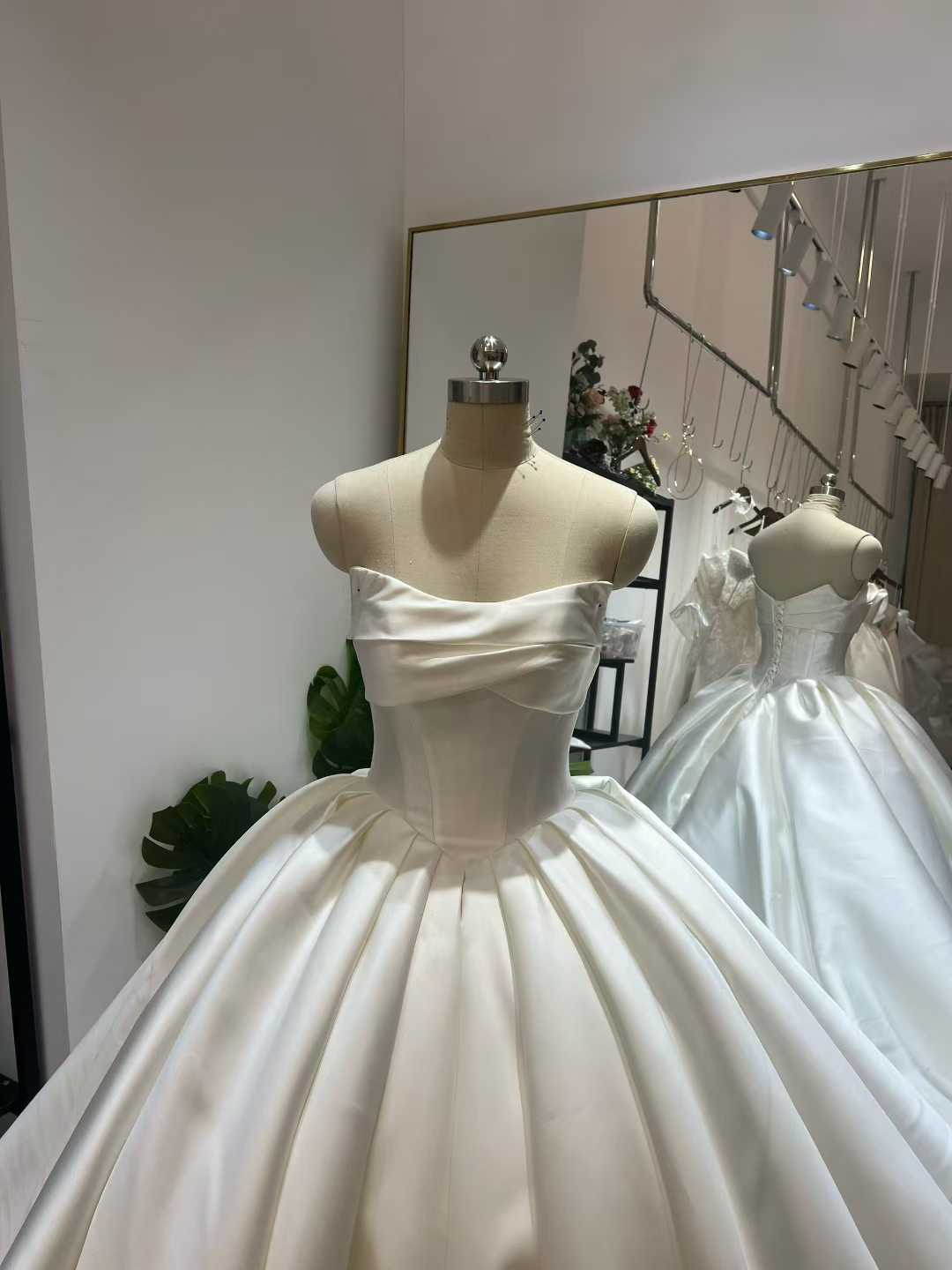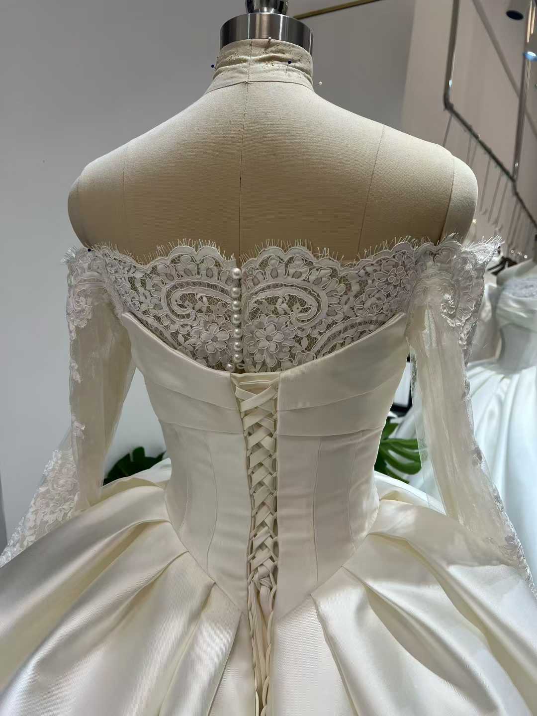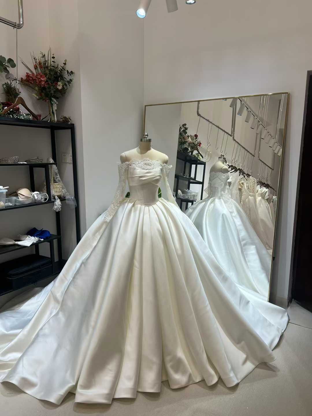 ウエディングドレス オフショルダー ボレロ くるみボタン ビスチェドレス ミカドサテン ロングトレーン