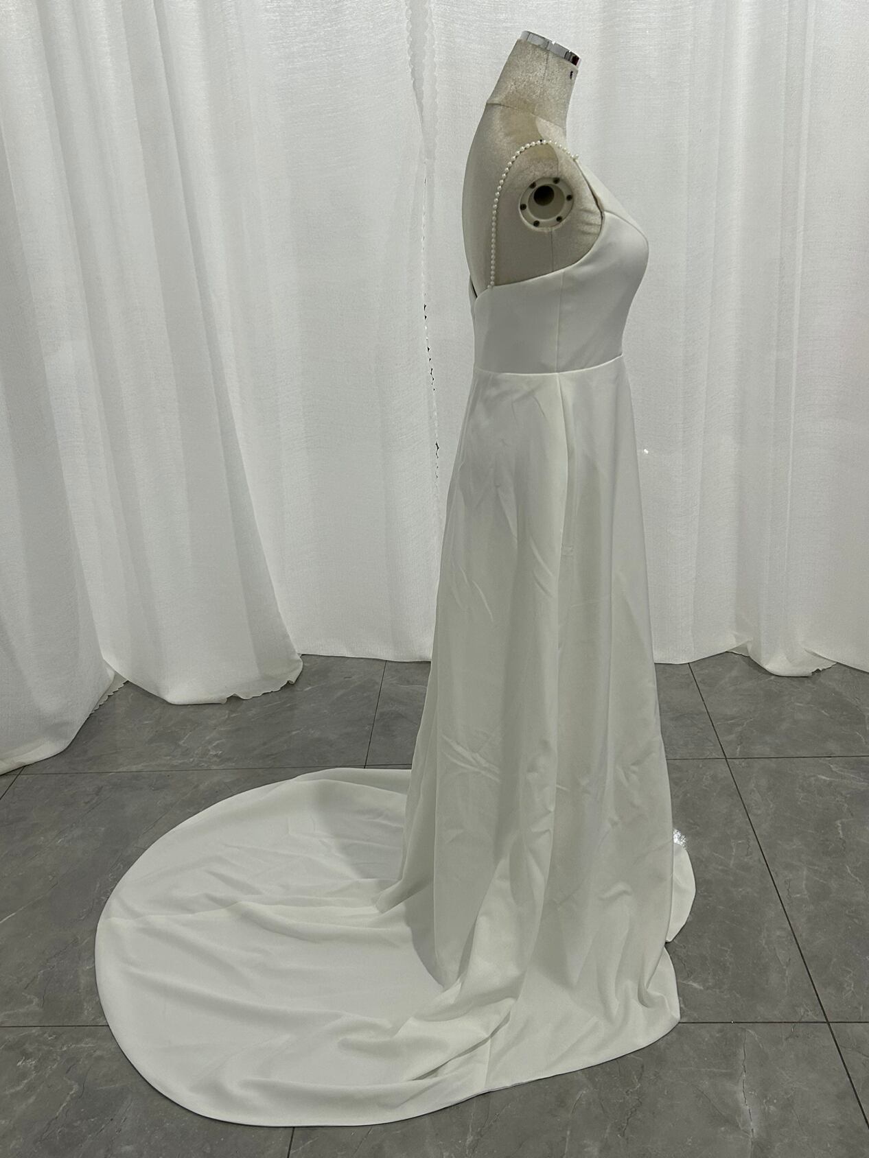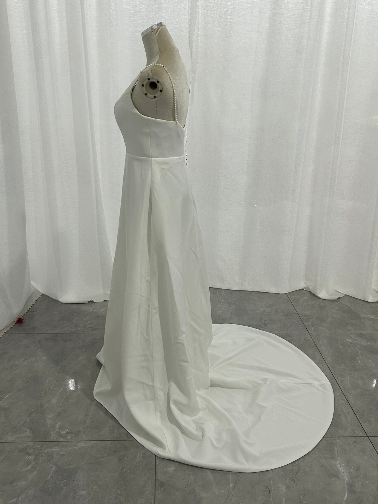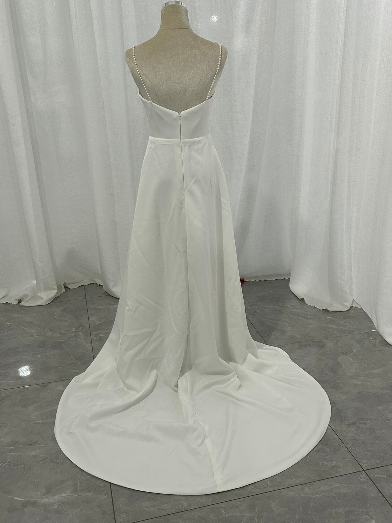 シンプルスレンダーウェディングドレス 柔らかいクレープ生地 ブライダル トレーン パール紐 キャミソール