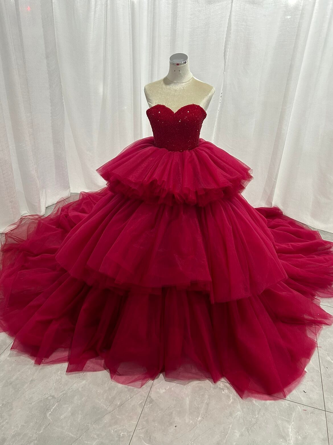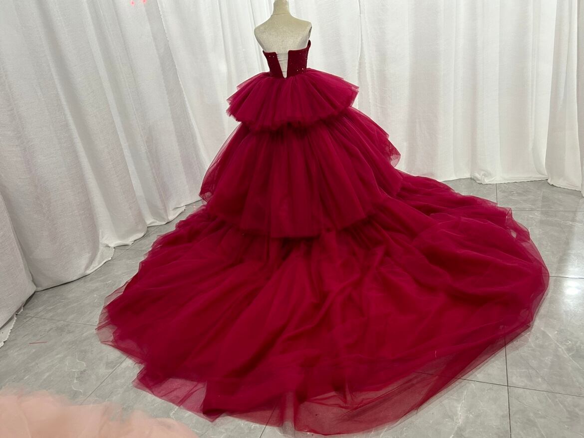 カラードレス ボルドー色 ベアトップ ハンドメイド ティアードのドレス 結婚式 抜群におしゃれ度が際立つ