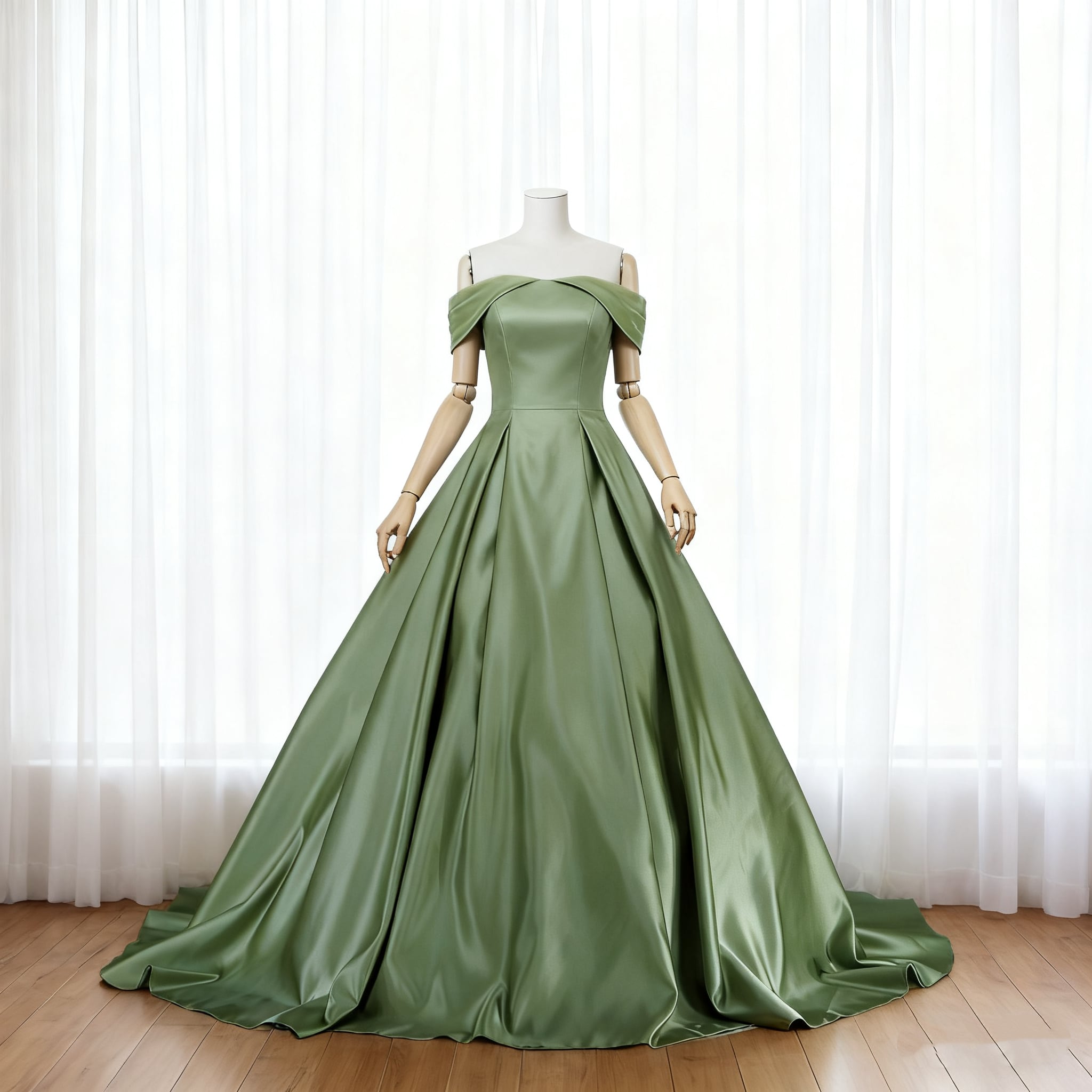 カラードレス グリーン オフショルダー 光沢サテン 音楽会 エレガント アンティーク色