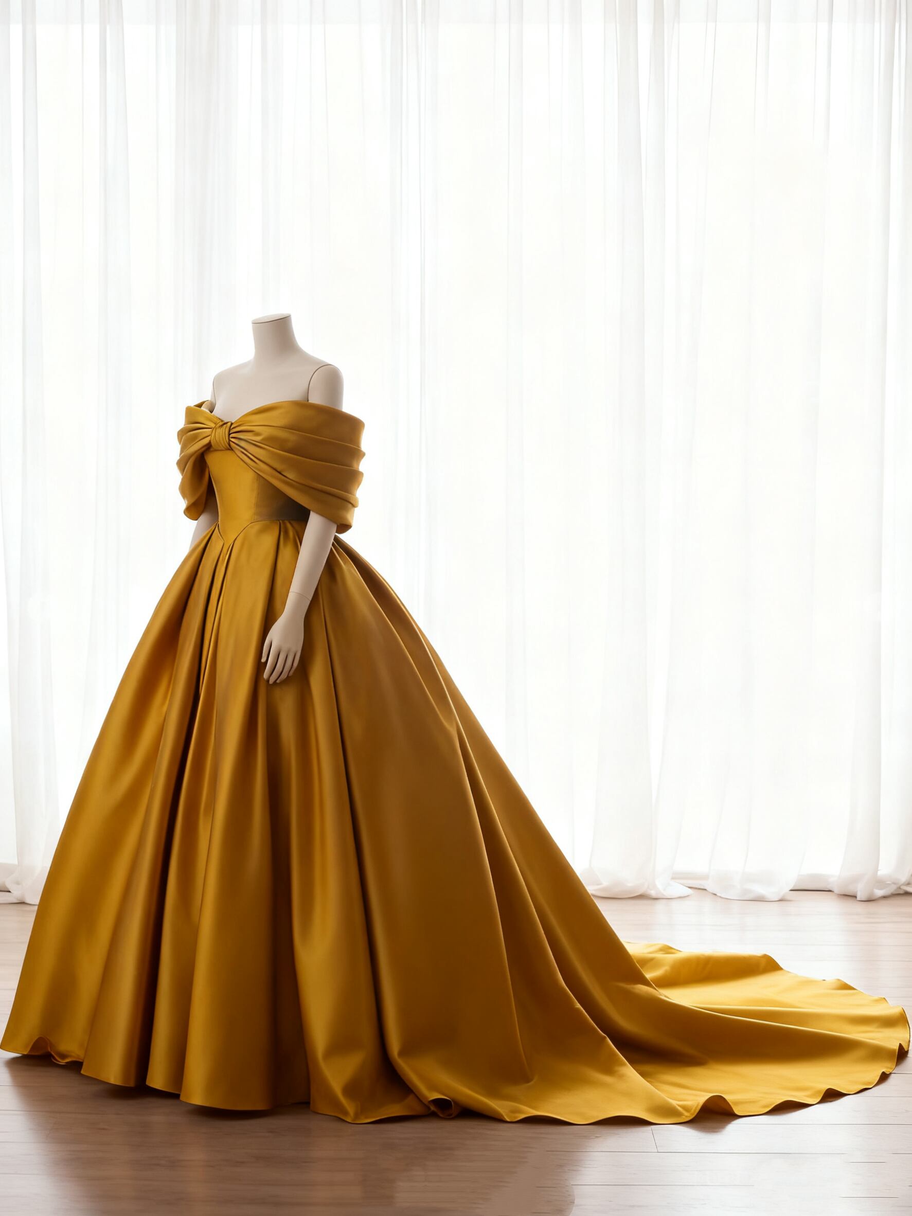カラードレス イエロー オフショルダー 光沢サテン ハンドドレープ 結婚式/披露宴 フレアスカート